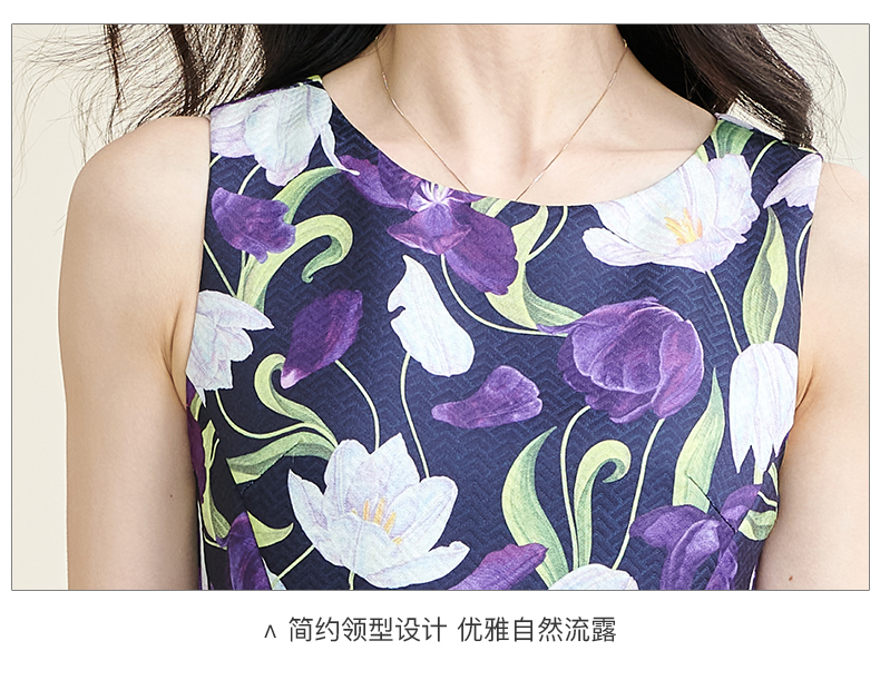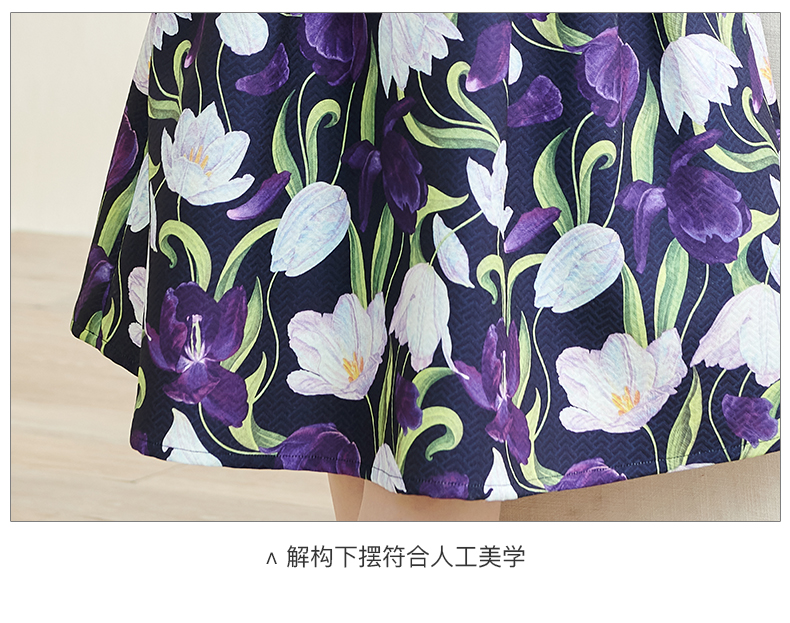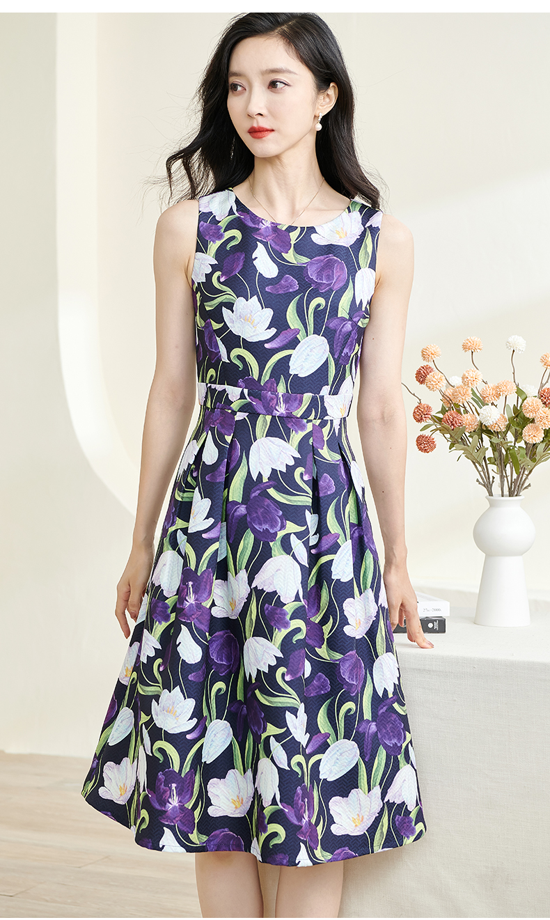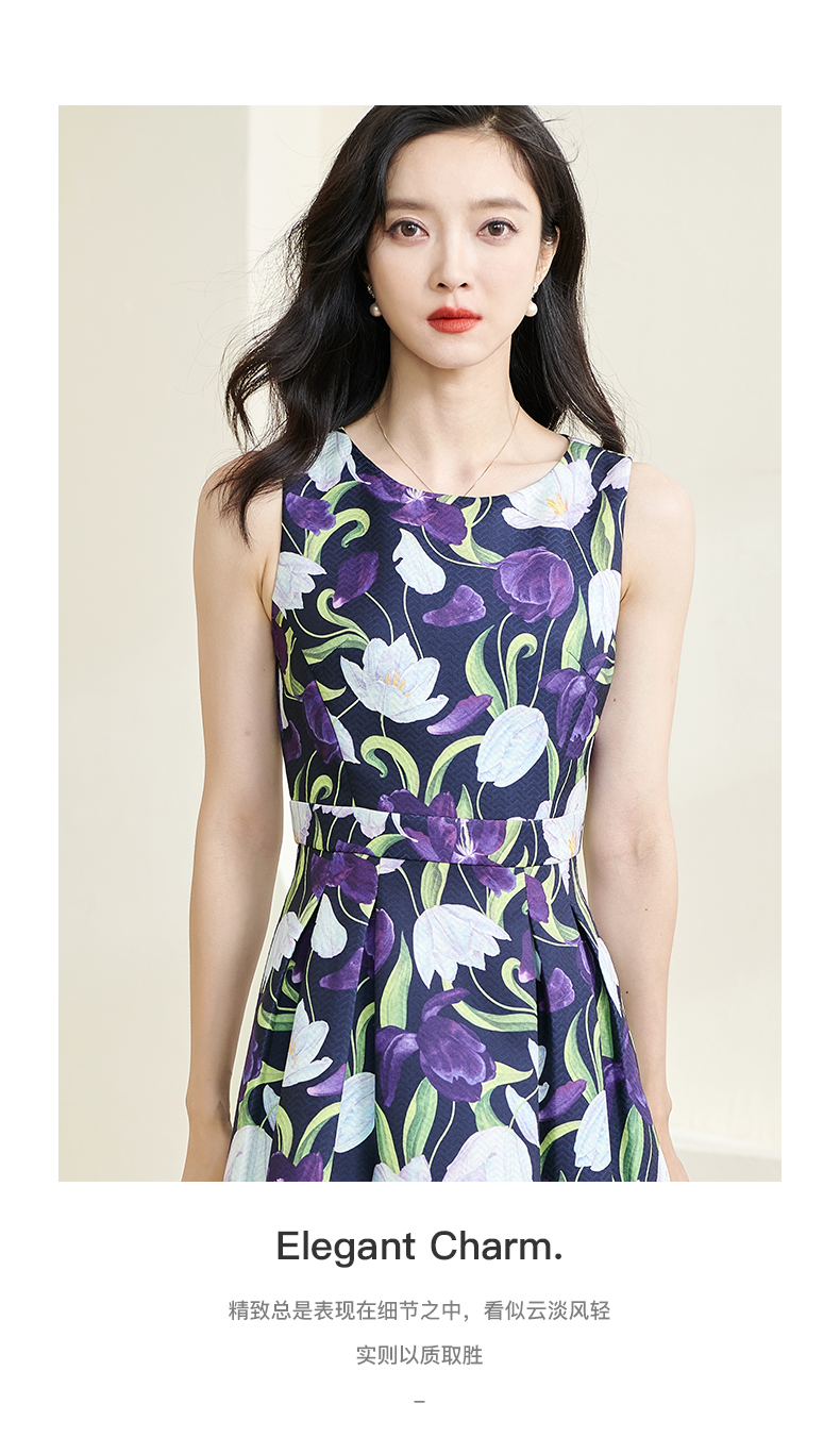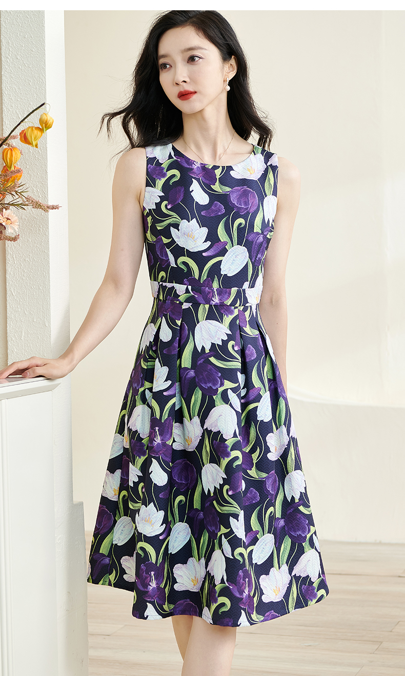 剩S 米思阳2024秋季新款优雅紫色印花圆领赫本裙修身显瘦大摆裙子3060