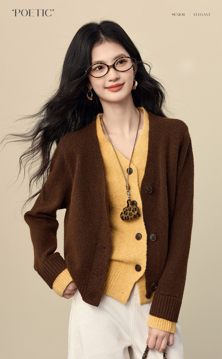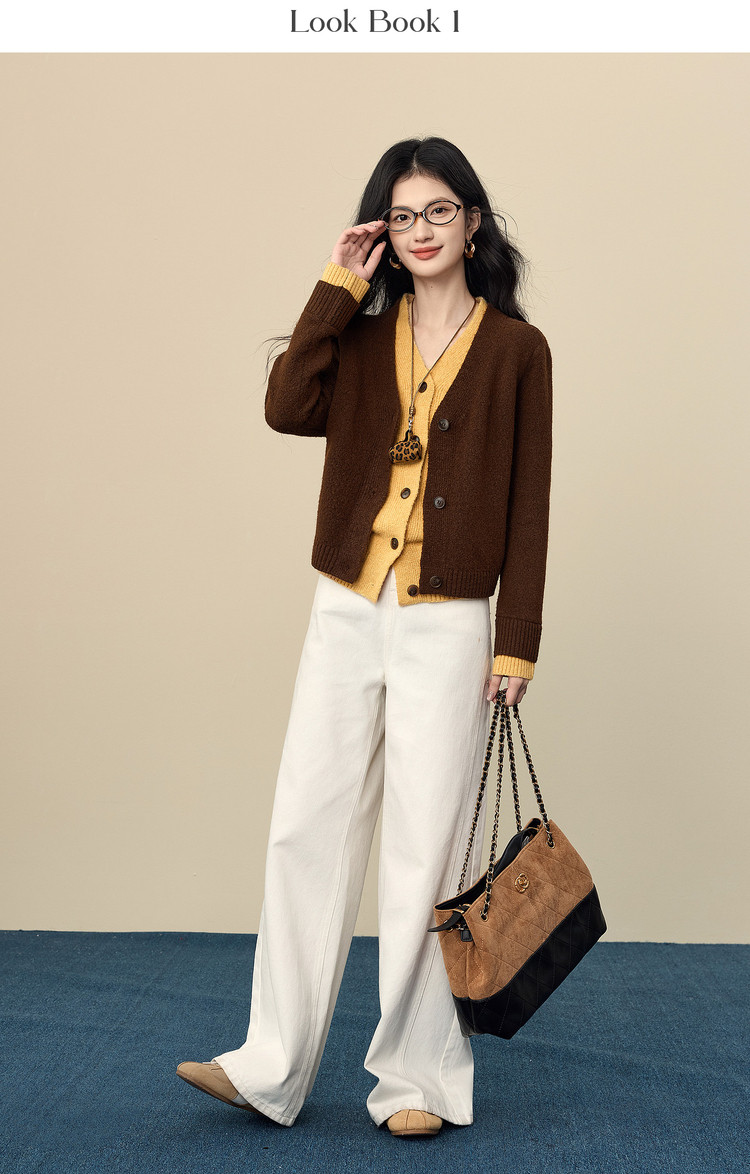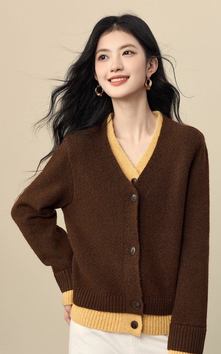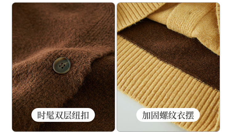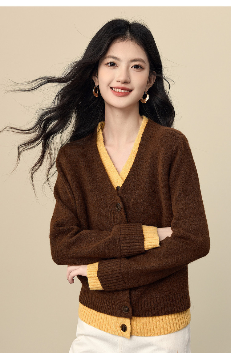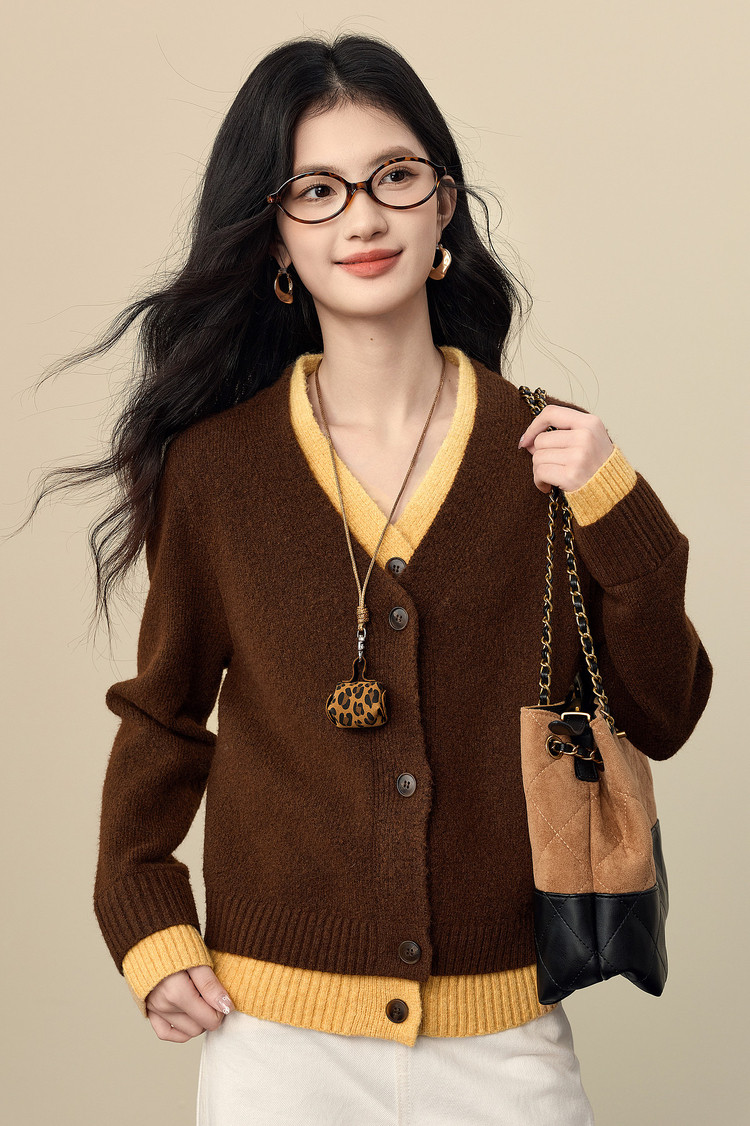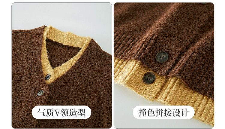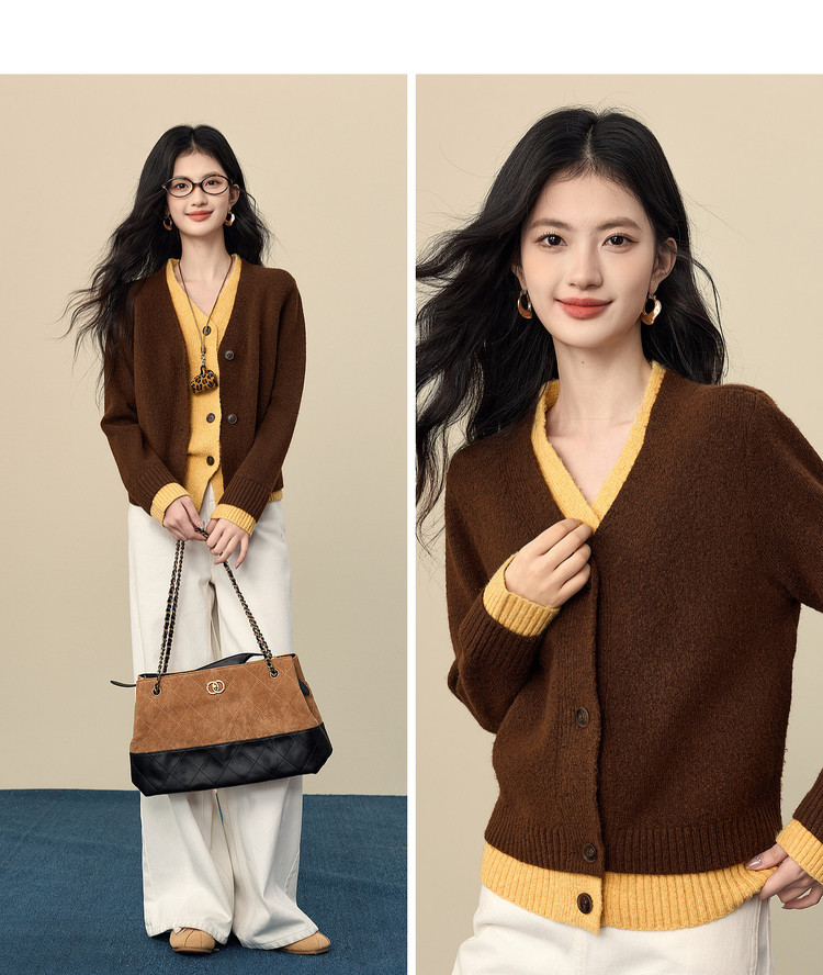 【年货节】世界可露丽风撞色V领拼接假两件针织毛衣开衫女2025年秋冬新款