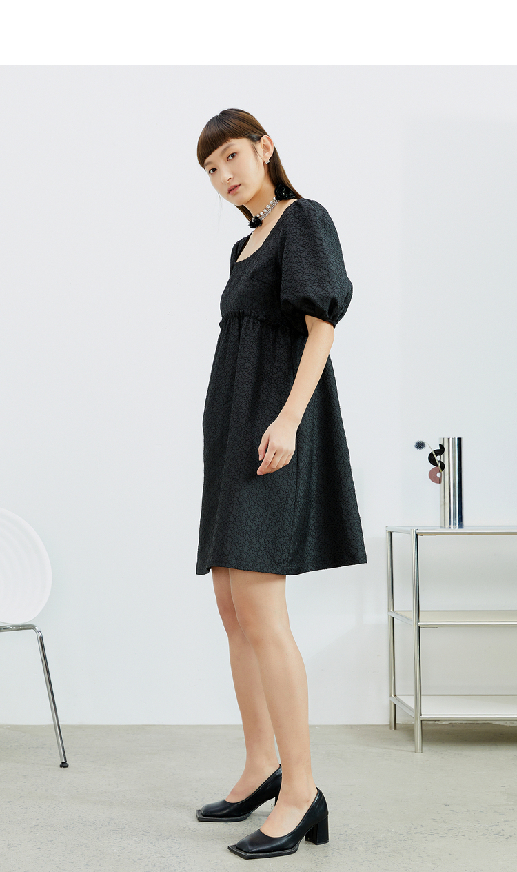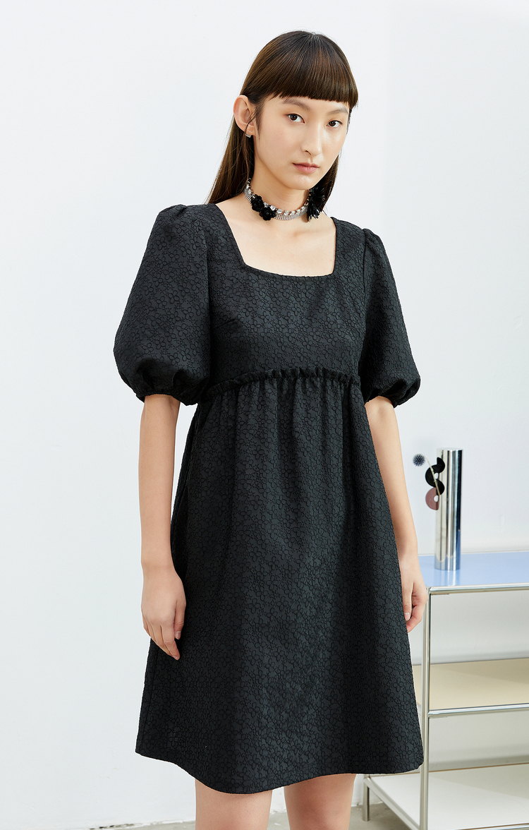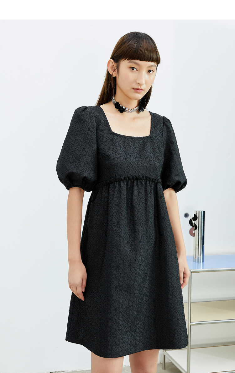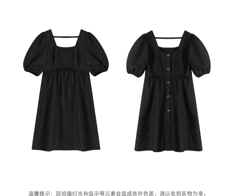 NEELLY纳俪法式复古方领娃娃裙中长款连衣裙女泡泡袖高腰小黑裙潮N22032Y01164