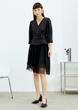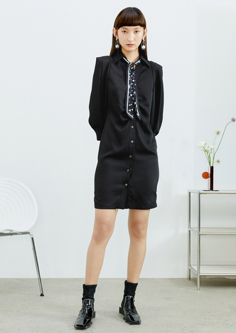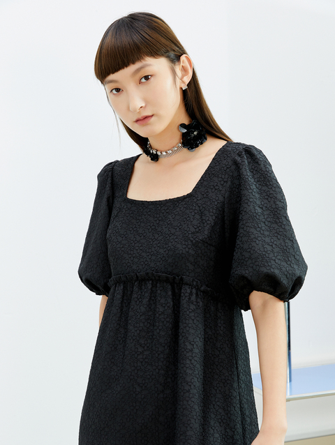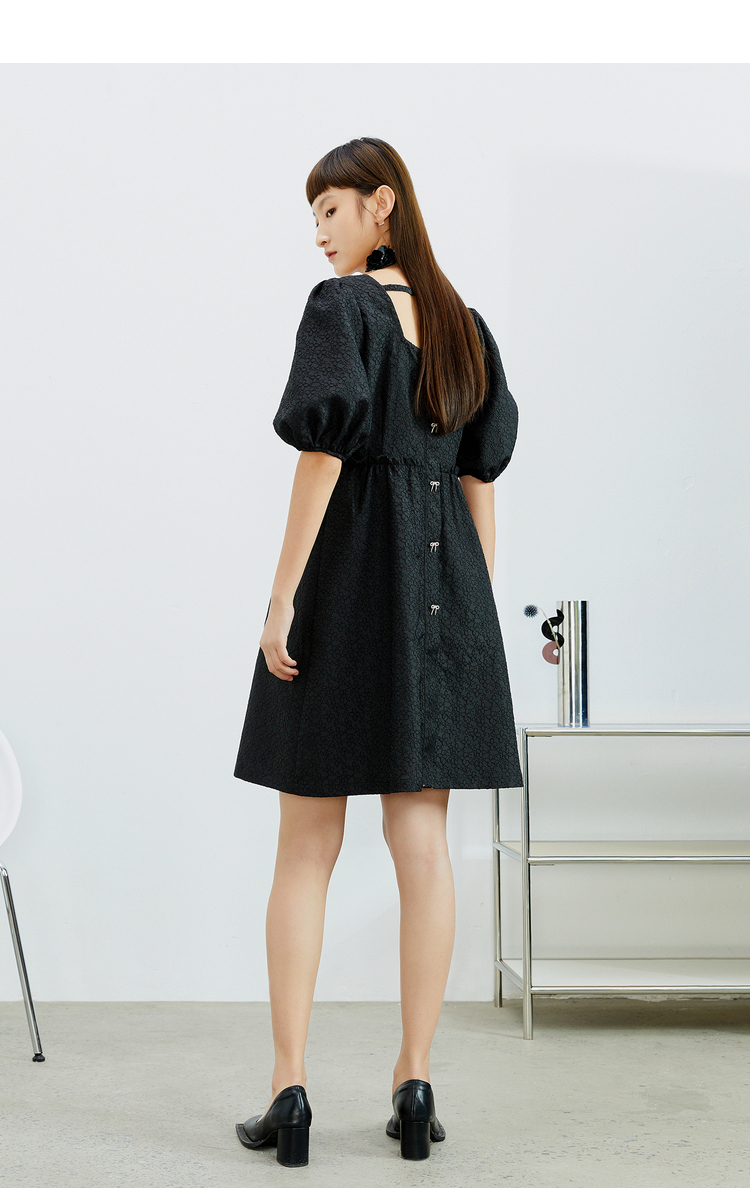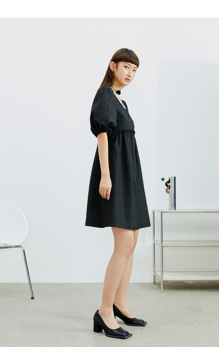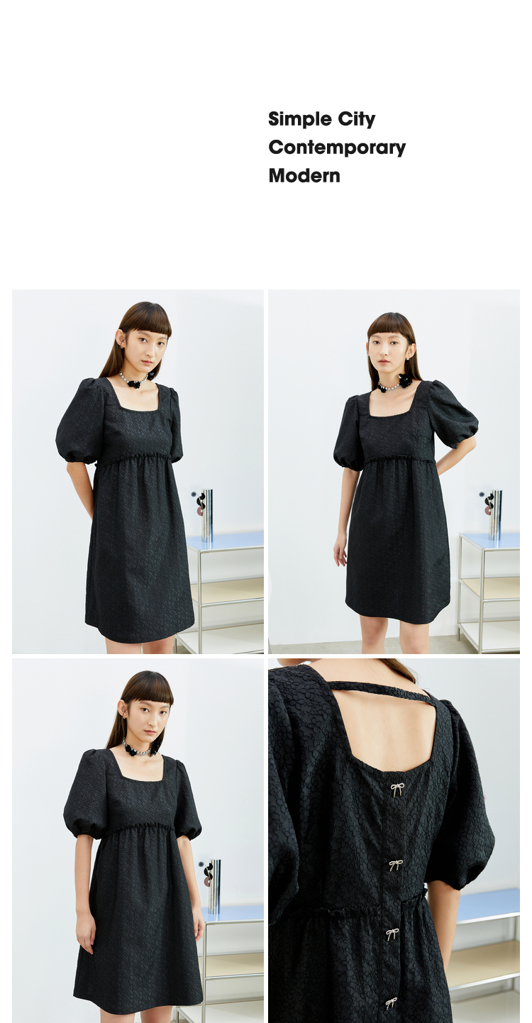 NEELLY纳俪法式复古方领娃娃裙中长款连衣裙女泡泡袖高腰小黑裙潮N22032Y01164