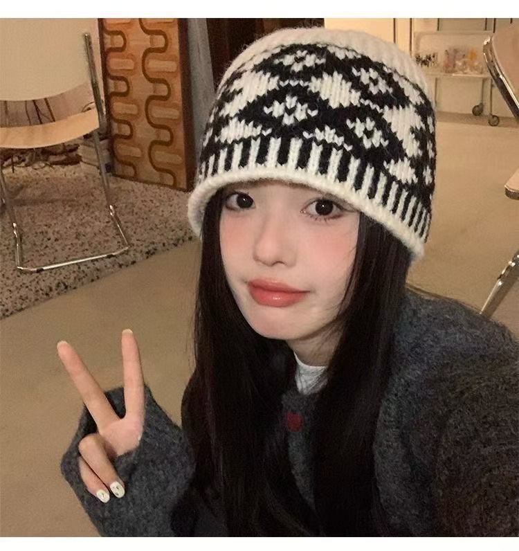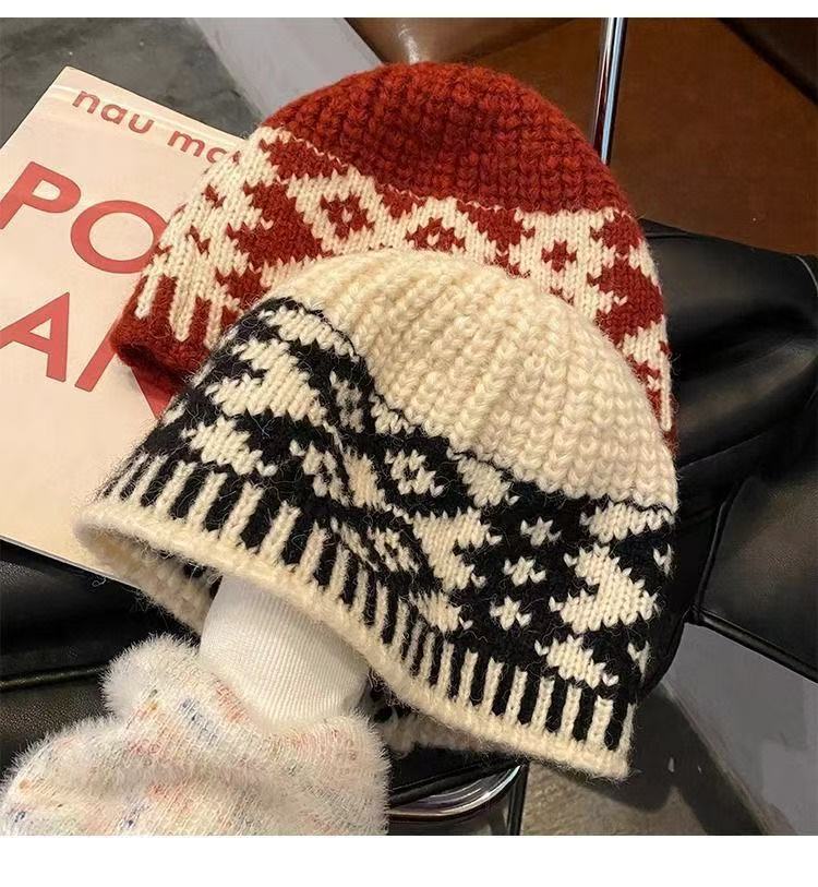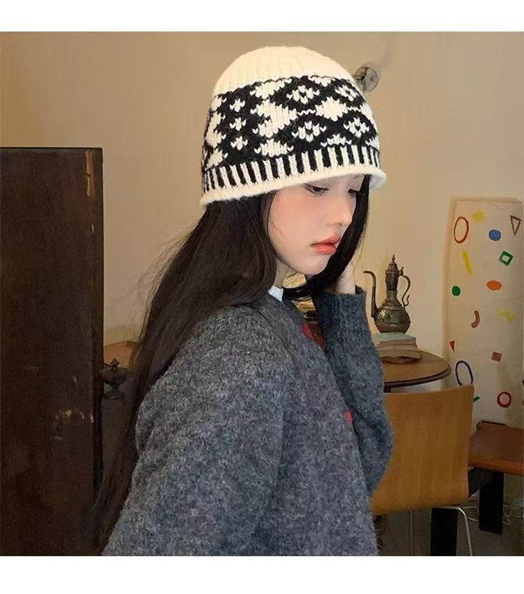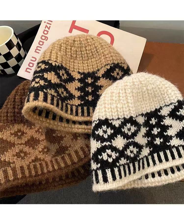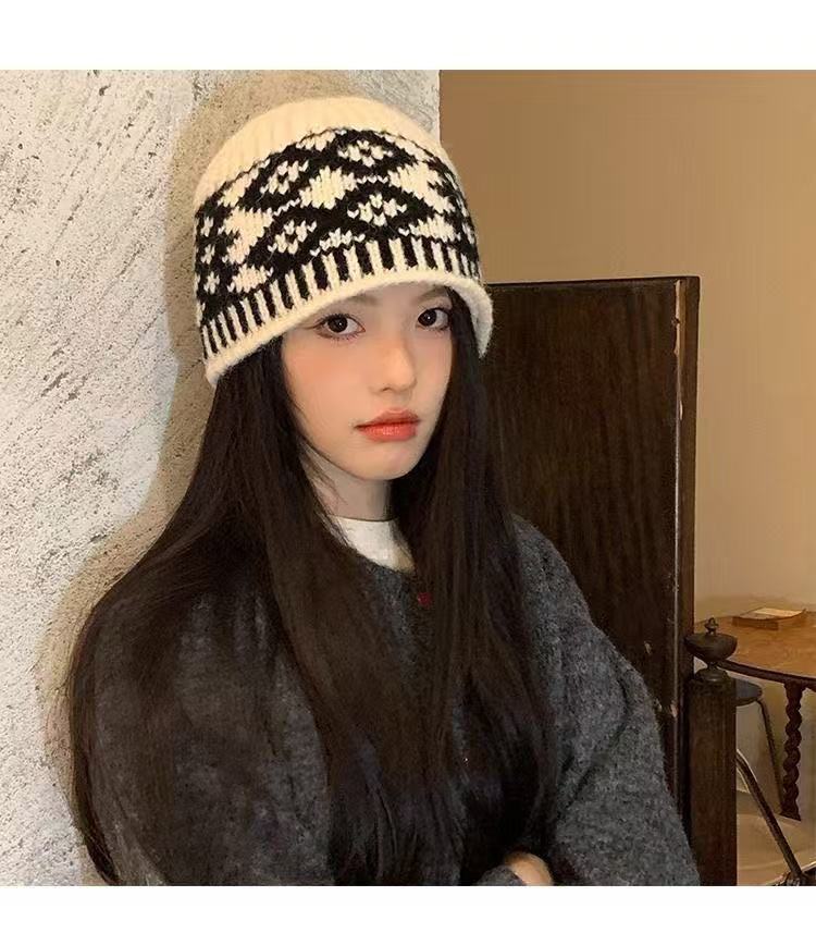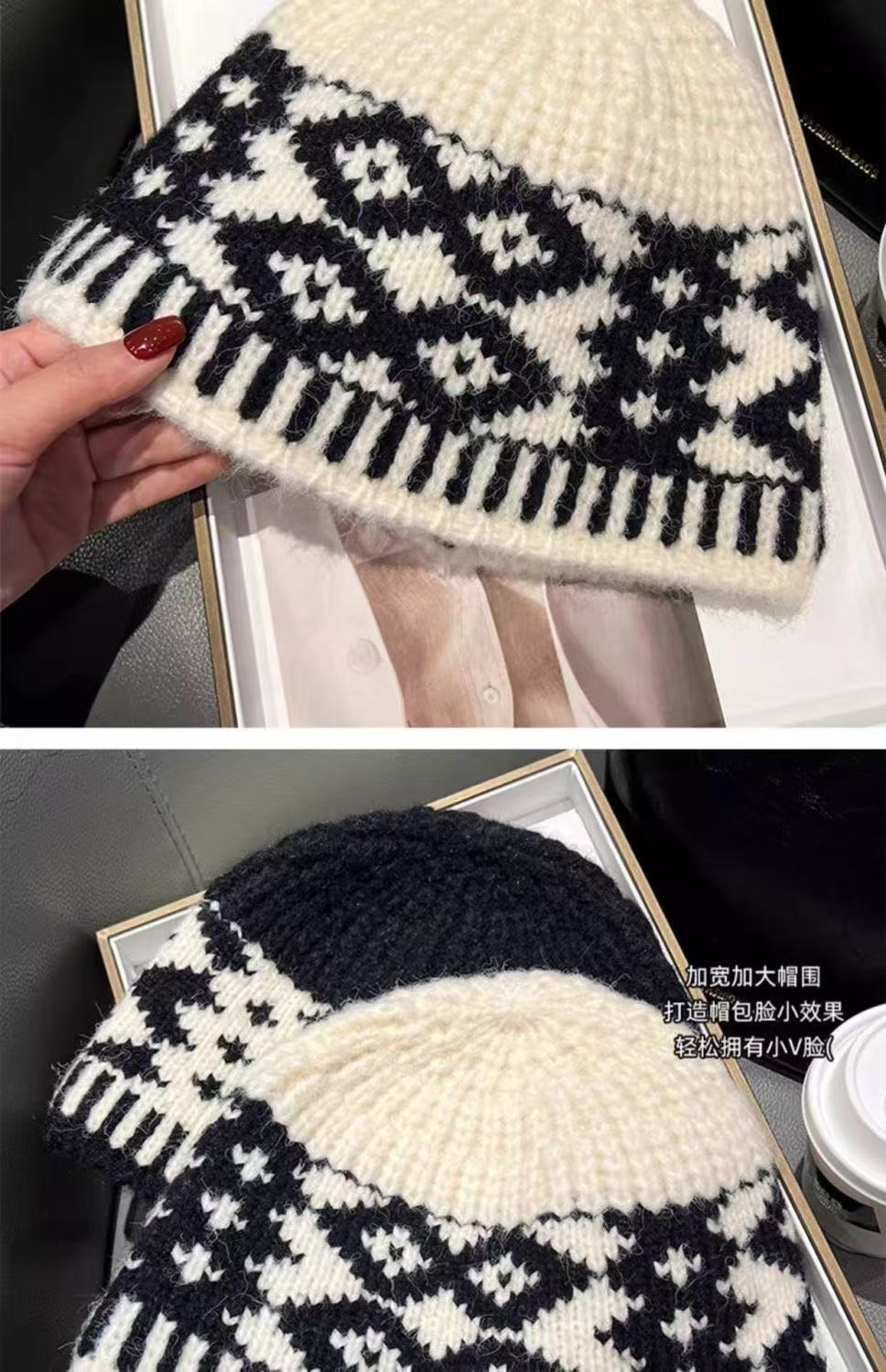 【好看不踩雷!氛围感拉满~】加宽加大帽围,舒适保暖,复古拼色菱形格子针织毛线帽女秋冬显脸小包头冷帽保暖帽子。rc