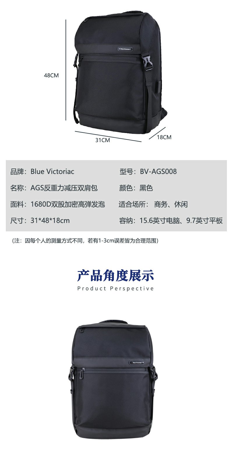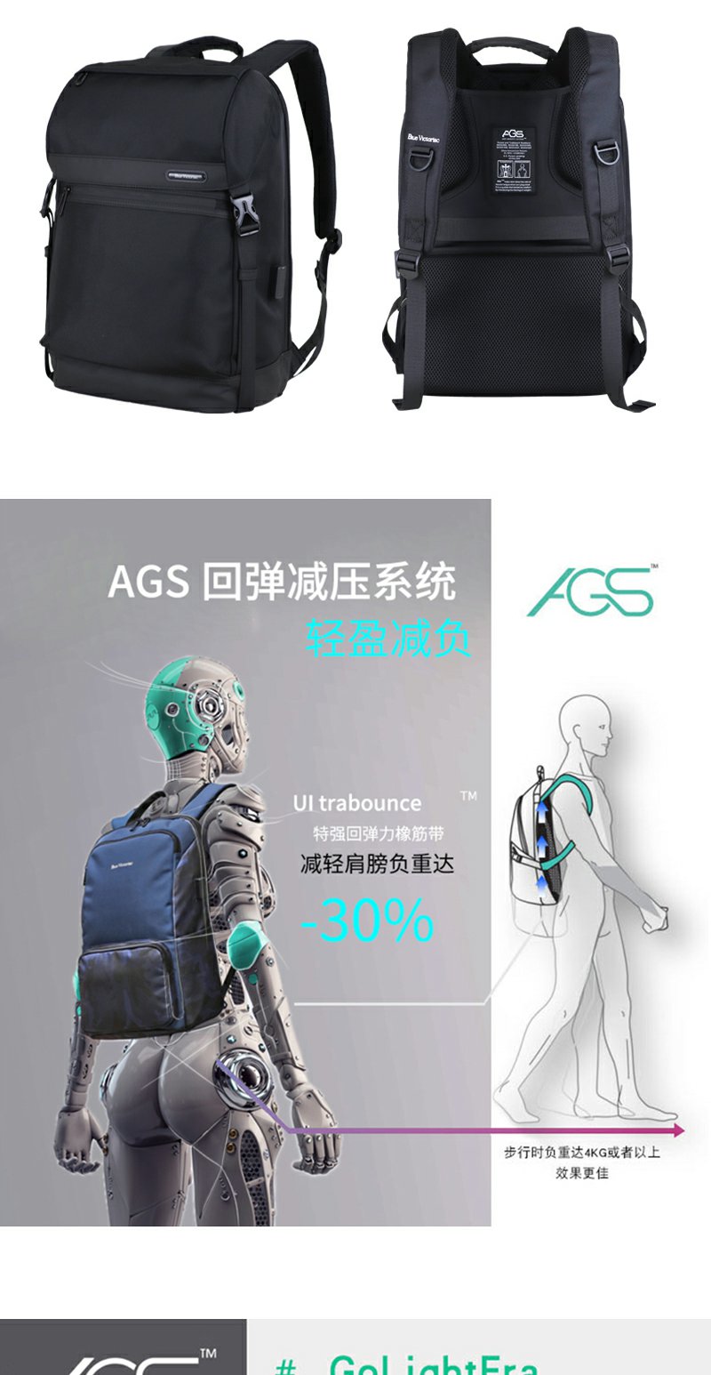 蓝色军刀AGS反重力减压护脊双肩包BV-AGS008尼龙、AGS黑色
