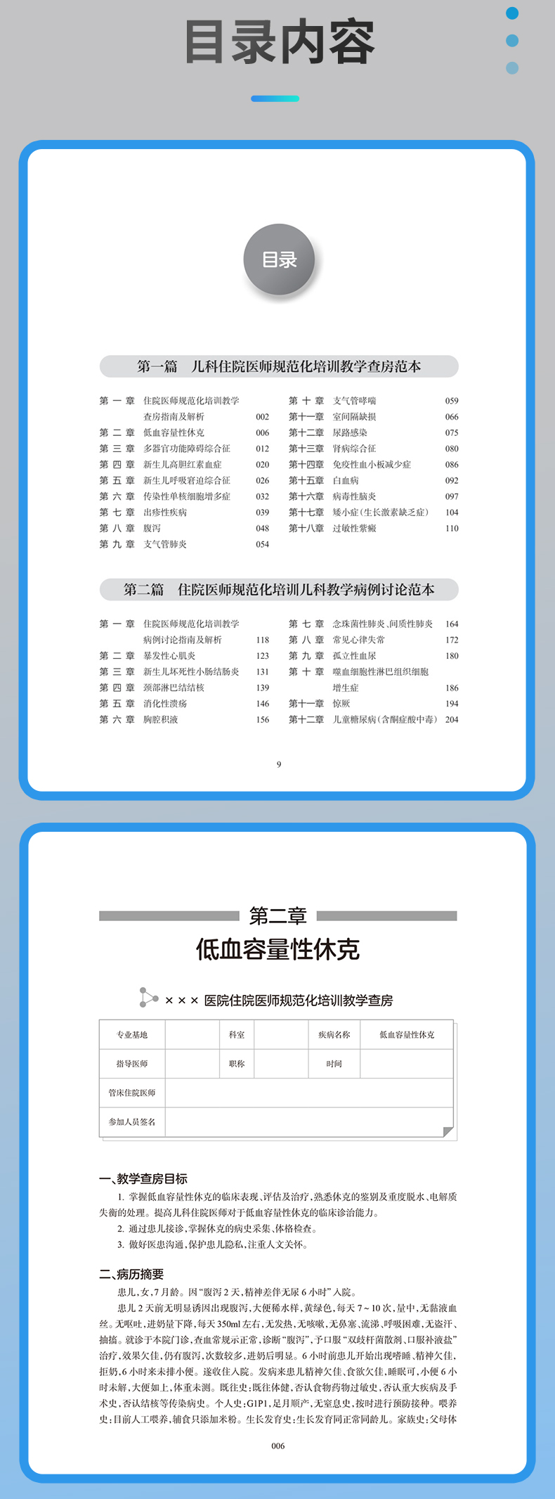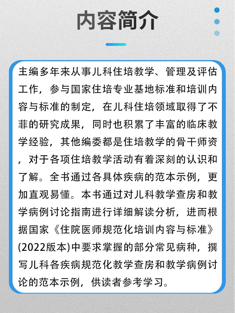 主编多年来从事儿科住培教学、管理及评估工作,参与国家住培专业基地标准和培训内容与标准的制定,在儿科住培领域取得了不菲的研究成果,同时也积累了丰富的临床教学经验,其他编委都是住培教学的骨干师资,对于各项住培教学活动有着深刻的认识和了解。全书通过各具体疾病的范本示例,更加直观易懂。本书通过对儿科教学查房和教学病例讨论指南进行详细解读分析,进而根据国家《住院医师规范化培训内容与标准》(2022版本)中要求掌握的部分常见病种,撰写儿科各疾病规范化教学查房和教学病例讨论的范本示例,供读者参考学习。