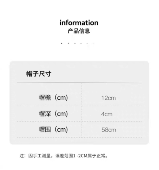 【尺寸】55-60cm可调节,帽围58cm,帽檐12cm,帽深4cm