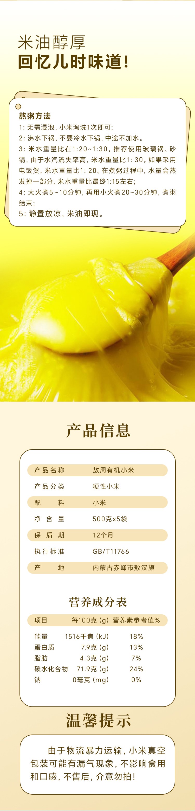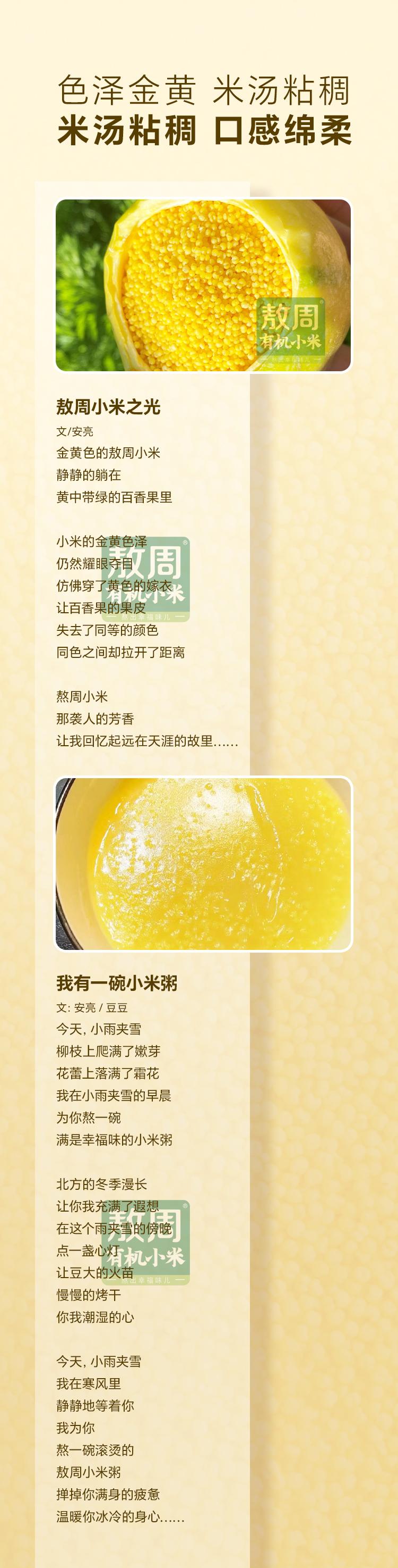 ⑥汤稠味美,回味绵长。米汤粘稠,入口绵醇。非所有小米皆可称「敖周」,敖周小米为家人熬粥,熬出幸福滋味。