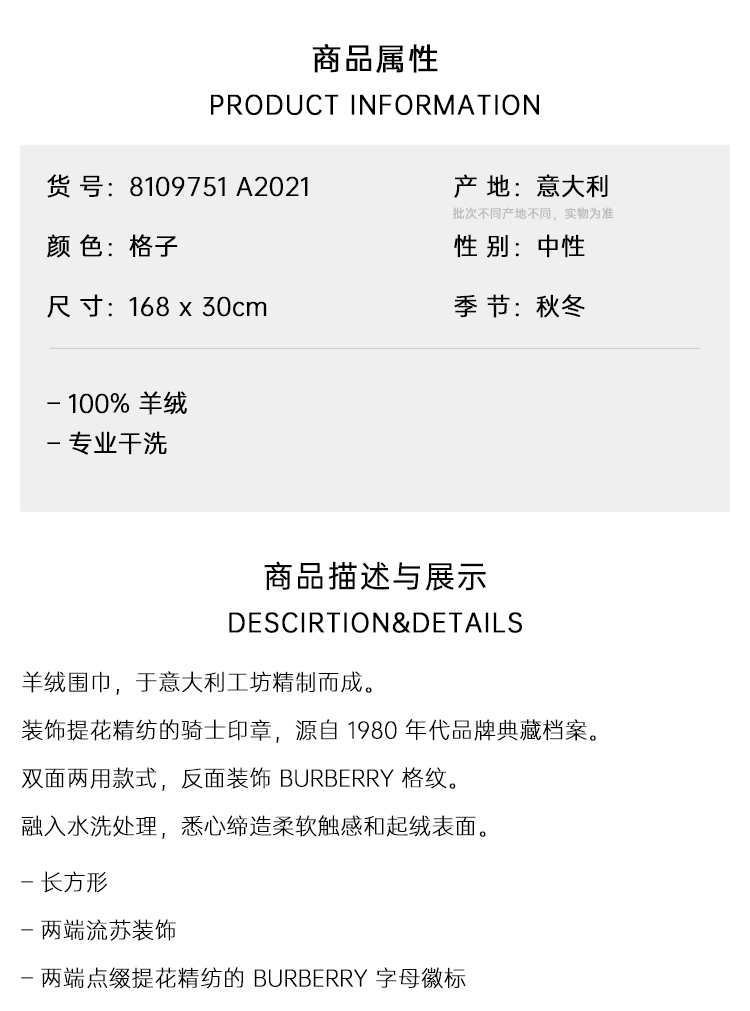 BURBERRY 巴宝莉 中性双面两用骑士印章羊绒围巾 格子 8109751 A2021