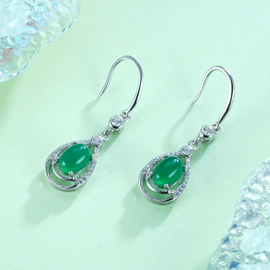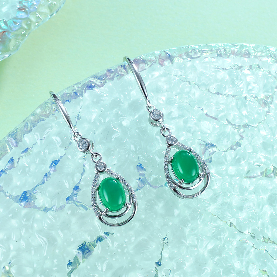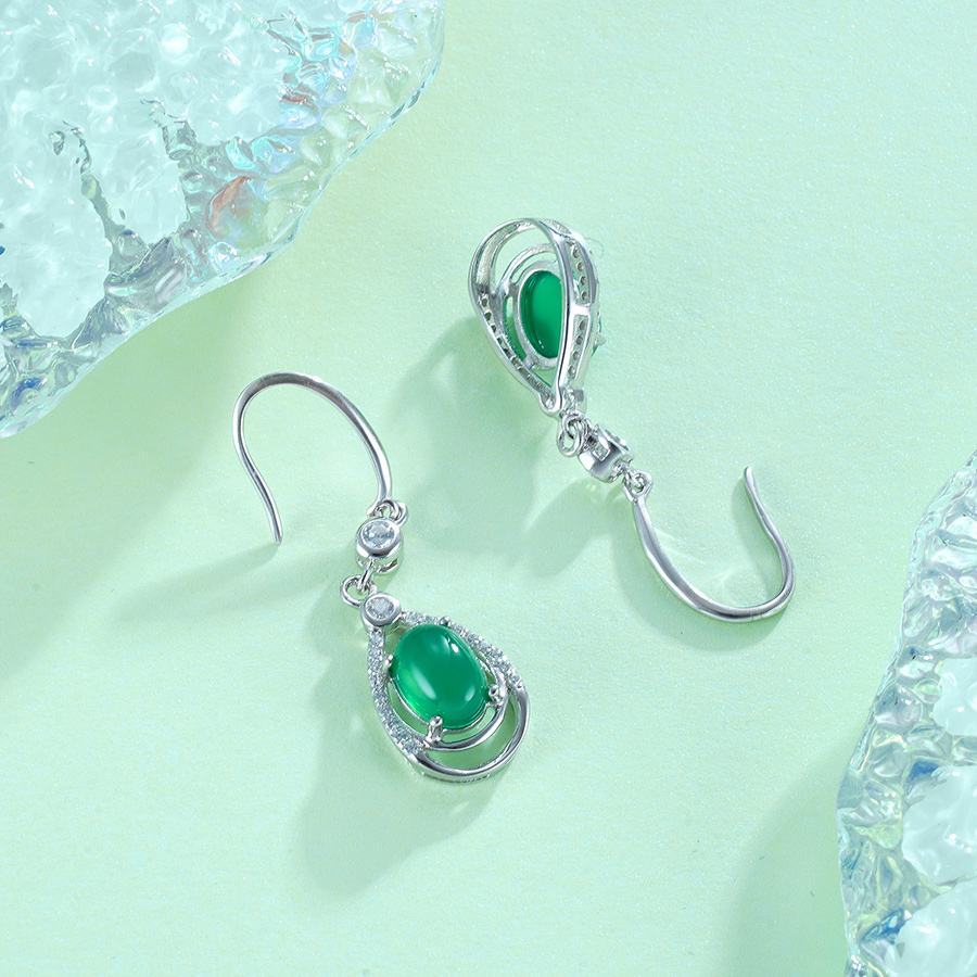 【寓意】:一款贵气且温柔感十足的耳饰。蛋面绿玉髓搭配纯银镂空耳坠,点缀于耳畔,散发明媚健康的诗意美感。
