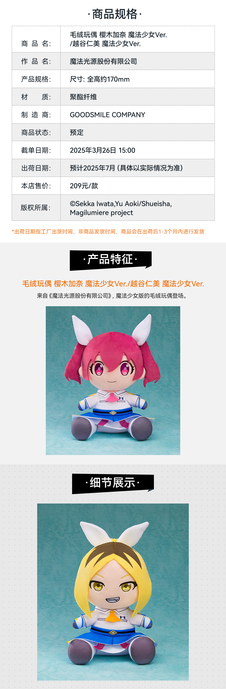 【GSC补款】毛绒玩偶 樱木加奈/越谷仁美 魔法少女Ver. 魔法光源股份有限公司