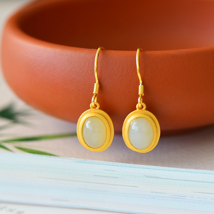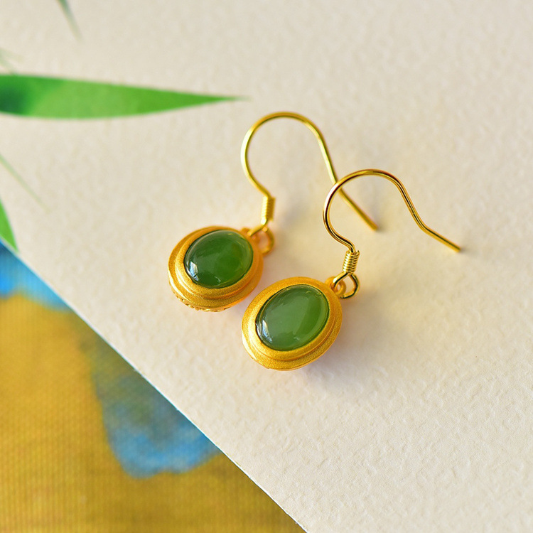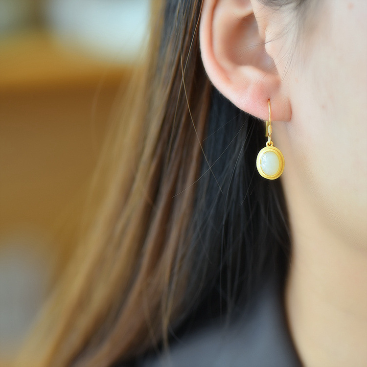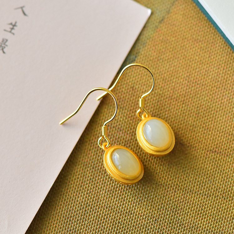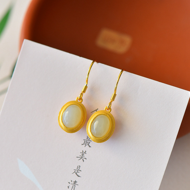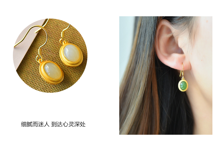 带证书925银镀金镶嵌蛋面和田玉耳环古风耳坠JX2136-6