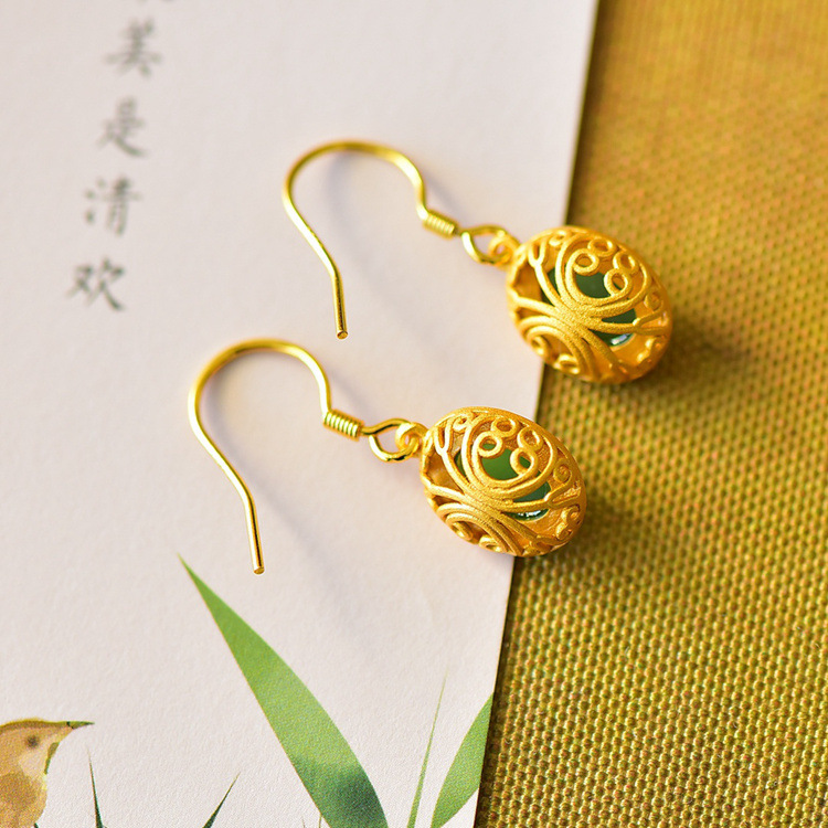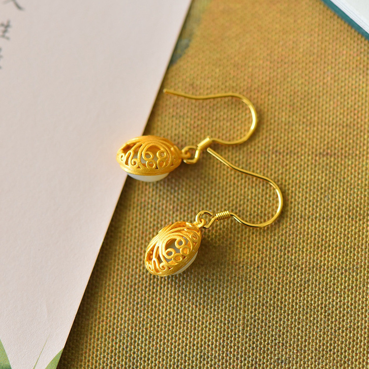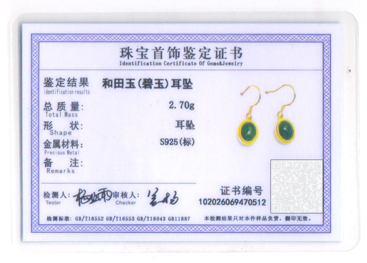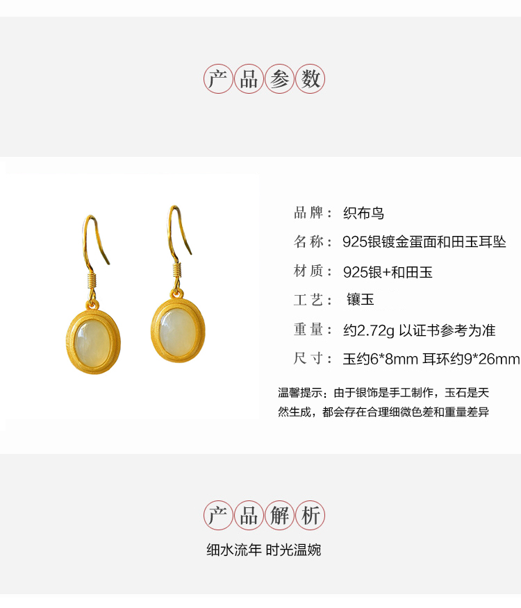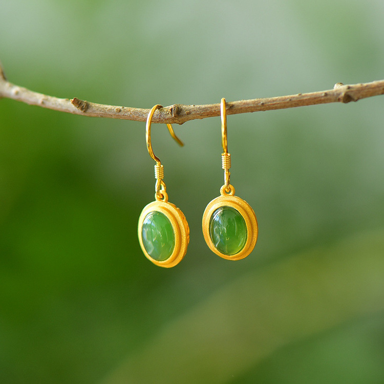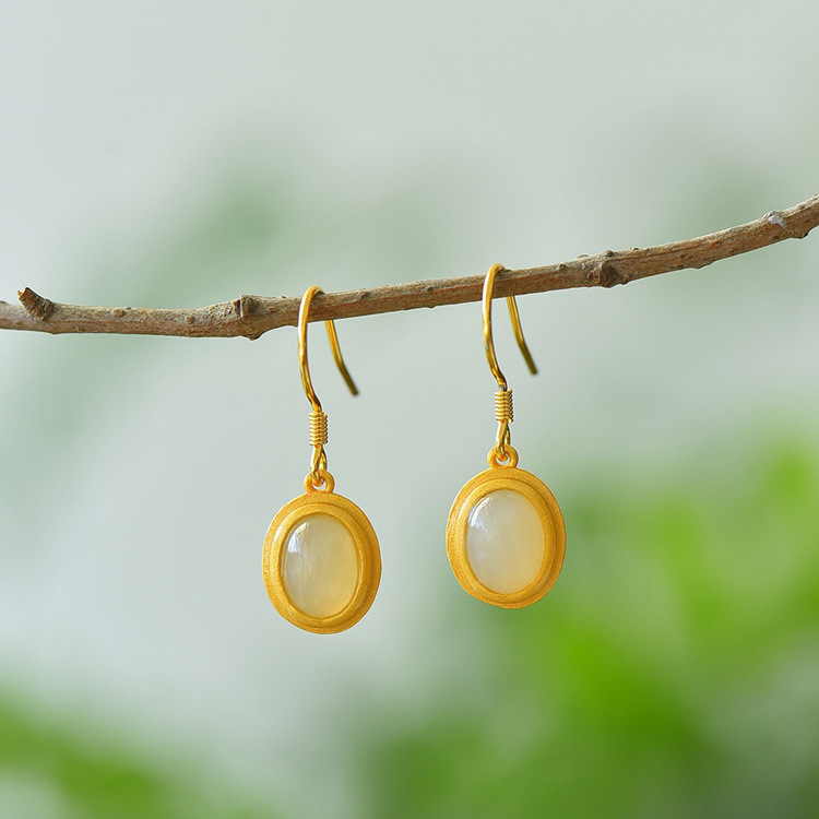 带证书925银镀金镶嵌蛋面和田玉耳环古风耳坠JX2136-6