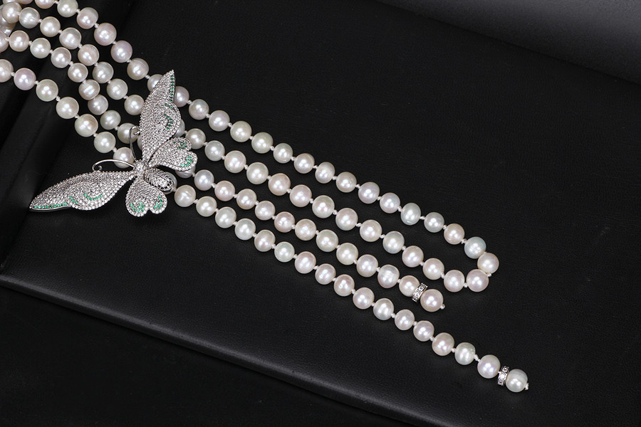 秋冬原创淡水珍珠项链,满钻蝴蝶胸针多用款珍珠毛衣链NM-2229301