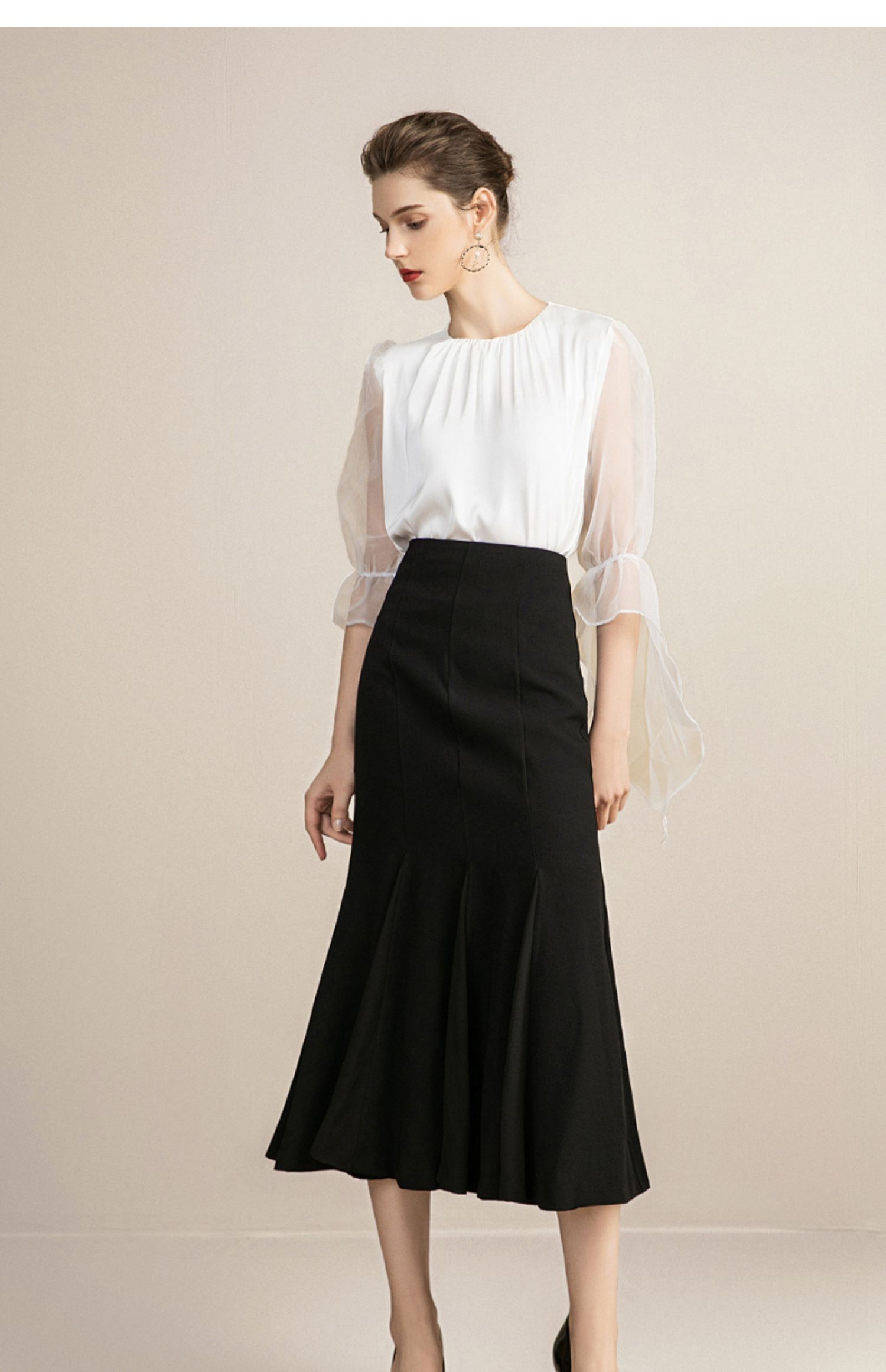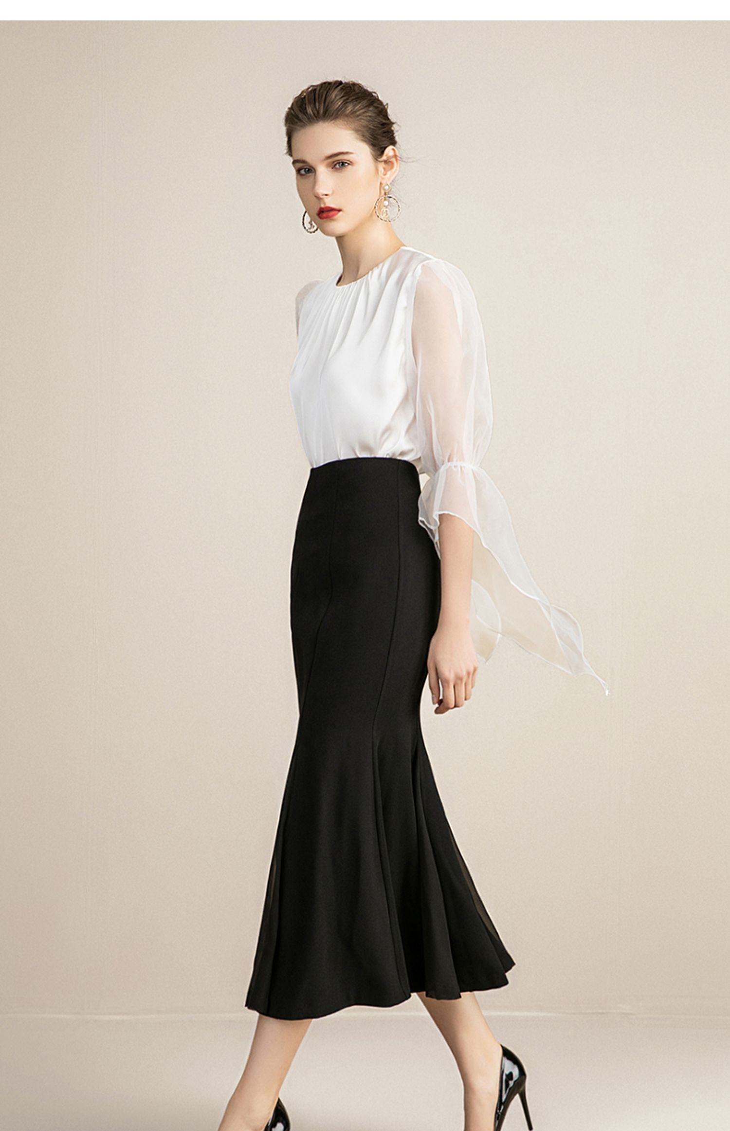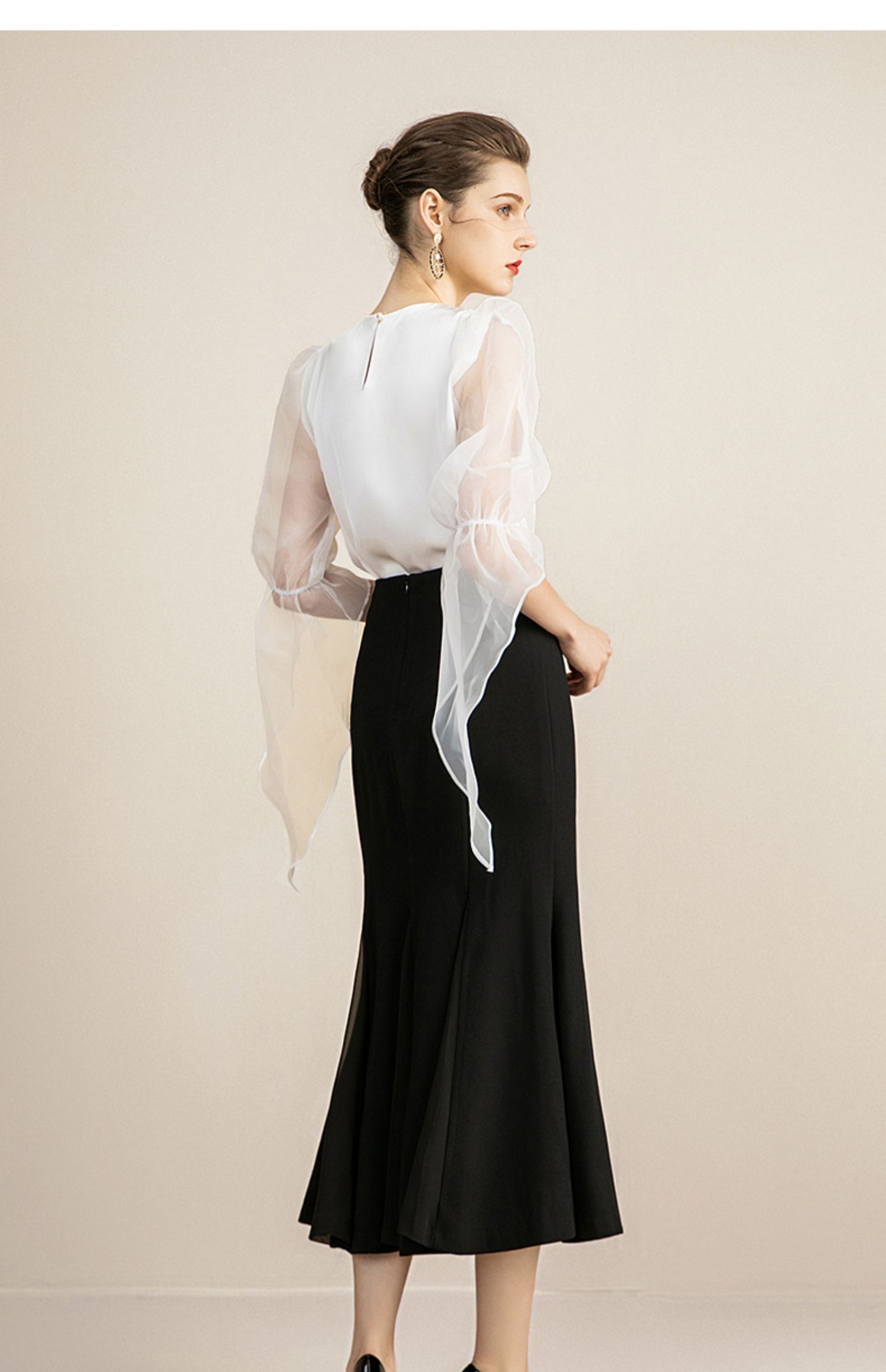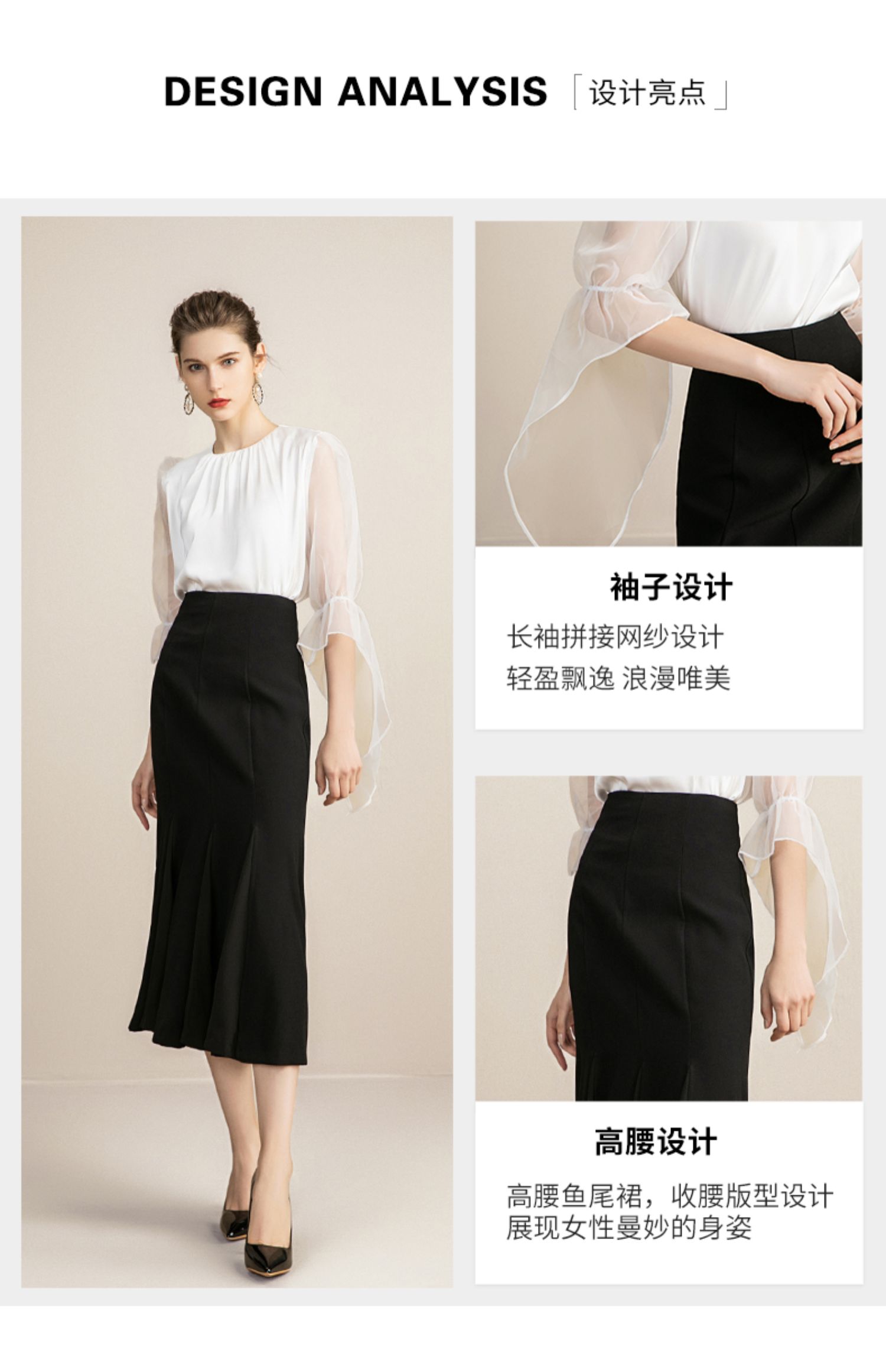 IWY/气质长袖拼接网纱衬衫套装女时尚名媛鱼尾裙套装女修身显瘦正装OL 213161B1+S3