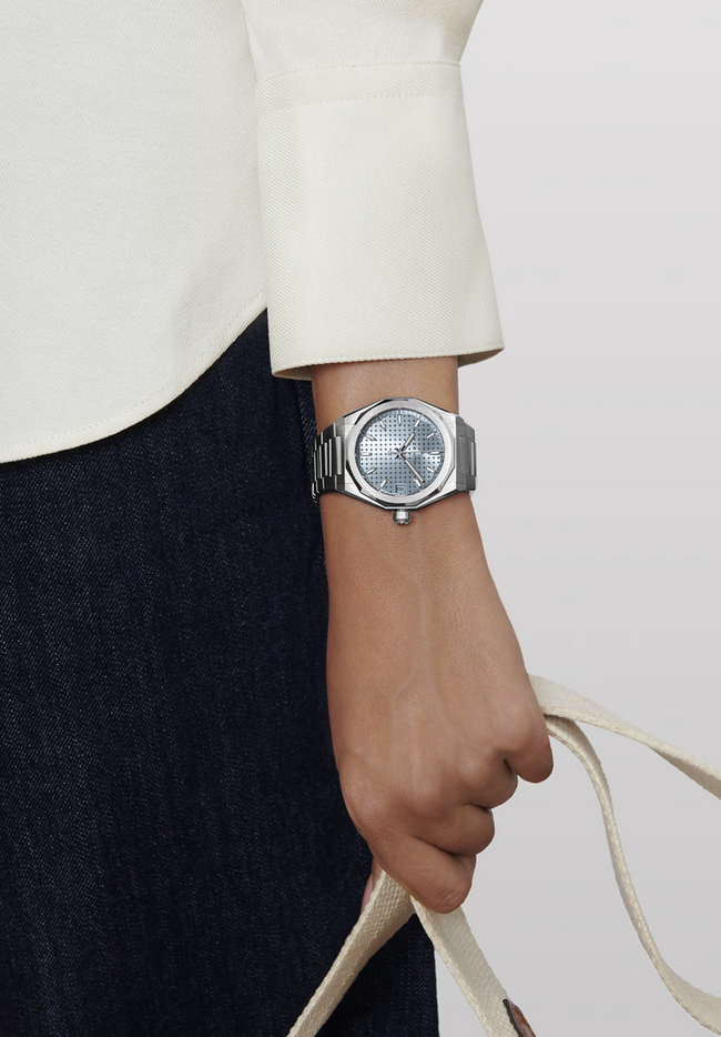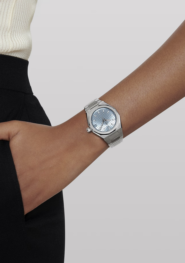 镜面 材质 | 蓝宝石水晶玻璃 | 表盘 | 八边形精钢表壳 冰蓝色太阳纹金属表盘表盘上饰有夜光时标 日期显示 透底 |