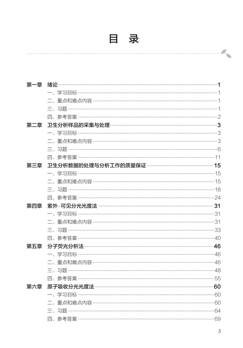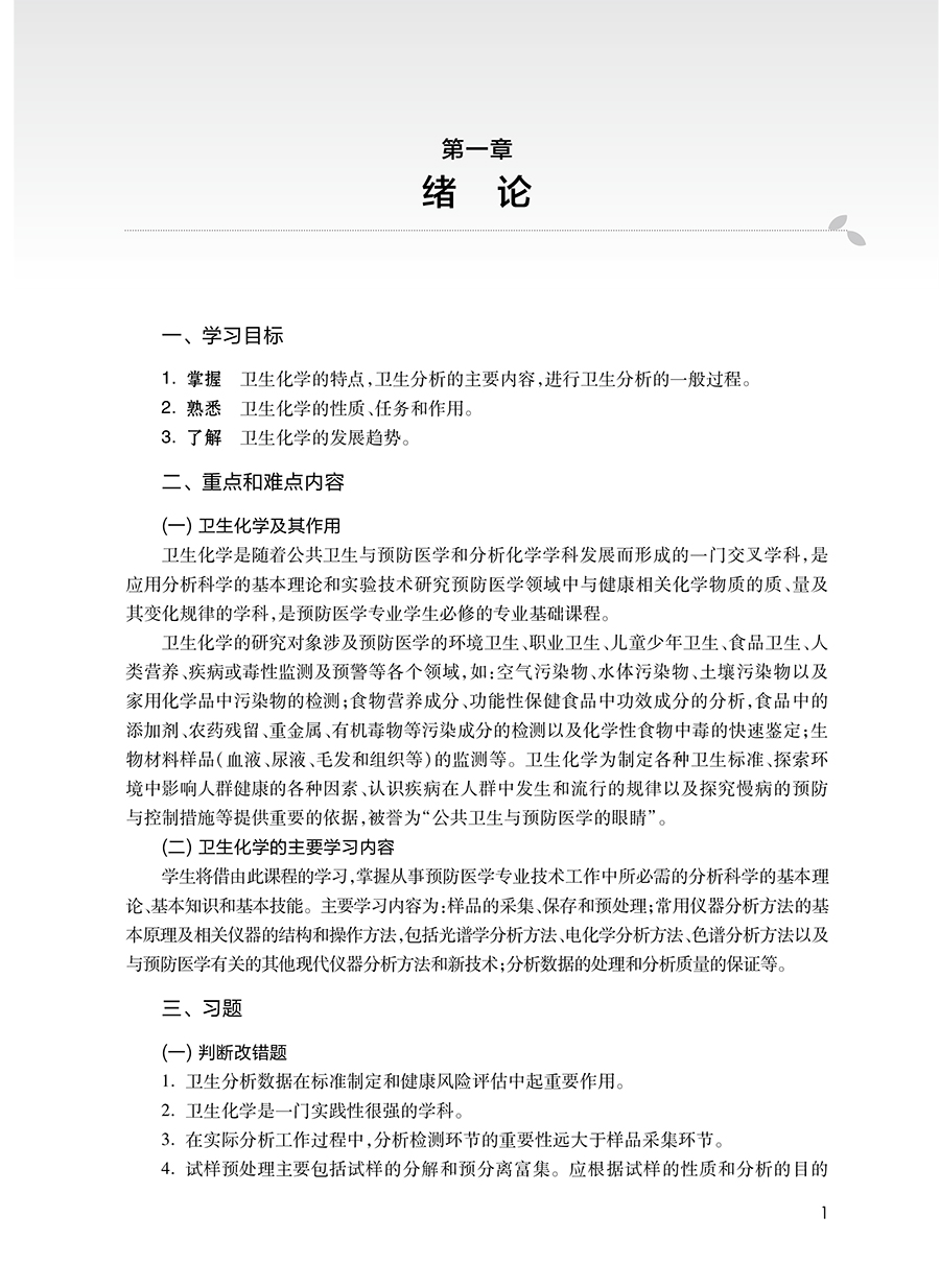 《卫生化学学习指导与习题集》(第4版)是国家卫生健康委员会“十四五”规划教材《卫生化学》(第9版)的配套教材。本教材内容与主教材相呼应,对主教材各章节的基本概念、基本理论、测定依据、仪器原理和结构及其应用进行总结和归纳,精选各类典型习题,并作了详细解答和说明,旨在帮助学生进一步理解各种分析方法的理论和原理,掌握必要的知识点,提高学生的自学能力及综合分析和应用能力。内容分为四大部分,包括:1.学习目标:说明本章内容的学习要求;2.重点和难点内容:对本章主要内容进行归纳总结;3.习题:根据教学内容,选择具有相应深度和广度的典型习题,为与当前各种考试题型相适应,习题类型中加大客观选择题的量,适当保留填空题、简答题、计算题等题型;4.参考答案:所有的习题均配有参考解答,以便学生自学。