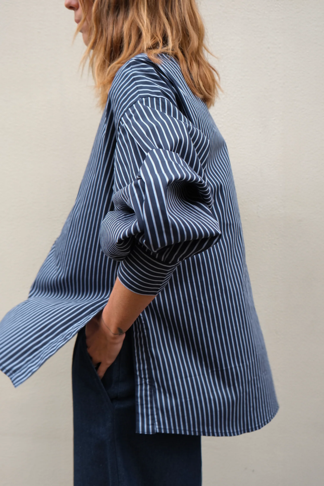TYNVIE 褶裥过肩蕾丝饰边衬衫 - 蓝白细纹