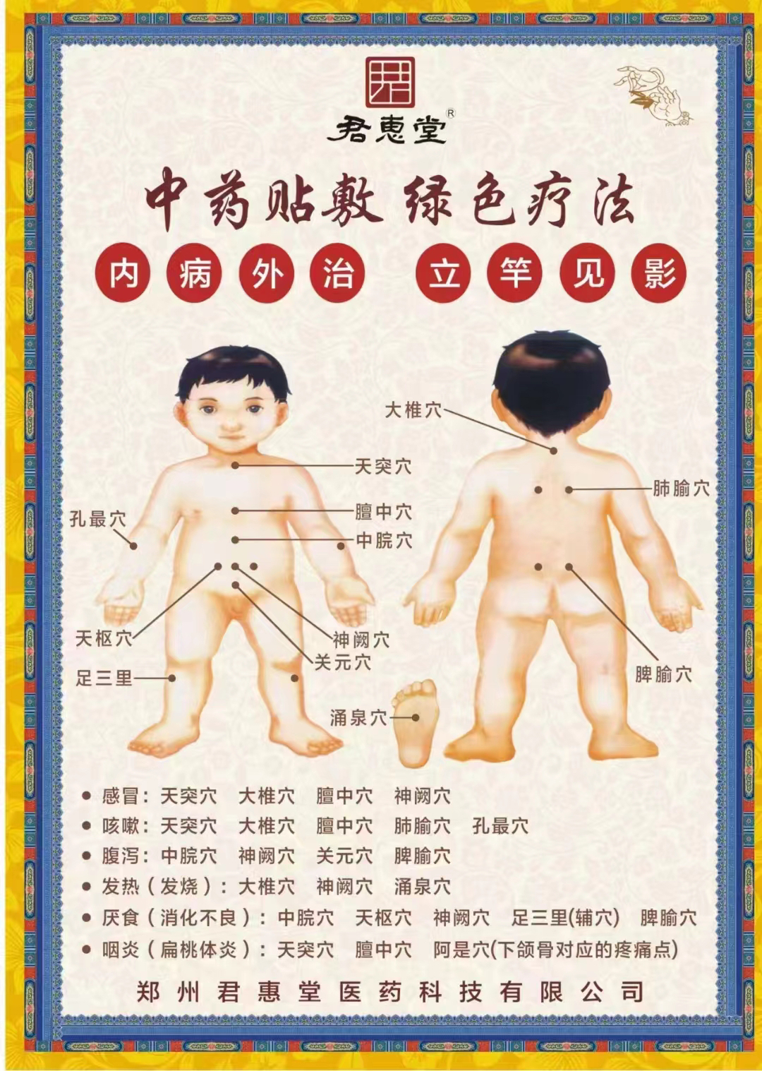 🌹君惠堂穴位贴,纯中药提取,药物能够穿透皮下脂肪,直达病灶,快速起效,贴上半小时内见效,七种常见婴幼儿病症,穴位贴调理如下: