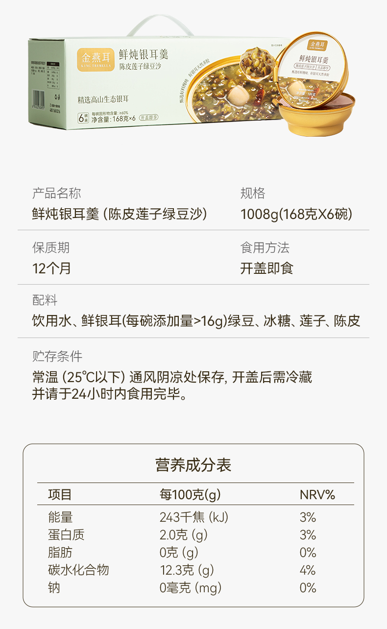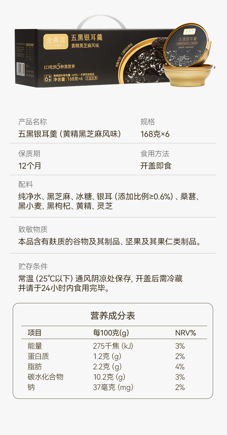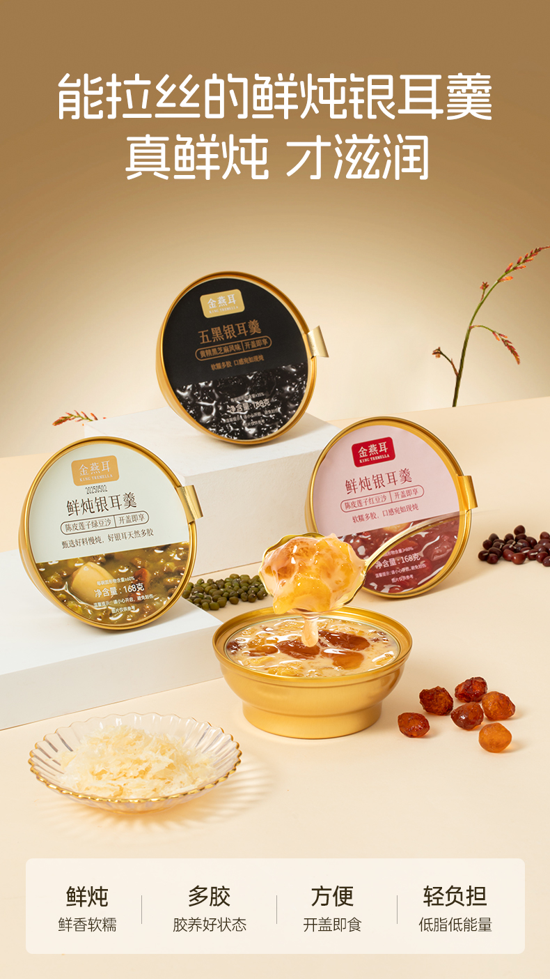 金燕耳 鲜炖银耳羹 五黑银耳羹/陈皮莲子红豆沙/绿豆沙银耳羹 /杨枝甘露桃胶银耳羹 3秒开盖即食 单碗鲜炖 营养不流失 168g*6碗(购买2箱以上的快递可能会分多个包裹发货 请注意查收)