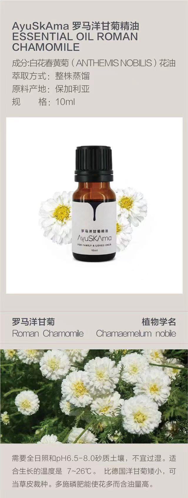 罗马洋甘菊拥有精油中较少见的酯类,欧白芷酸异丁酯,它具有绝佳的放松效果,可以抗痉挛、安抚神经系统及退烧。在情绪调整上,对突如其来事件感到惊慌失措的个案,能够有效提供如“母鸡保护小鸡”般的安全感,让个案能够安定神经,抚平受到震惊的情绪。用于皮肤系统,则能呵护娇嫩脆弱的肤质,例如婴幼儿皮肤,或不明原因的过敏起瘆,以及受到惊吓的皮肤状况,例如镭射过后的红肿肤质,都能提供非常良好的安抚镇定功效。