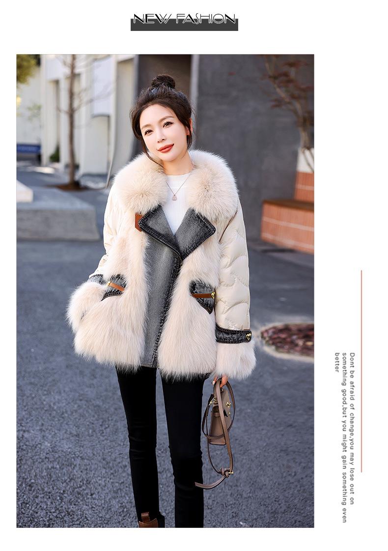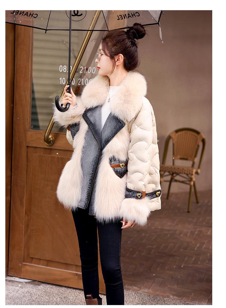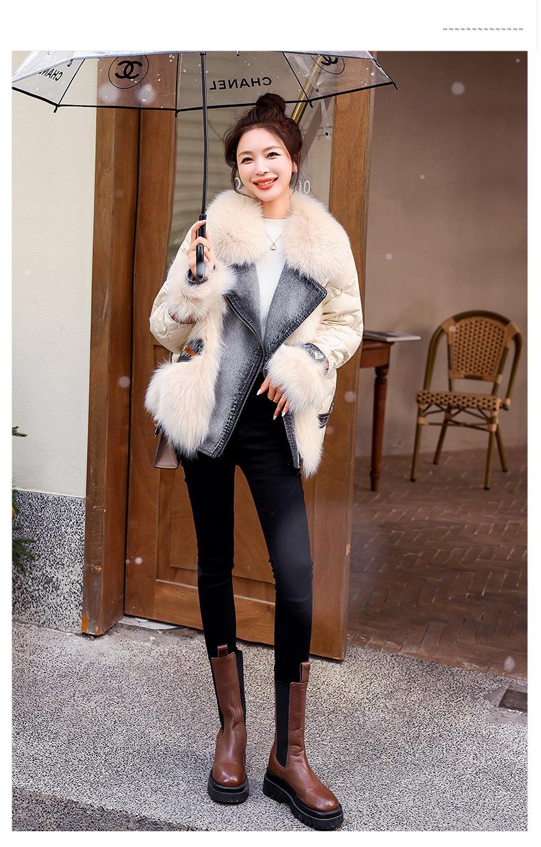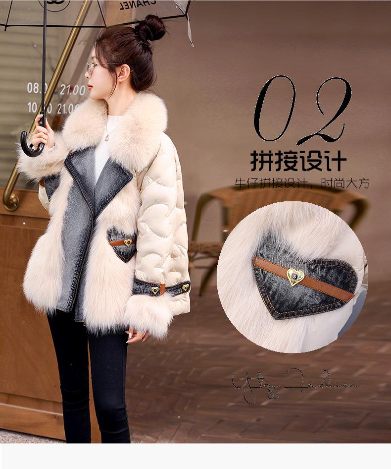 版型好看的羽绒服女款2023今年新款时尚短款牛仔拼接皮草外套冬季