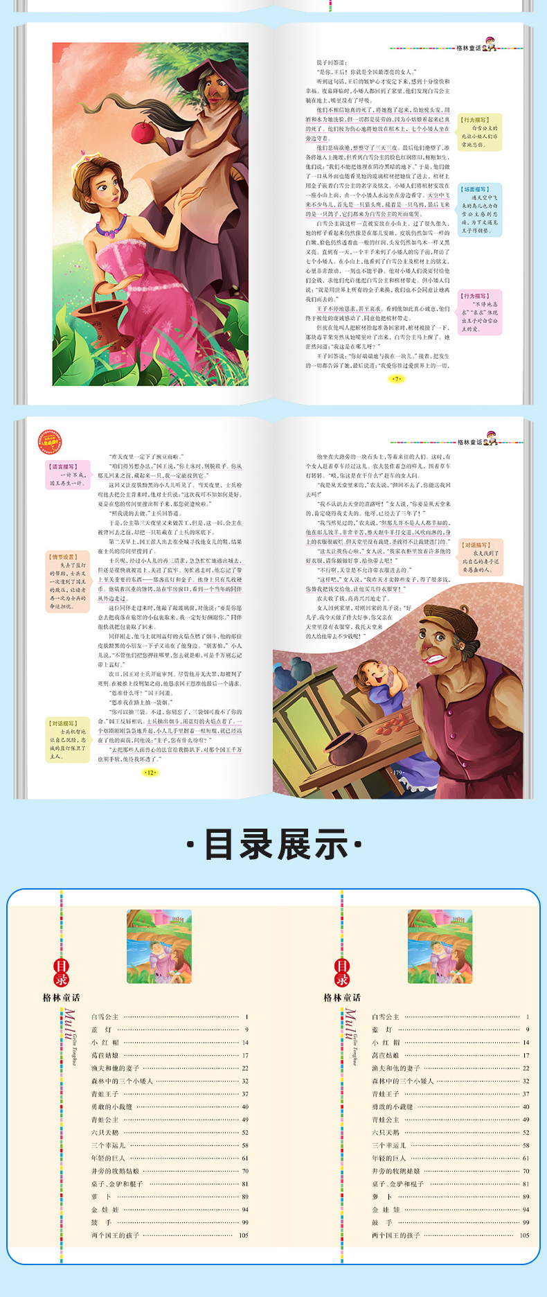 《格林童话》由德国民间文学研究者格林兄弟搜集、加工、整理而成,大多歌颂勤劳、正直、善良、勇敢和宽容,抨击懒惰、邪恶、怯懦与嫉妒,反映了人们对健康向上的人生和美满幸福生活的追求。童话中的主人公往往通过坚忍不拔的努力和不屈不挠的抗争,用汗水与智慧赢得命运的青睐,最终战胜苦难与邪恶。其中著名的故事有《小红帽》《青蛙王子》《睡美人》等。