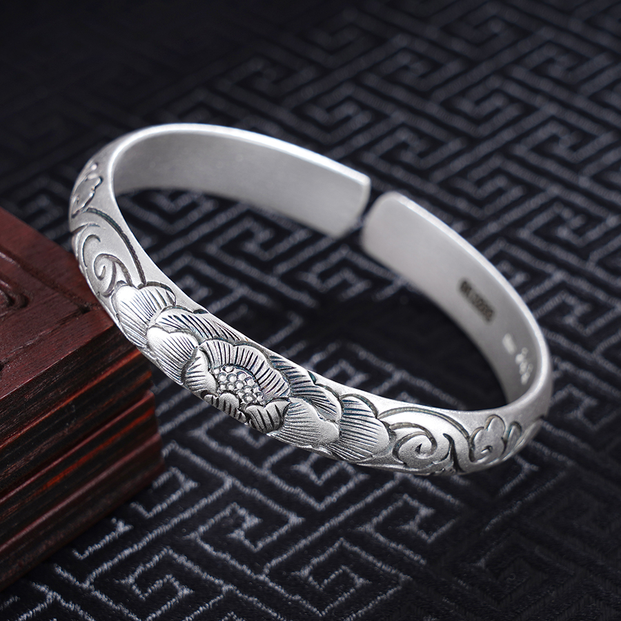 【寓意】:以古法錾刻莲花祥云纹样,双意象交织共生,凝萃东方美学灵韵。镯身古韵绵绵,形制浑厚端庄。一枚做工精湛的手工手镯,是对母亲“吉祥如意”的祝福,更是对她无尽感恩的表达。