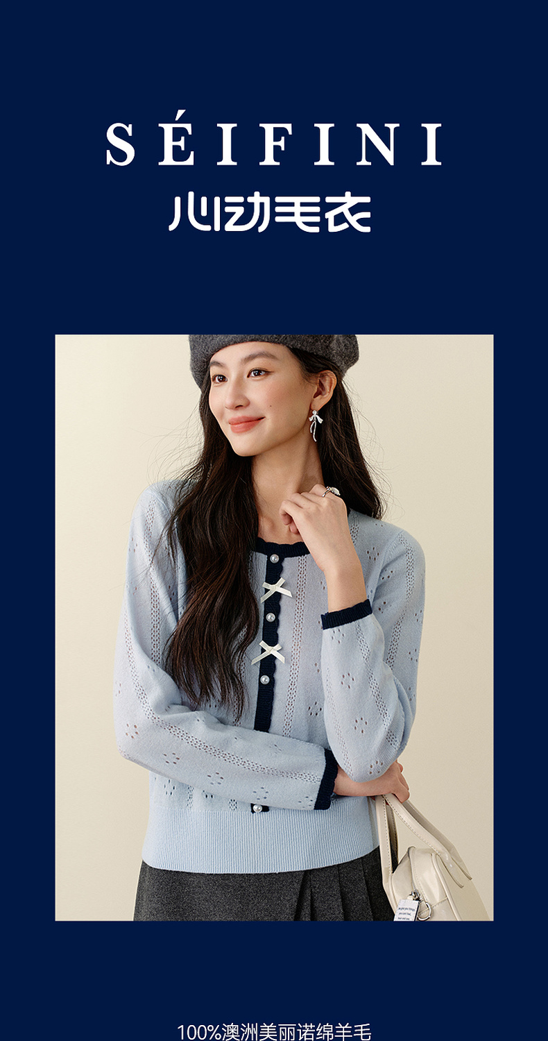【严选】诗凡黎全羊毛蝴蝶结撞色花边针织衫2025秋冬新款韩系镂空长袖上衣7G9333091