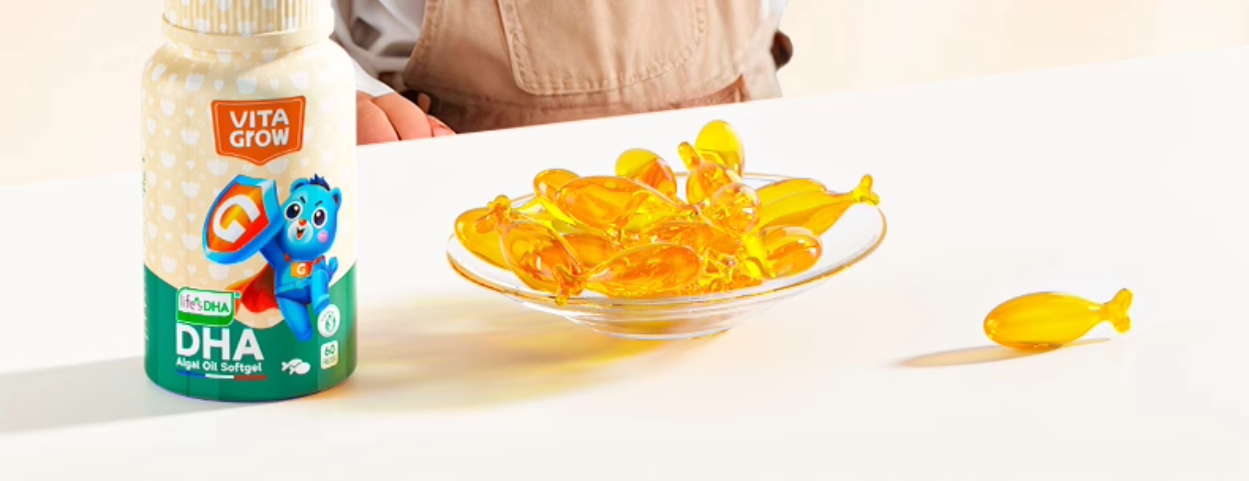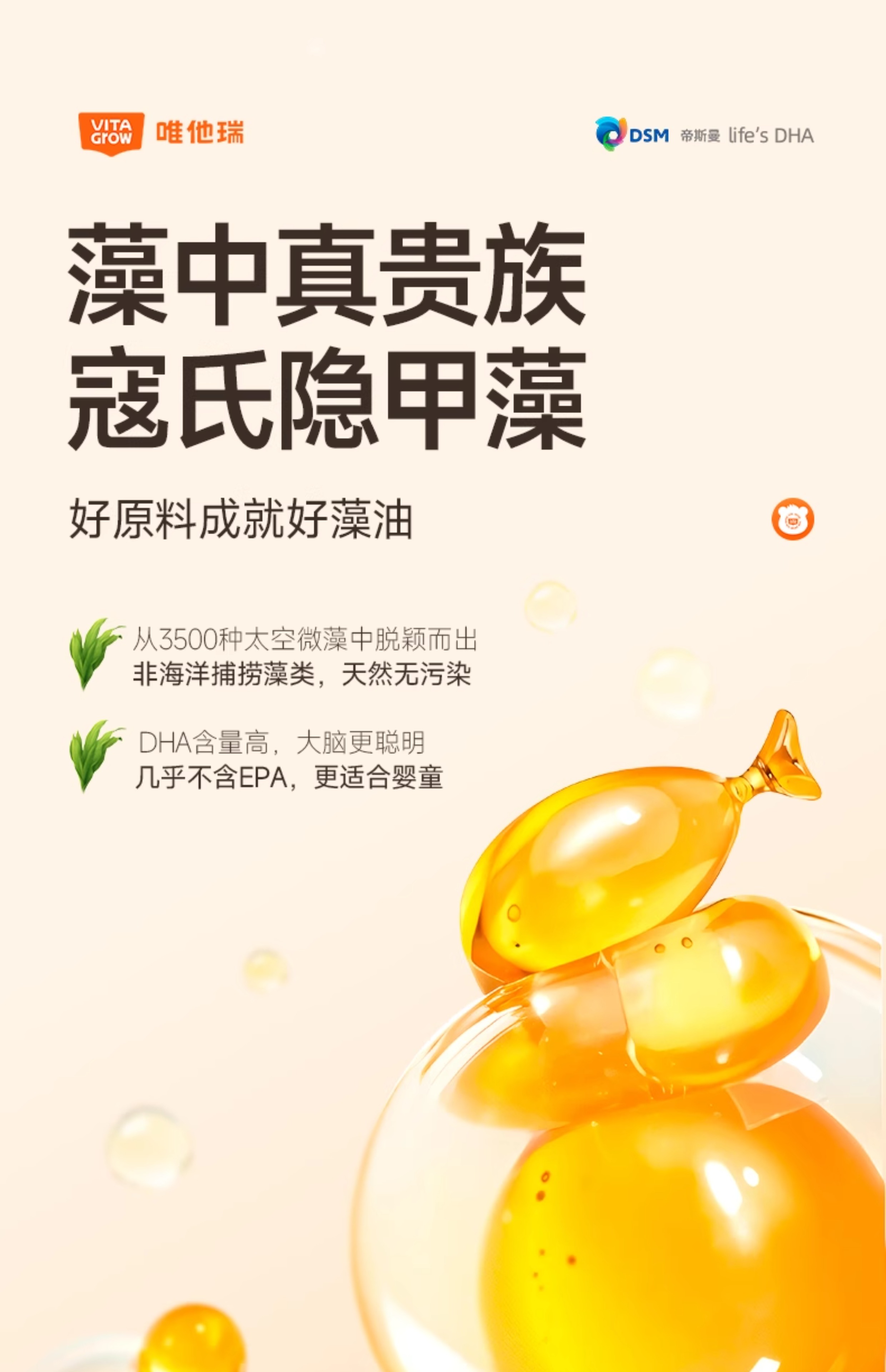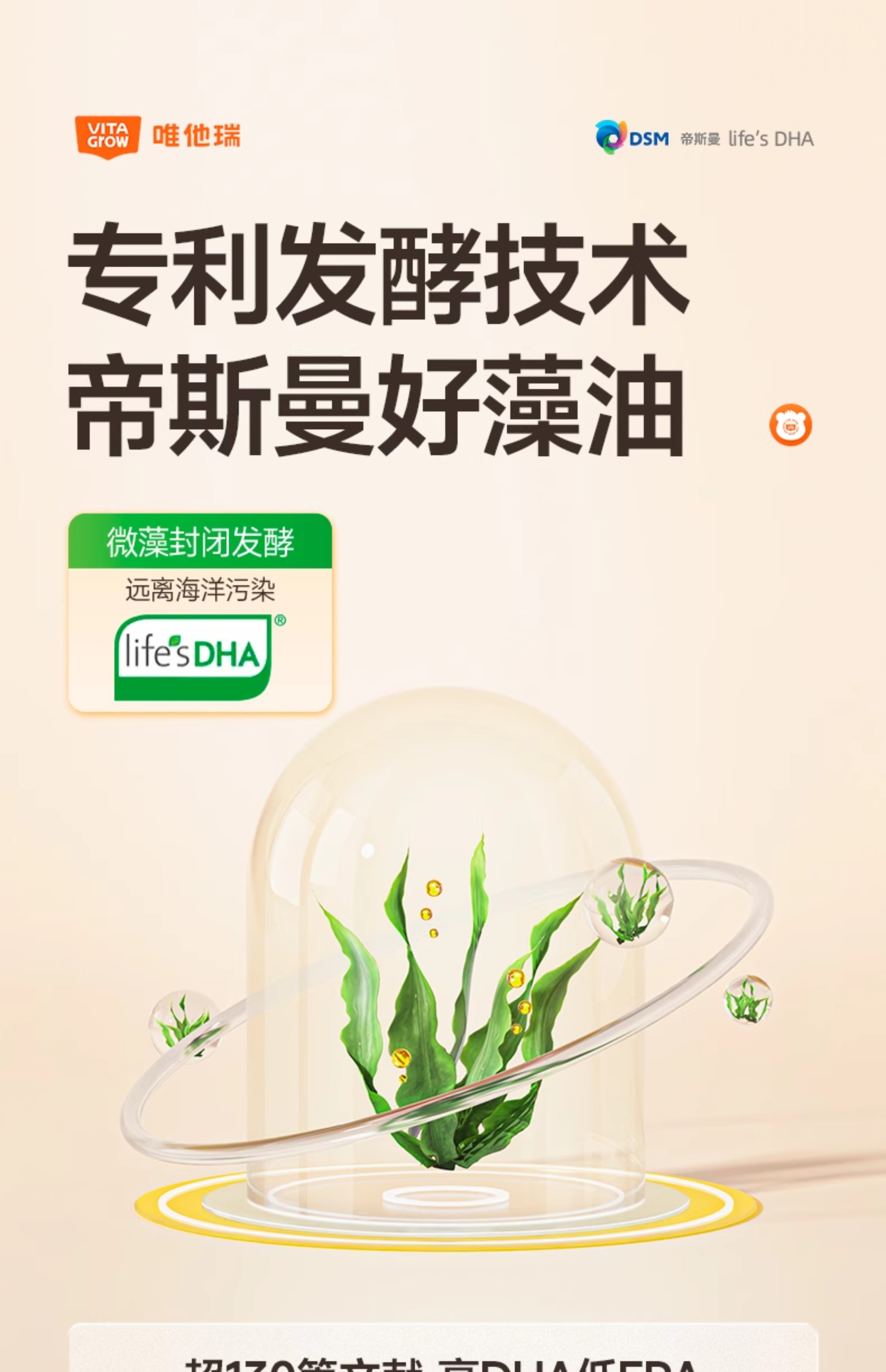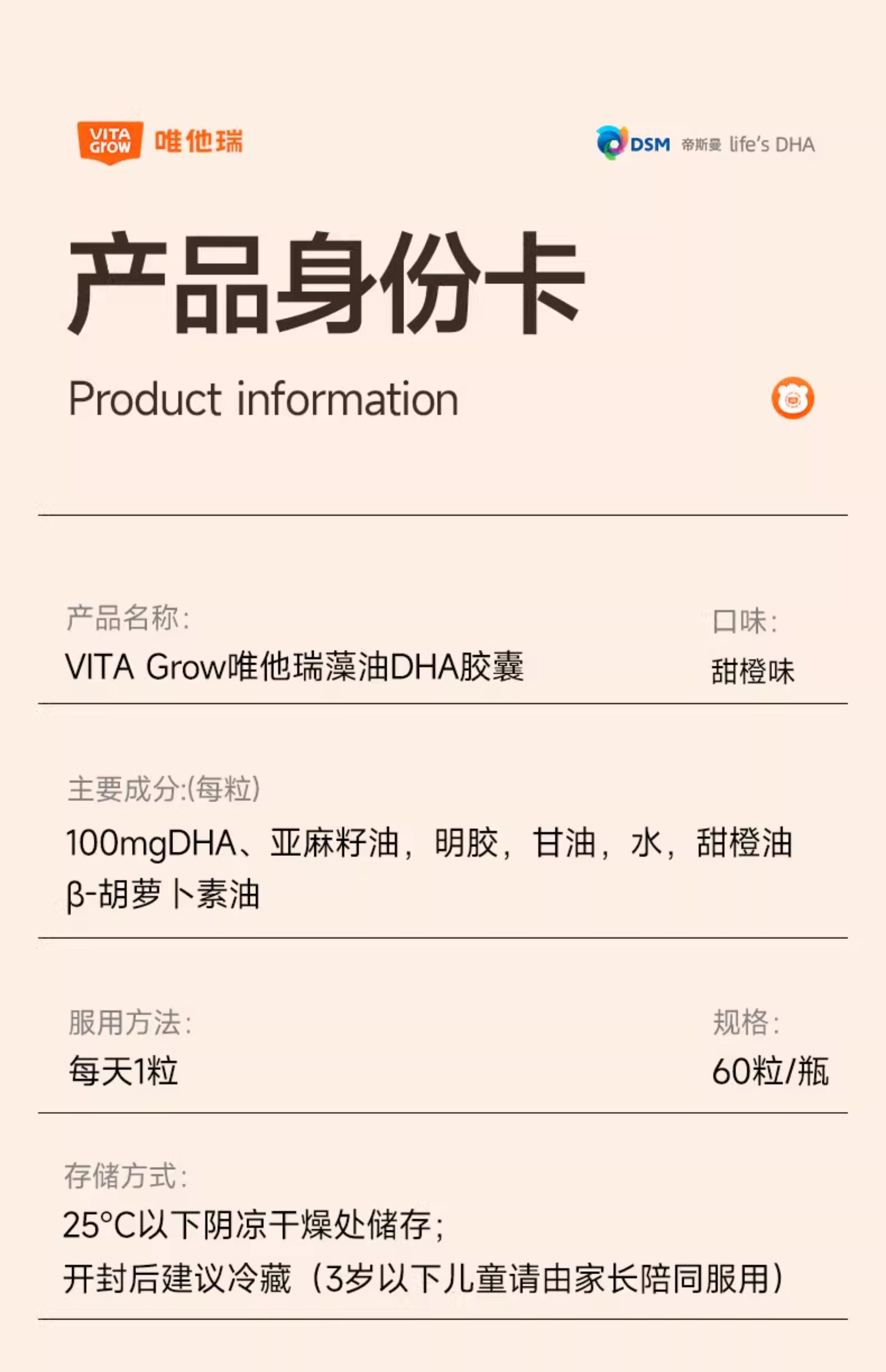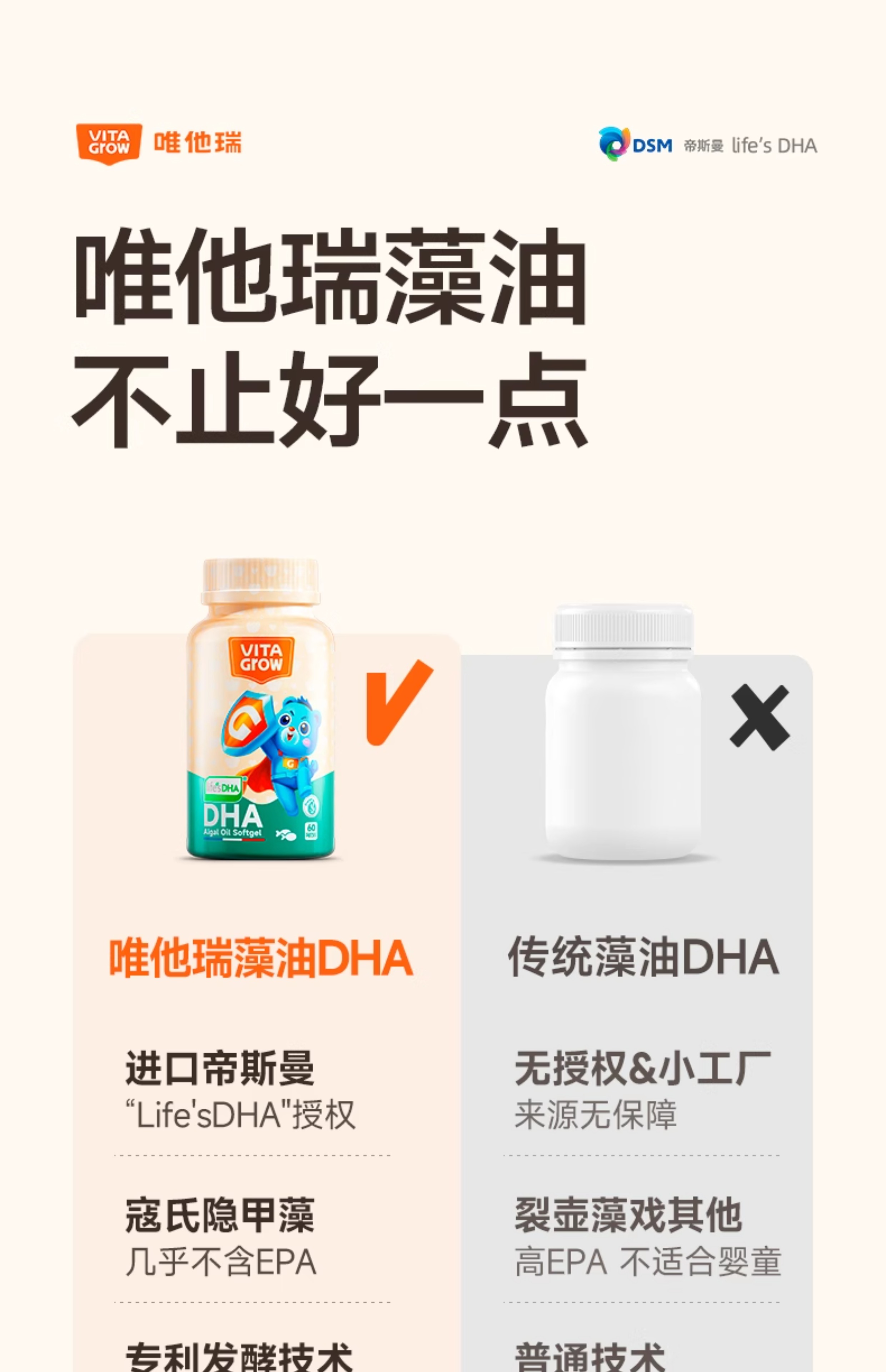 VITA Grow 藻油DHA软胶囊 60粒/瓶 金标级别窛氏隐甲藻婴幼儿低EPA 孩子脑力大开 激发无限潜能