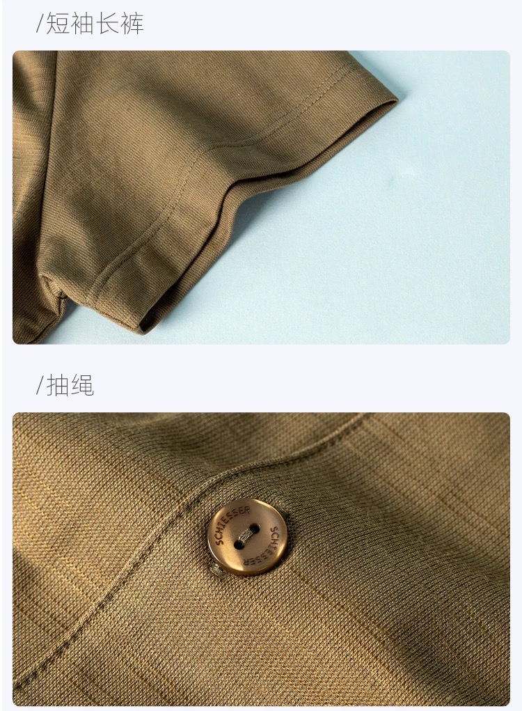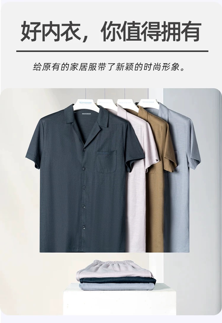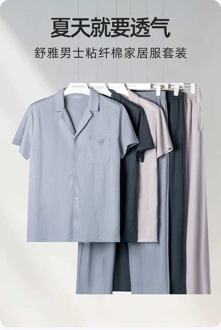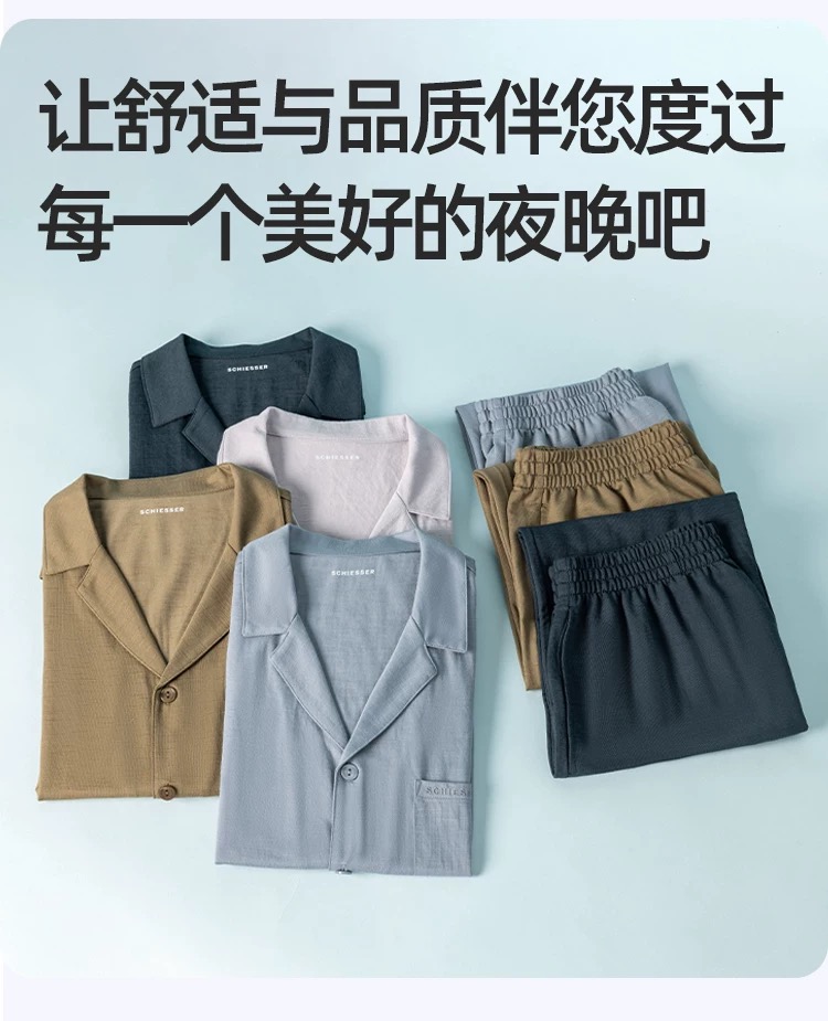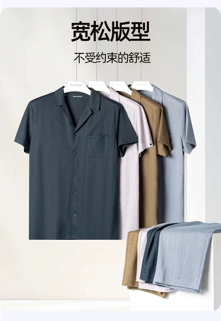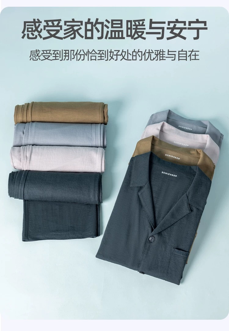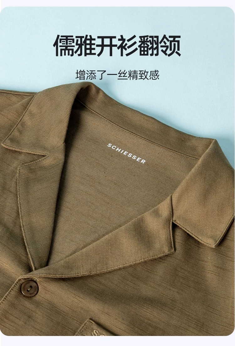 【科技麻】SCHIESSER 德国舒雅男士睡衣春夏款亚麻透气开衫棉莫代尔家居服短袖长裤套装35/21352H