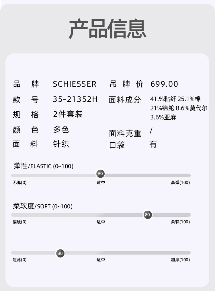 - 来自德国的SCHIESSER舒雅,专注做内衣一百四十余年,不遗余力的材料创新,因材而异的专业剪裁,健康环保的加工技术以及充满文化关注的时尚主题,做你认识之外的舒适内衣。