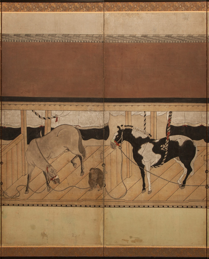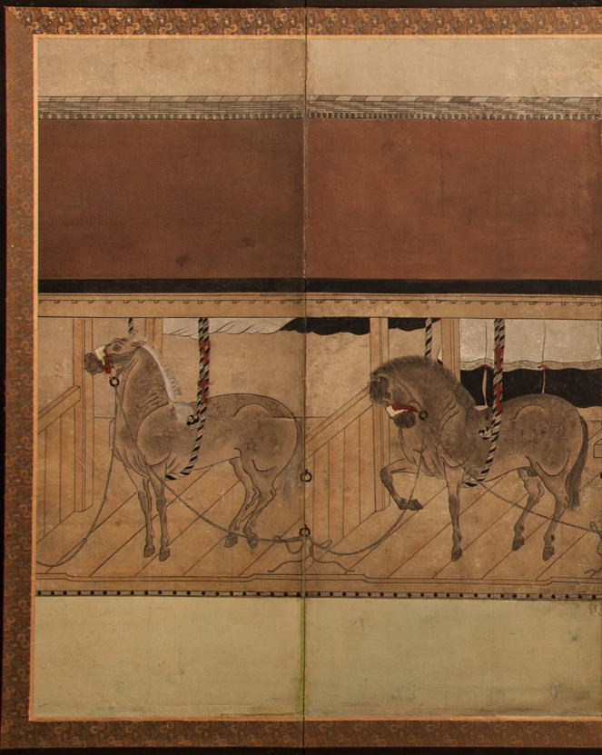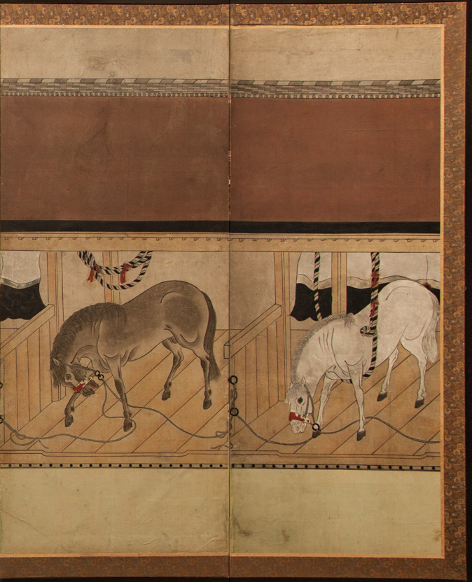 18世纪晚期日本江户时期出品狩野派风格「马厩」主题纸本设色六曲屏风
