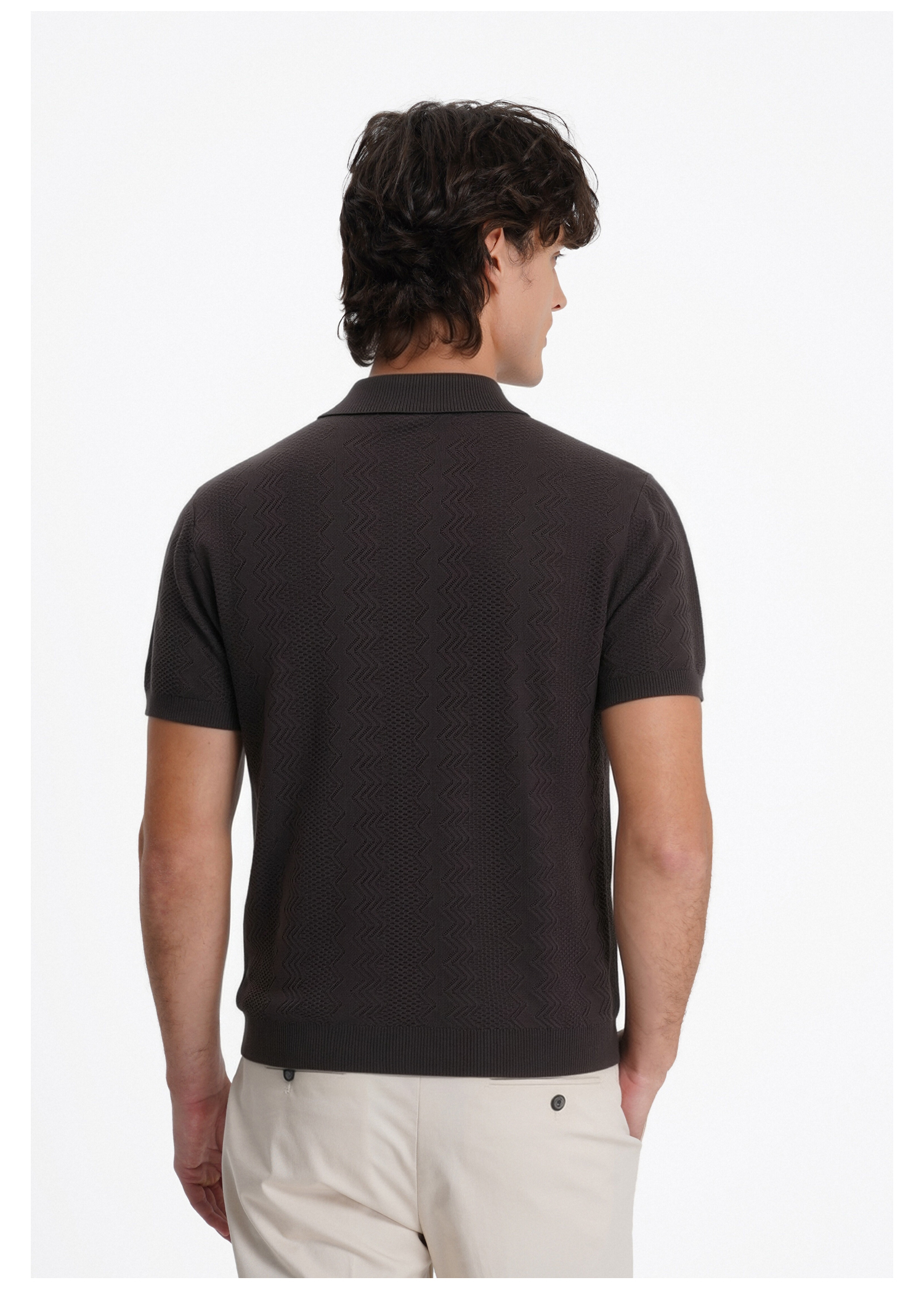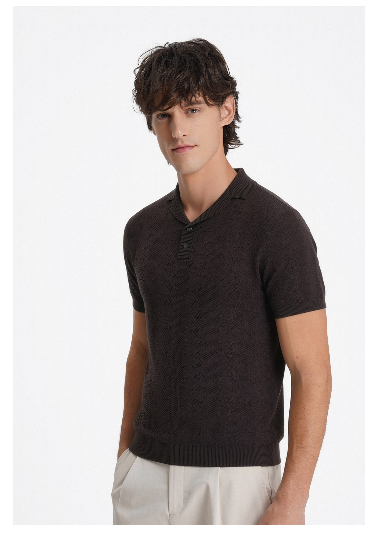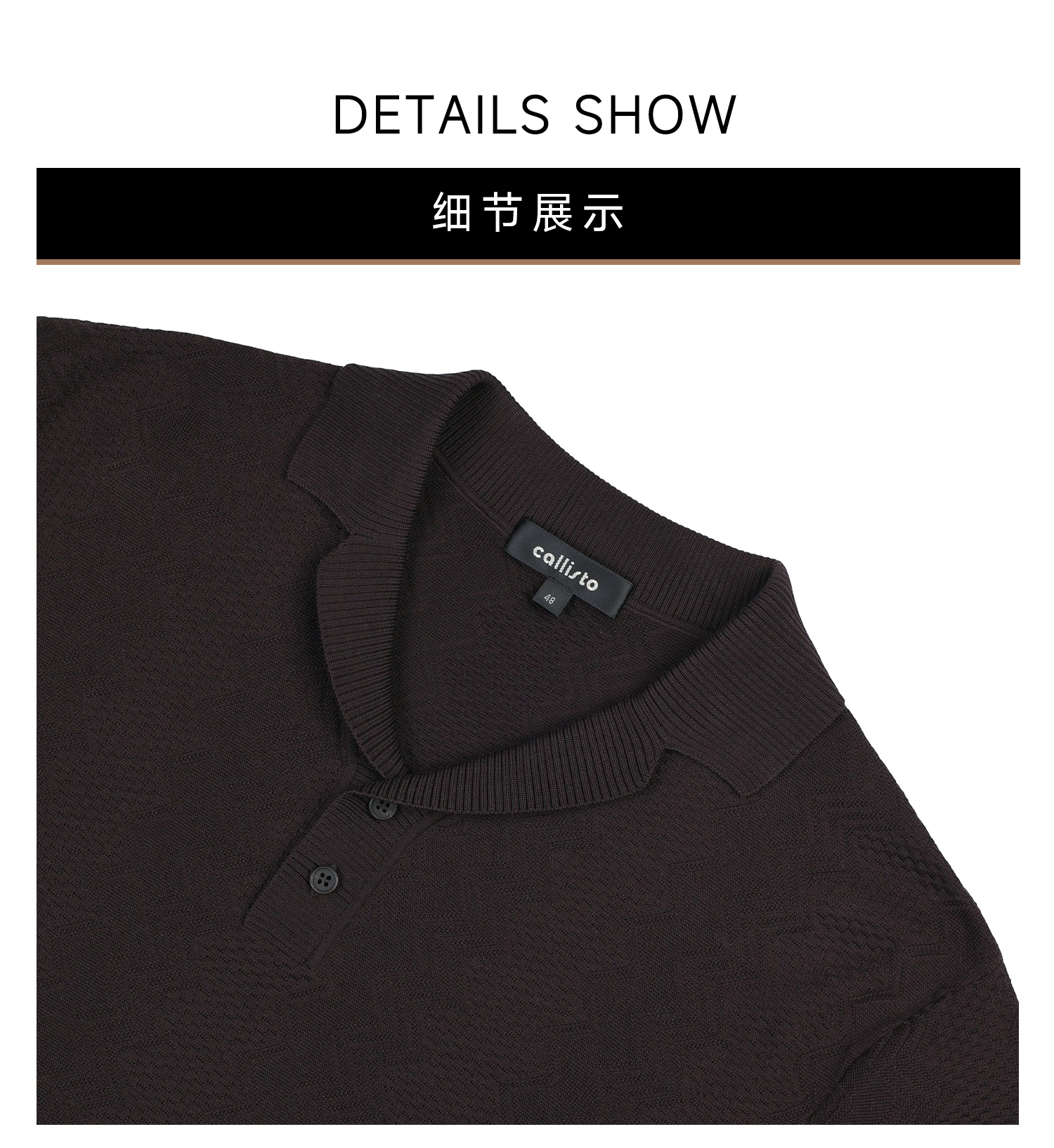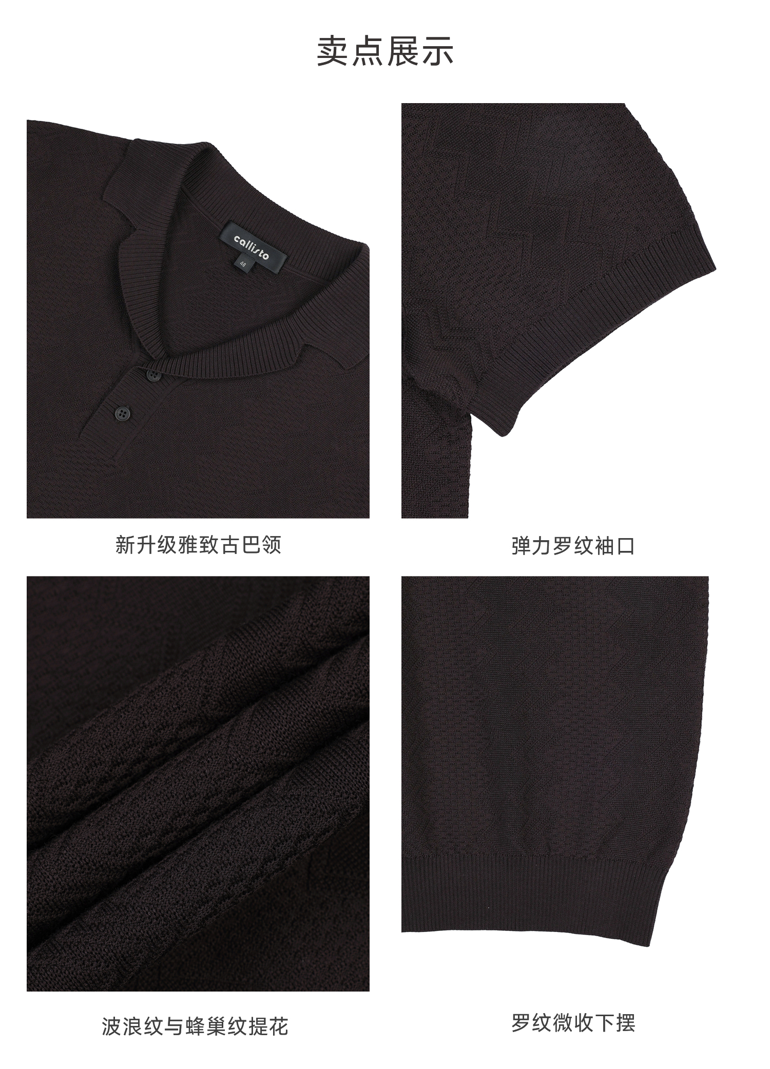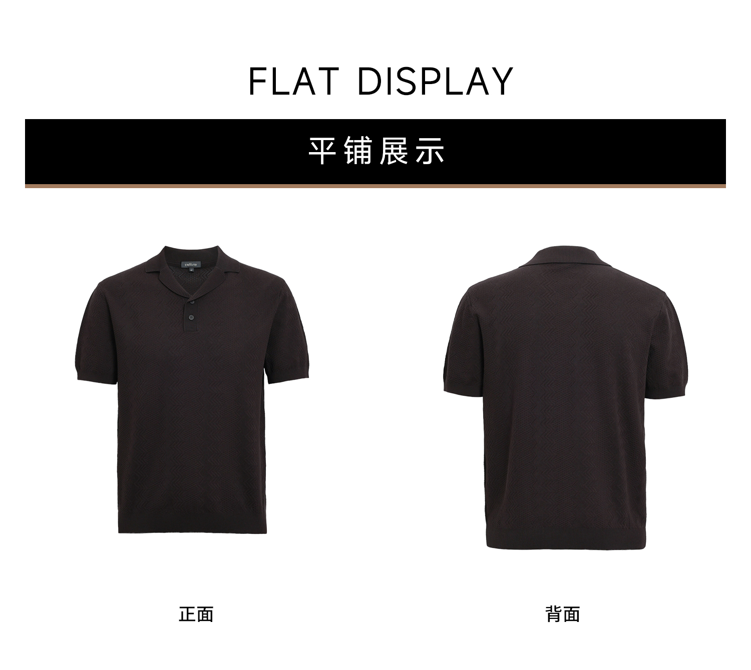 callisto咖色古巴领波浪蜂巢纹棉混纺T恤