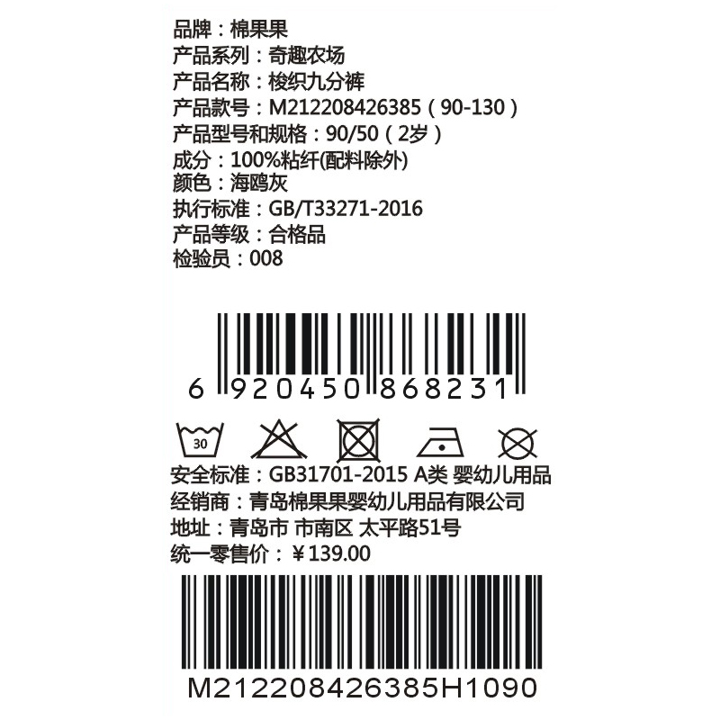 棉果果夏季新品男童人棉梭织九分裤M212208426385