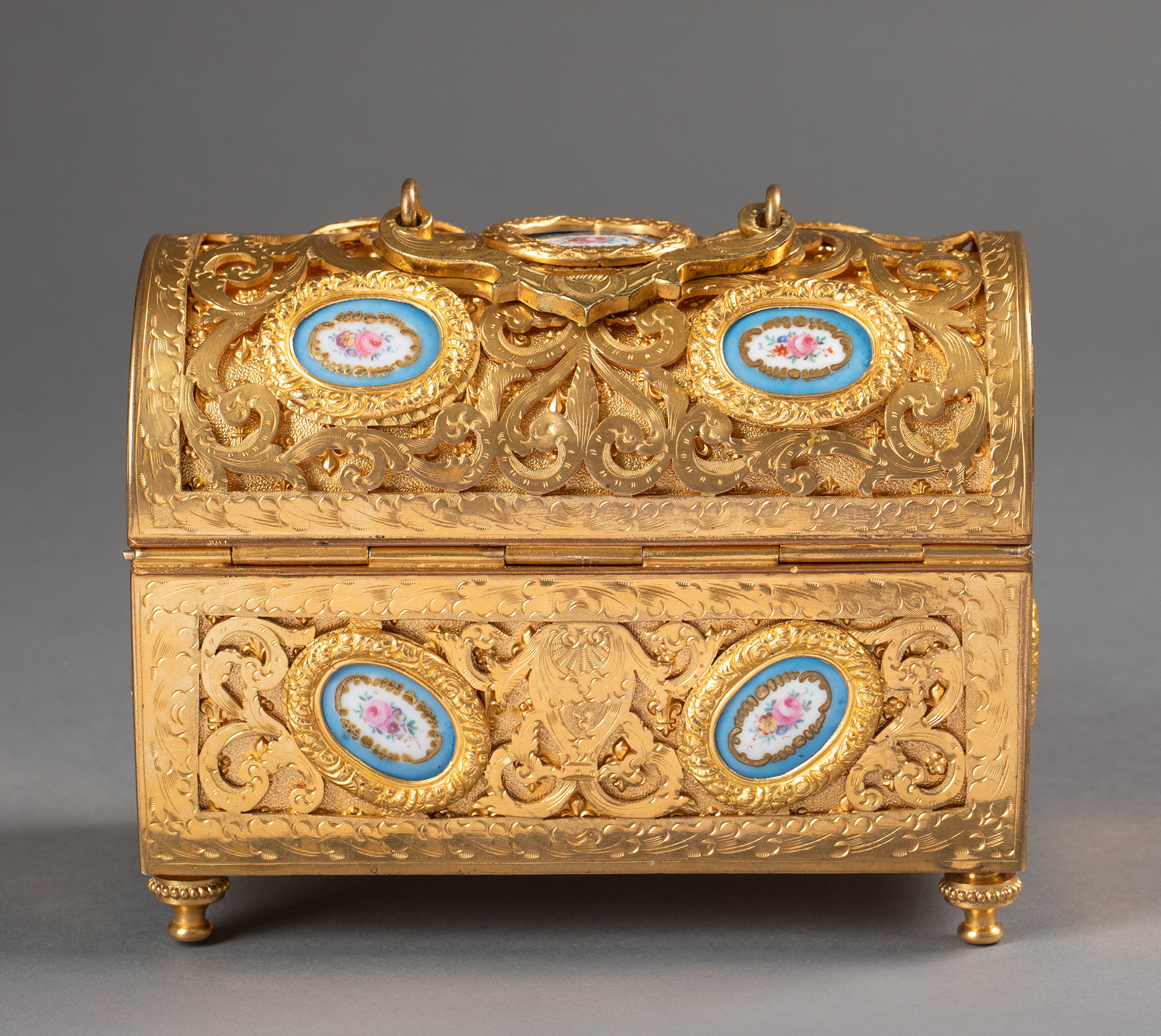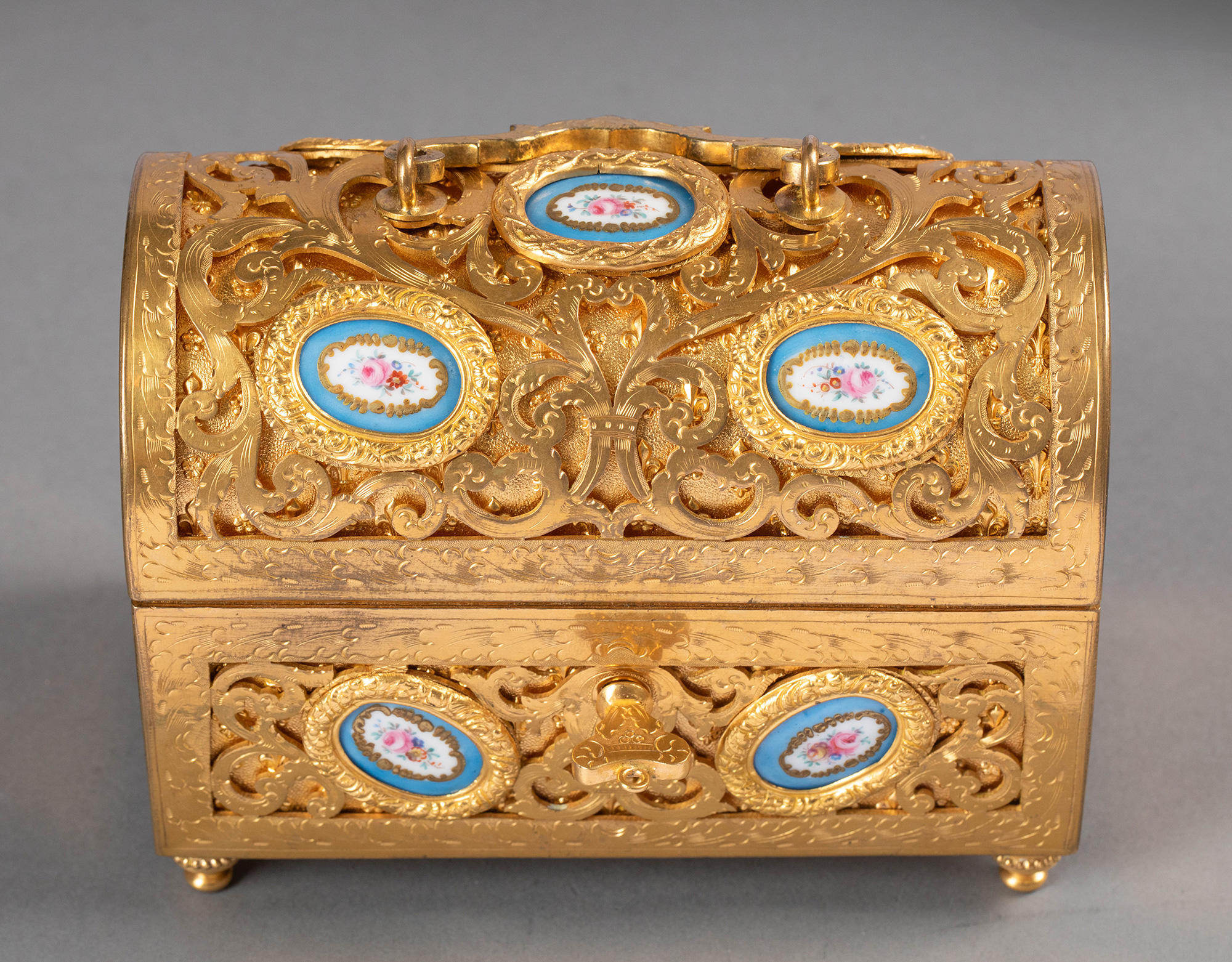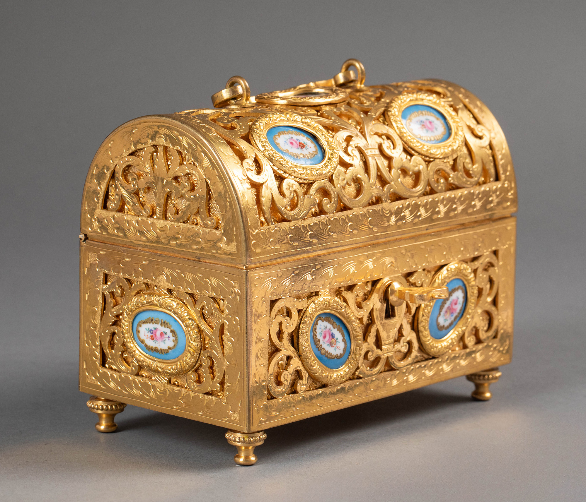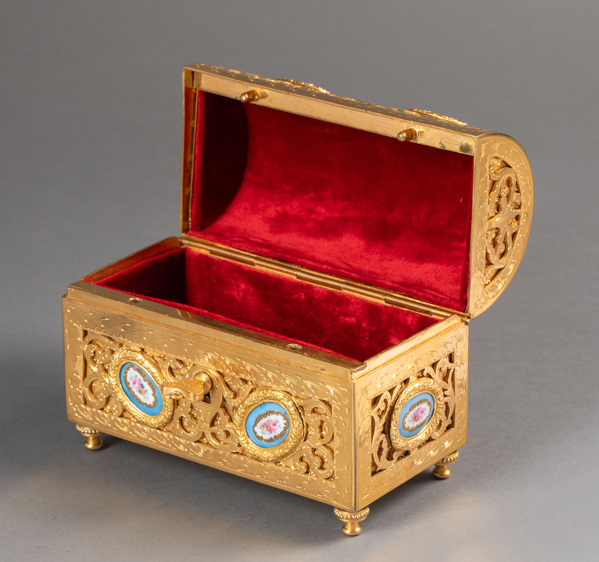 20世纪法国出品古典卷叶纹铜鎏金精雕镶嵌花卉主题手绘瓷面画珍宝盒