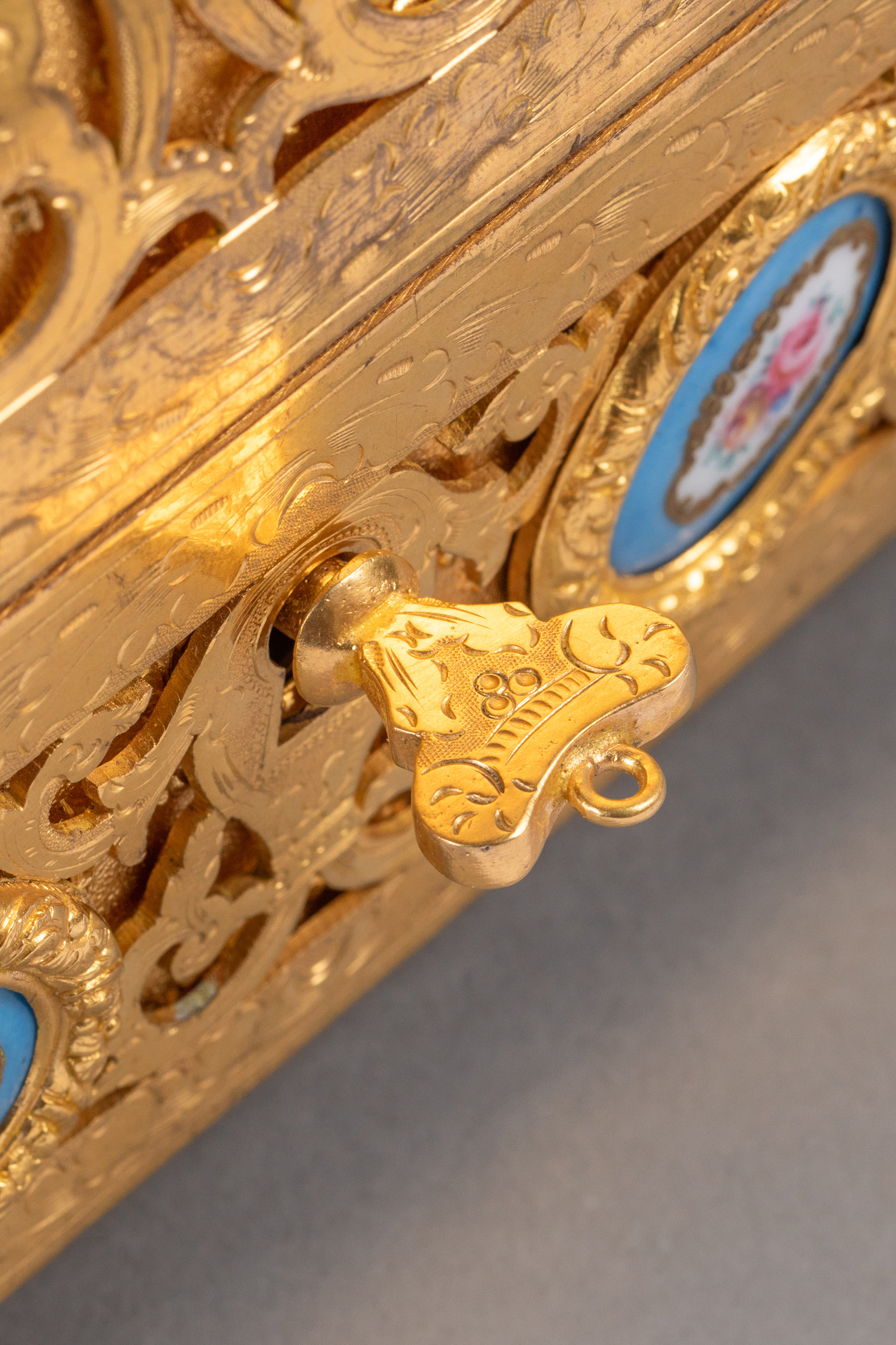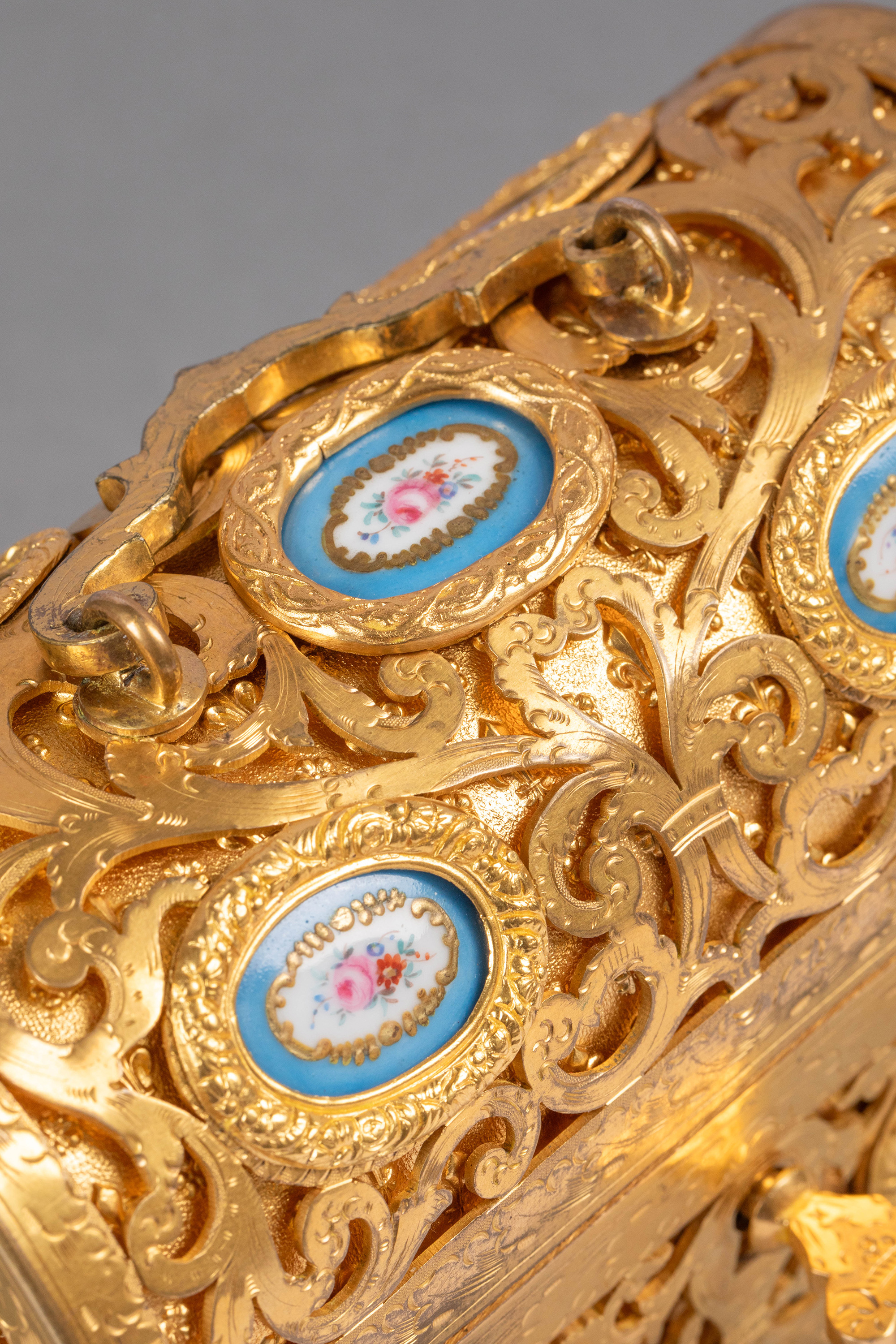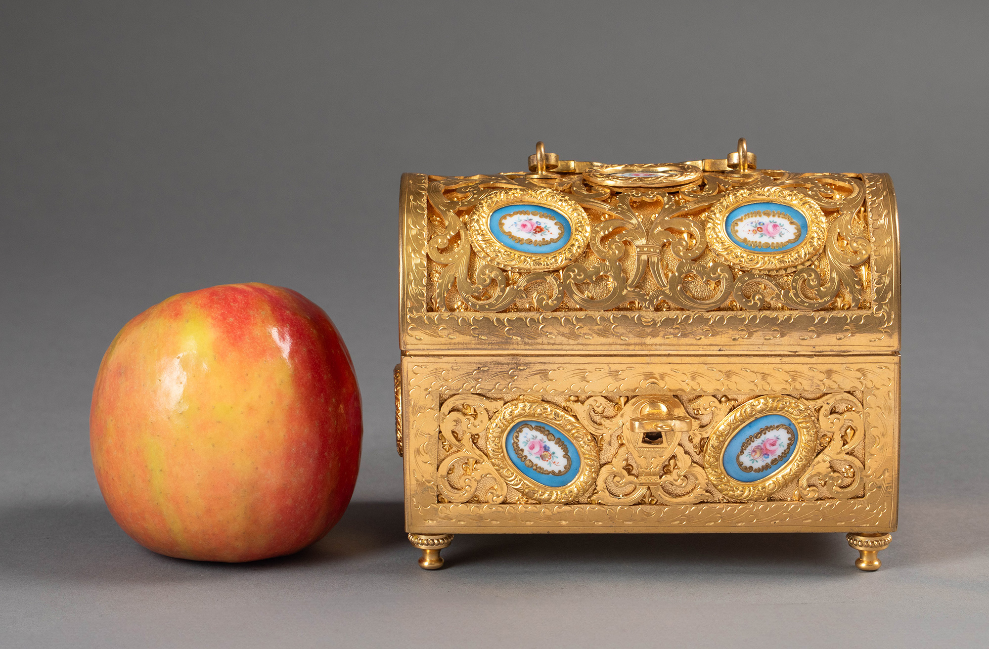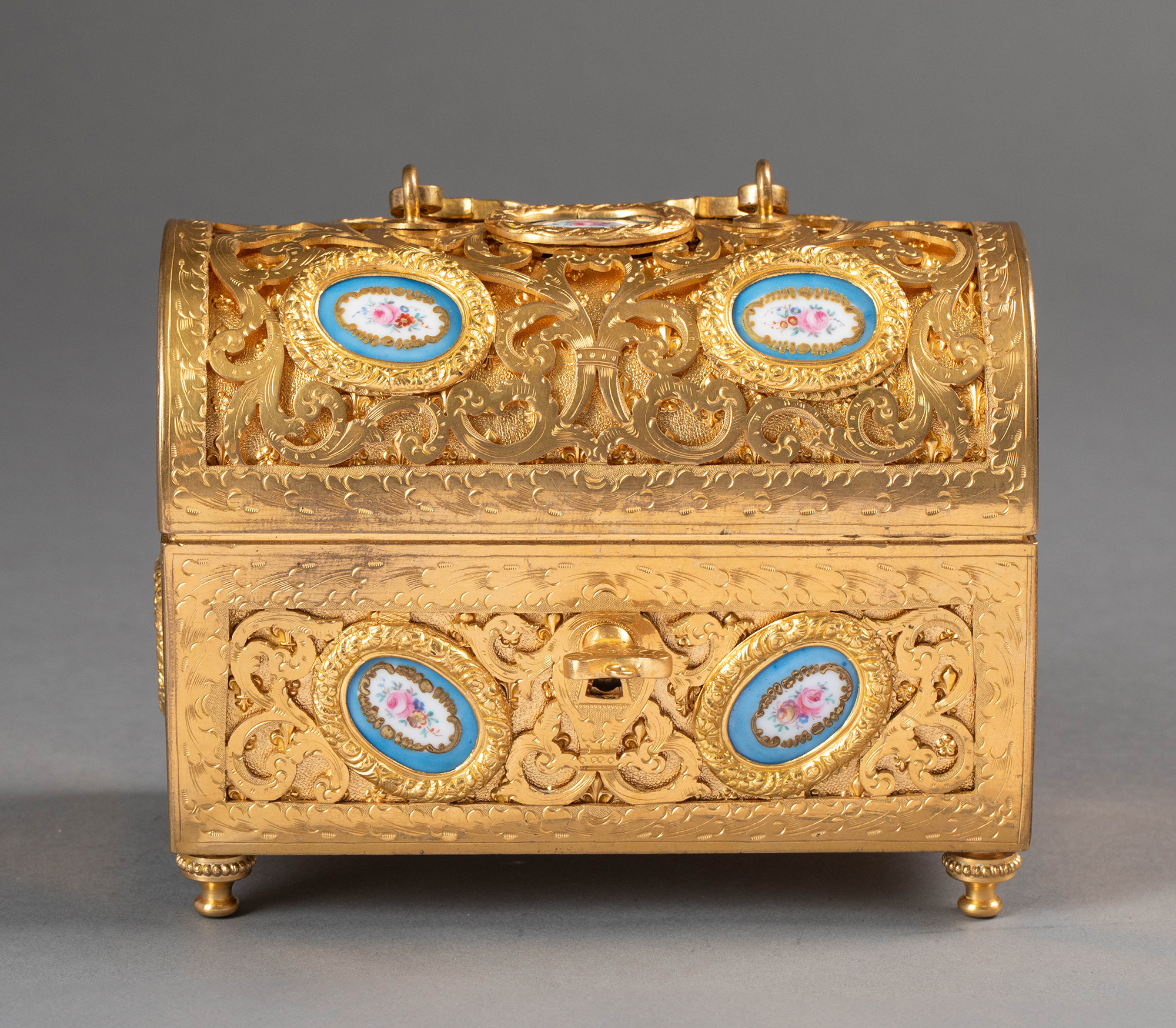 20世纪法国出品古典卷叶纹铜鎏金精雕镶嵌花卉主题手绘瓷面画珍宝盒