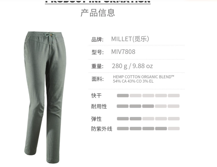 【159秒!实体店现货】MILLET觅乐 女款春秋攀岩裤棉麻混纺攀岩长裤排汗快干裤MIV7808