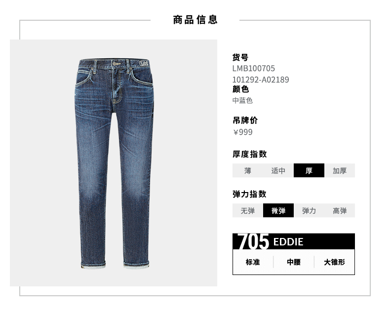 Lee商场同款22秋冬新品男中蓝705标准磨毛牛仔裤LMB100705101-189