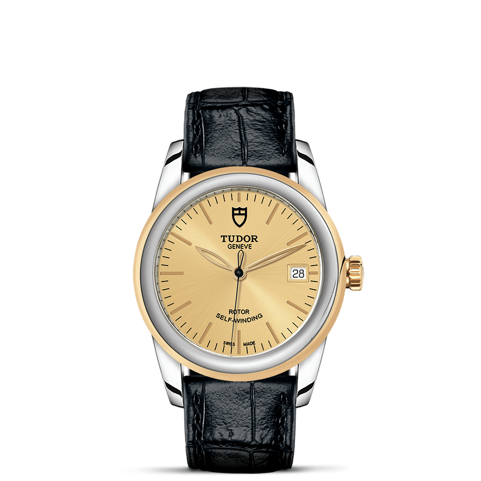 旋入式上链錶冠,饰以帝舵表标志;精钢覆有0.1毫米18K黄金薄层