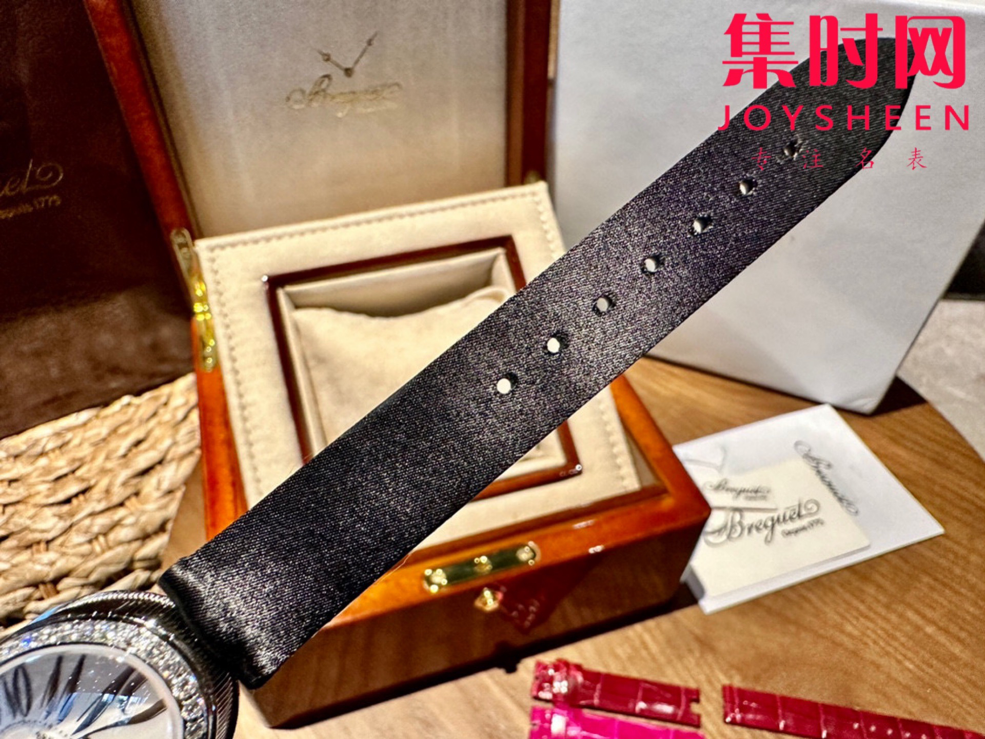 表带:美洲鳄鱼皮表带和绢丝表带(小羊皮包裹丝绸)表带如肌肤般温柔,宝玑式折叠表扣秀雅精巧。
