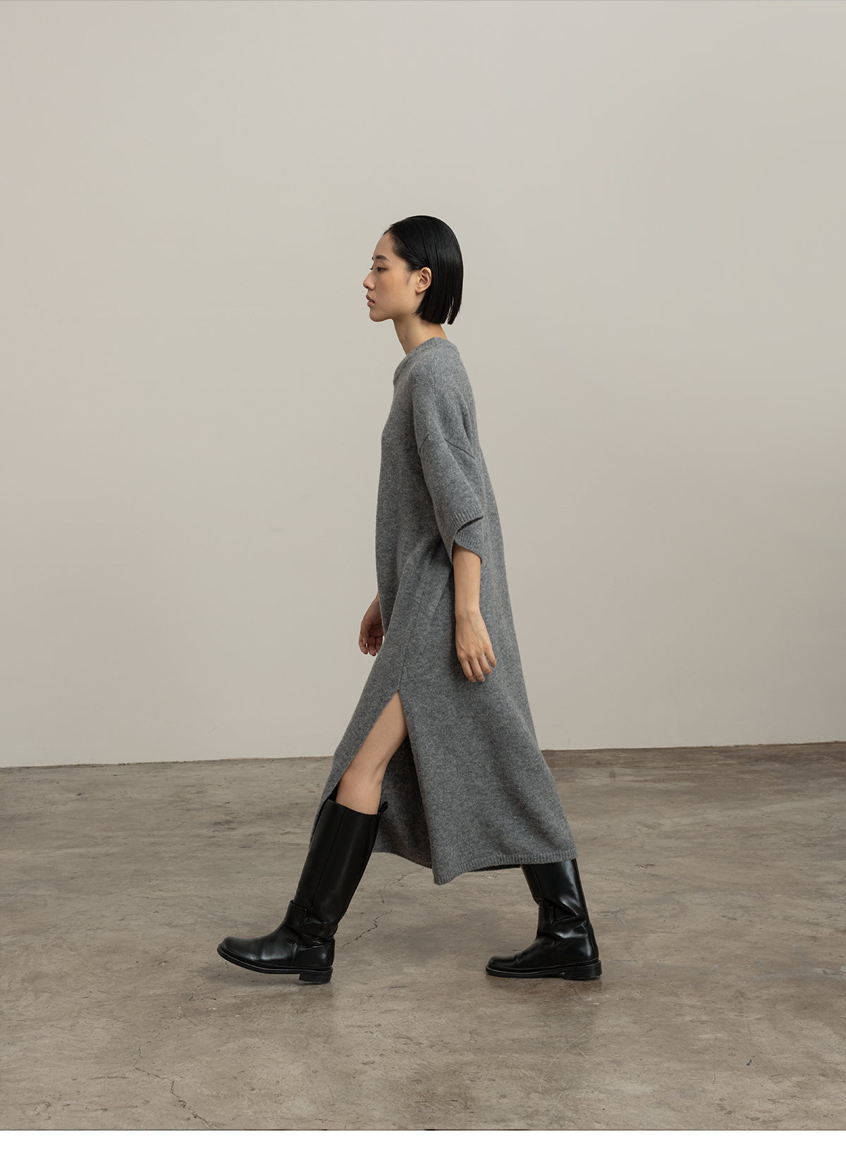 322工房新意短毛绒圈圈羊毛短袖针织连衣裙2023秋冬廓形长裙B139