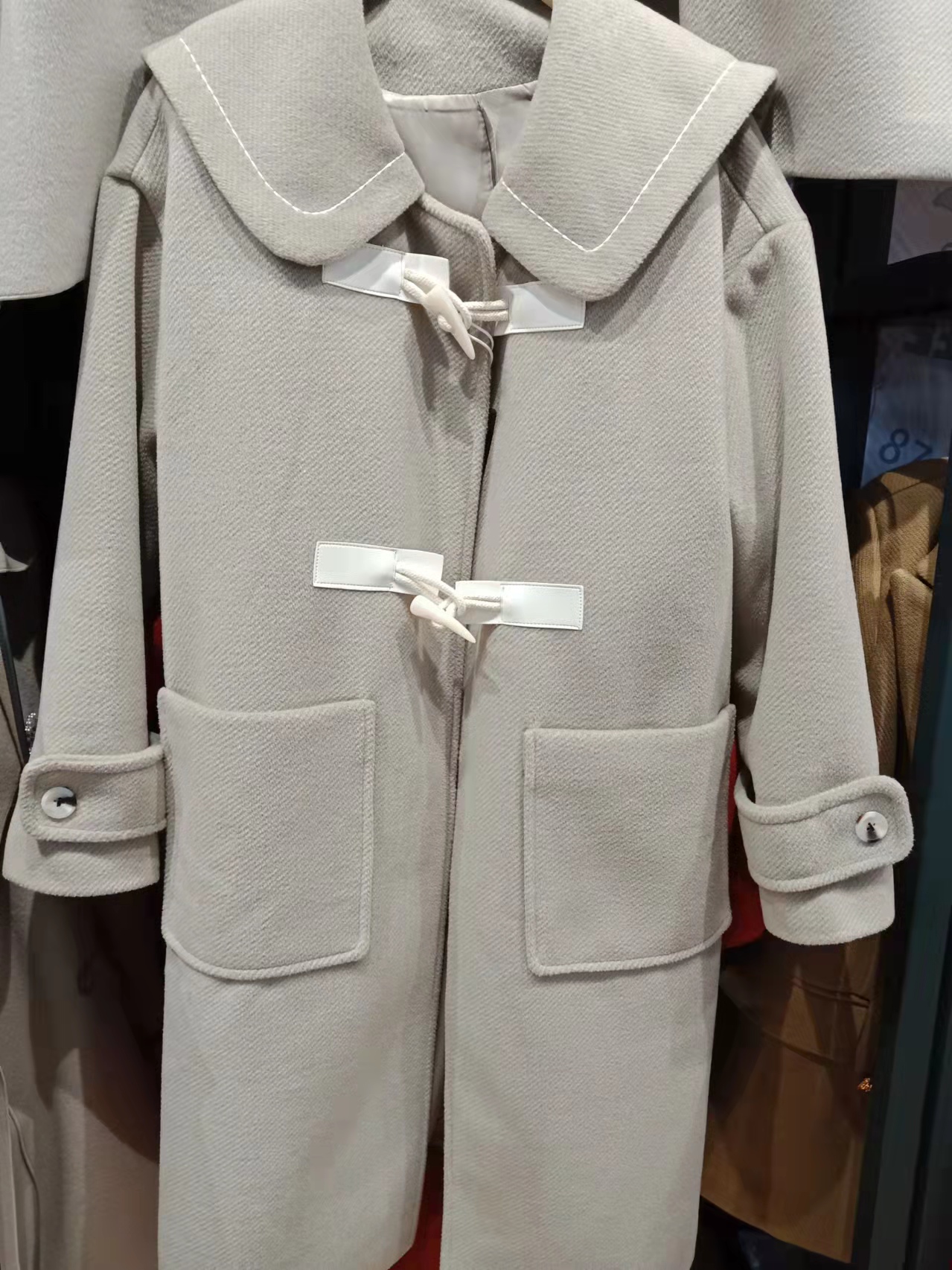特点:长款双面羊绒,舒适保暖,初春季节的首选,落肩的设计,宽松时尚