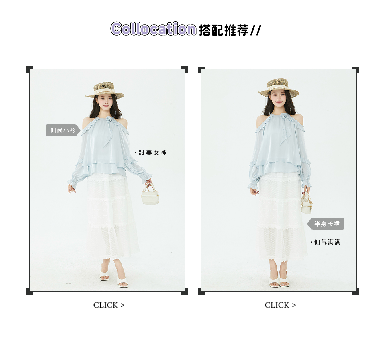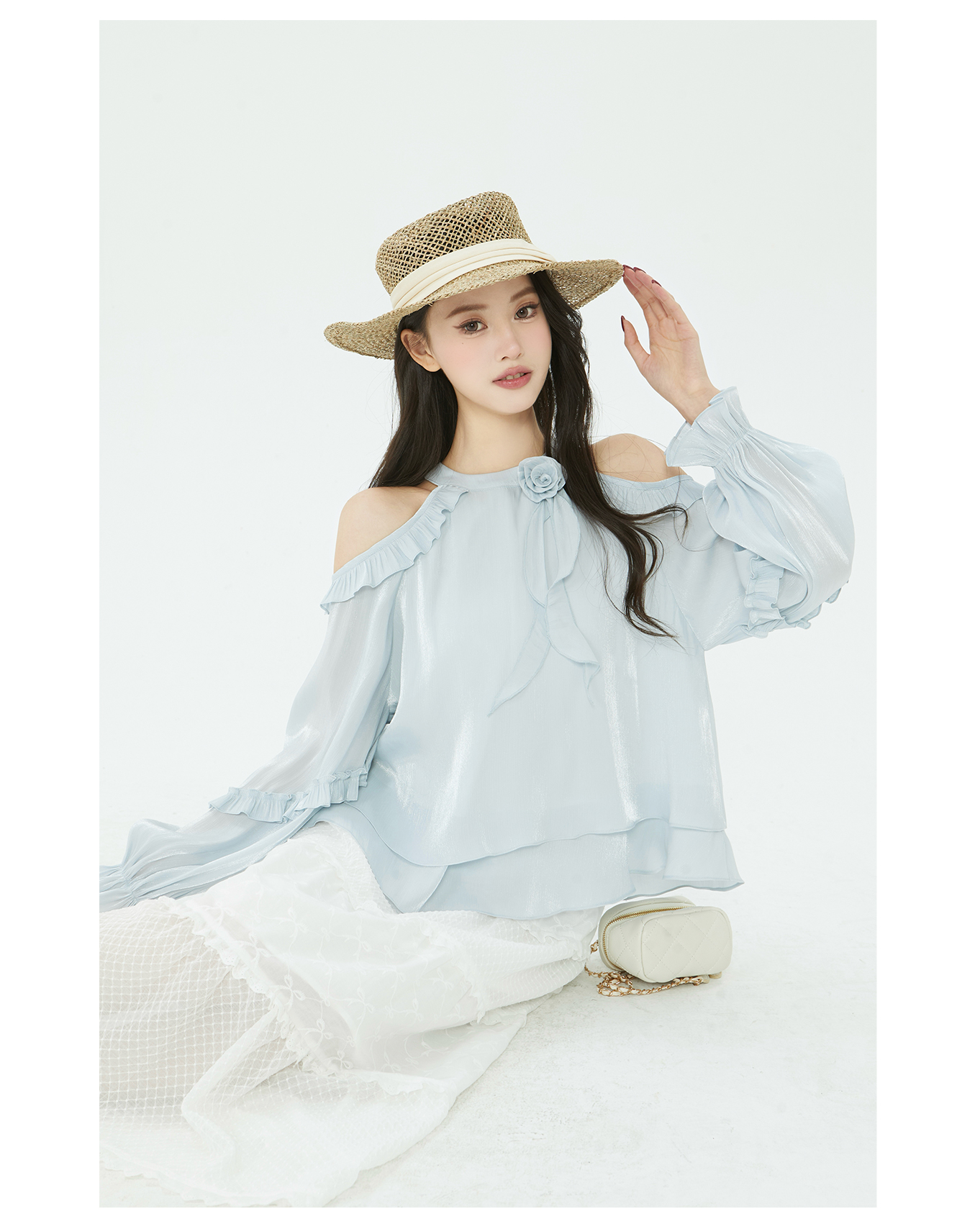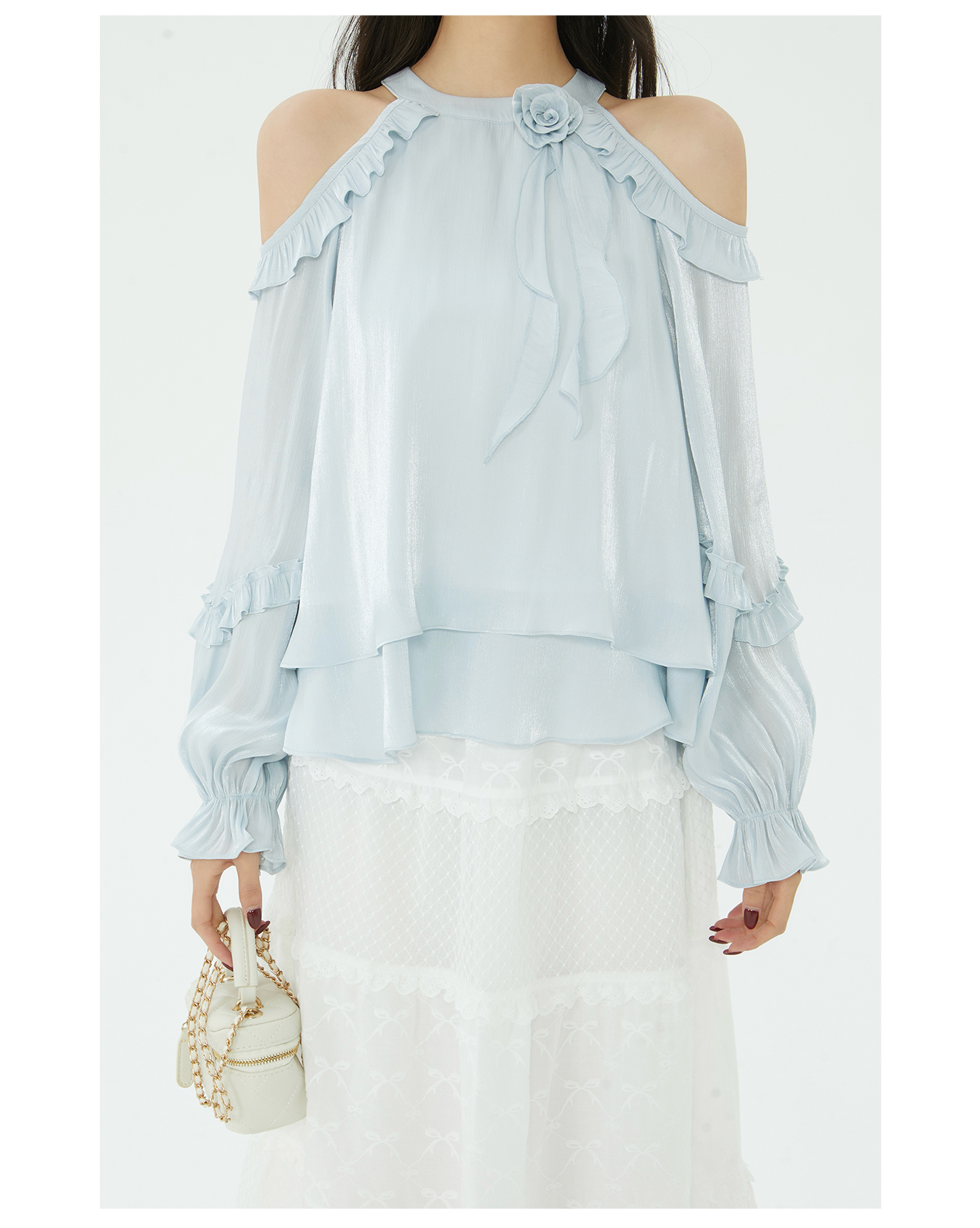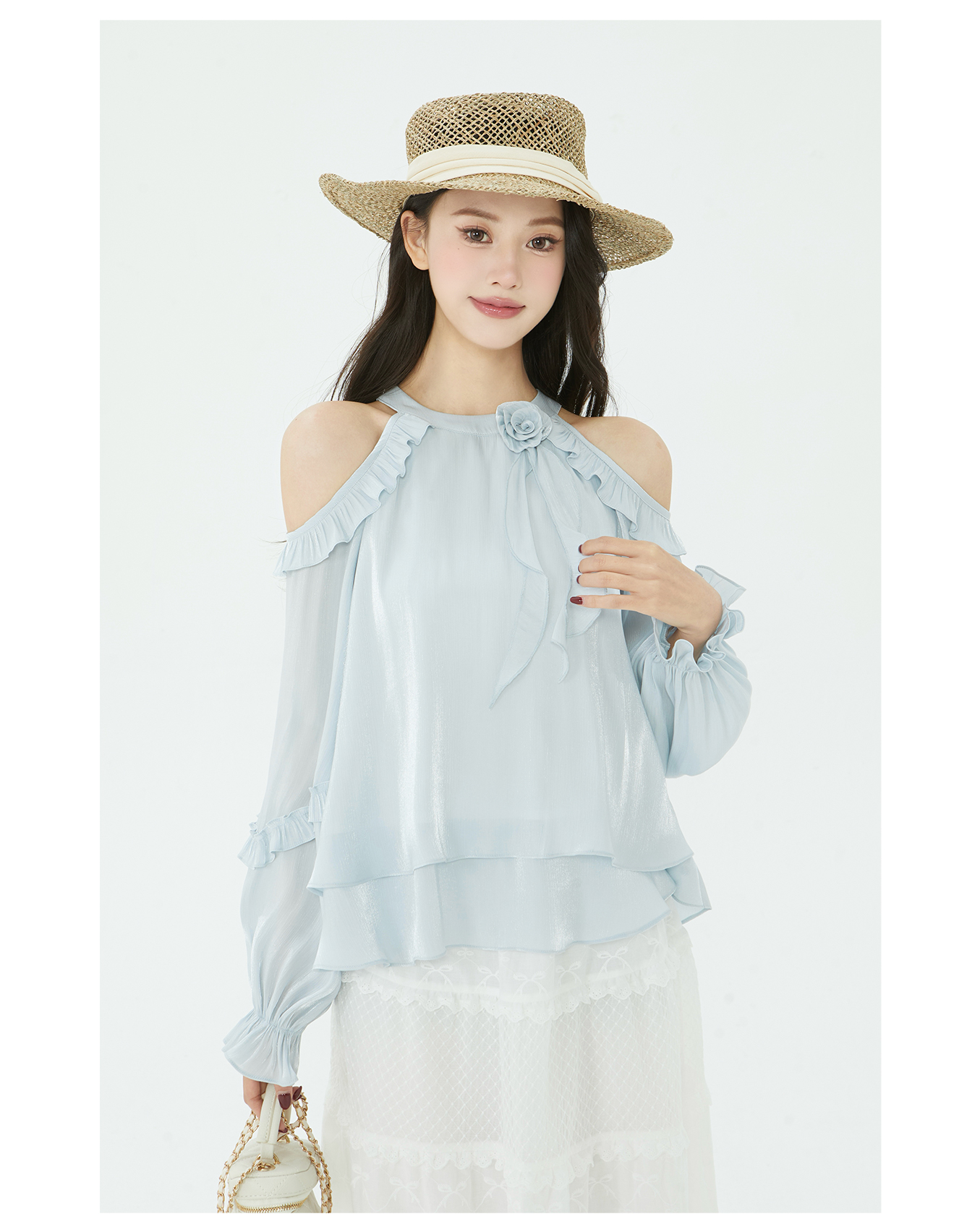 P&X设计师2025夏季一字肩挂颈露肩荷叶边雪纺衫825228073 蓝色