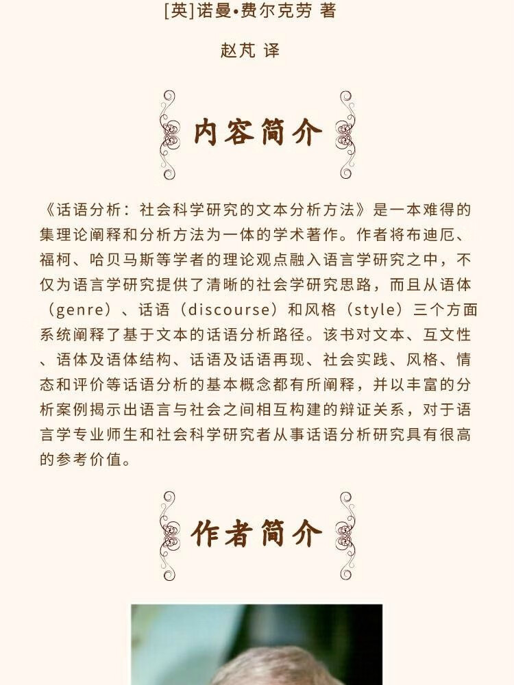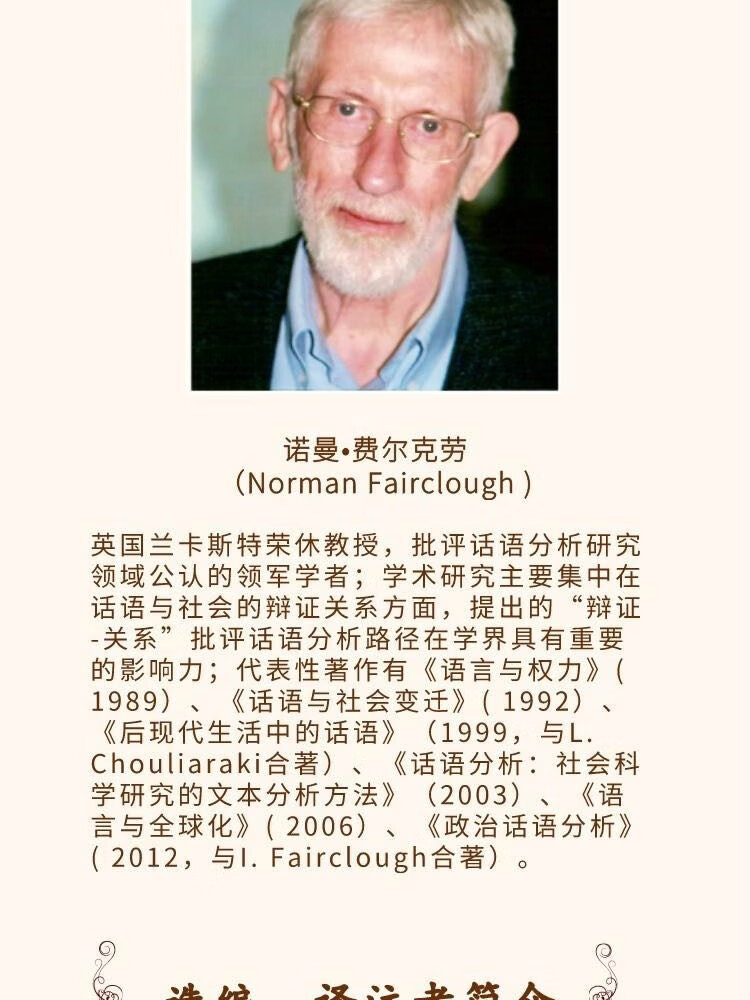 诺曼•费尔克劳( Norman Fairclough ),英国兰卡斯特荣休教授,批评话语分析研究领域公认的领军学者;学术研究主要集中在话语与社会的辩证关系方面,提出的“辩证-关系”批评话语分析路径在学界具有重要的影响力;代表性著作有《语言与权力》( 1989 )、《话语与社会变迁》( 1992)、《后现代生活中的话语》( 1999,与L. Chouliaraki合著)、《话语分析――社会科学研究的文本分析方法》(2003)、《语言与全球化》( 2006)、《政治话语分析》( 2012,与I. Fairclough合著)。
