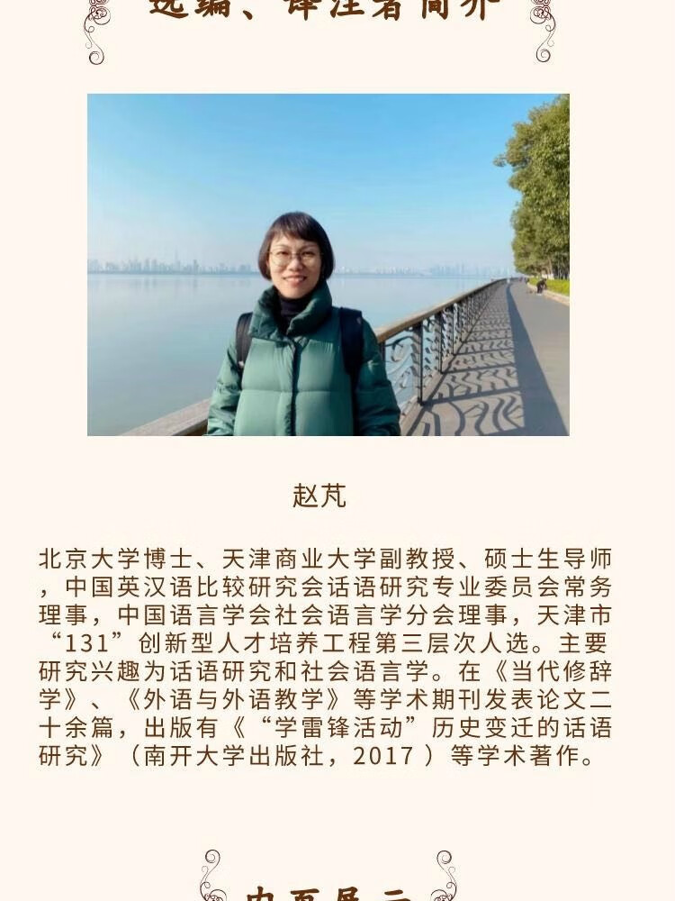 赵芃,北京大学博士、天津商业大学副教授、硕士生导师,中国英汉语比较研究会话语研究专业委员会常务理事,中国语言学会社会语言学分会理事,天津市“131”创新型人才培养工程第三层次人选。主要研究兴趣为话语研究和社会语言学。在《当代修辞学》、《外语与外语教学》等学术期刊发表论文二十余篇,出版有《“学雷锋活动”历史变迁的话语研究》(南开大学出版社,2017 )等学术著作。