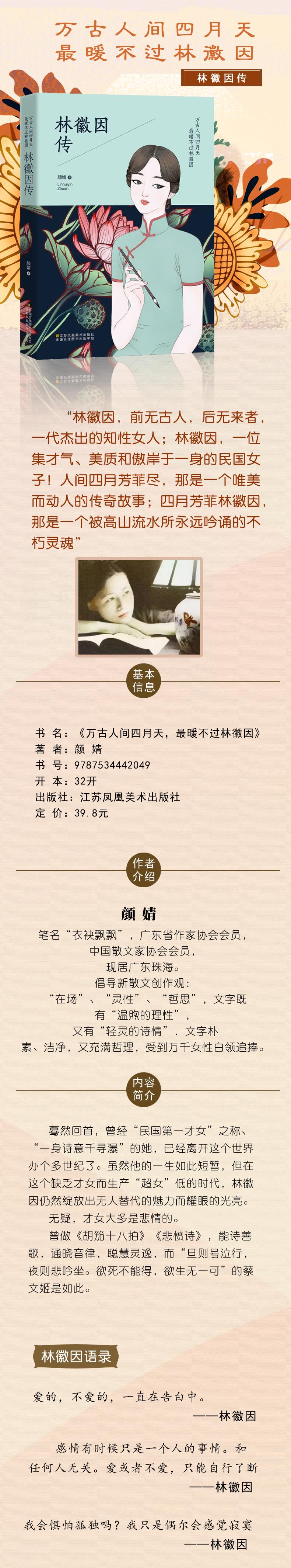 "庄严肃穆的中华人民共和国国微、雄伟的人民英雄纪念碑、举世闻名的景泰蓝工艺,都是这位美丽智慧的女子留给国人的瑰宝,可是公众却往往因徐志摩而记住她,这不能不说是一个悲哀。 于是颜婧编写的这本《万古人间四月天最暖不过林徽因》打破了这种固定思维,采取新颖的,以建筑家、诗人、作家、魅力女人、母亲以及至情至性的普通人等身份为切入角度,为读者展现了林徽因真实动人的一生。"