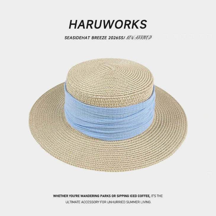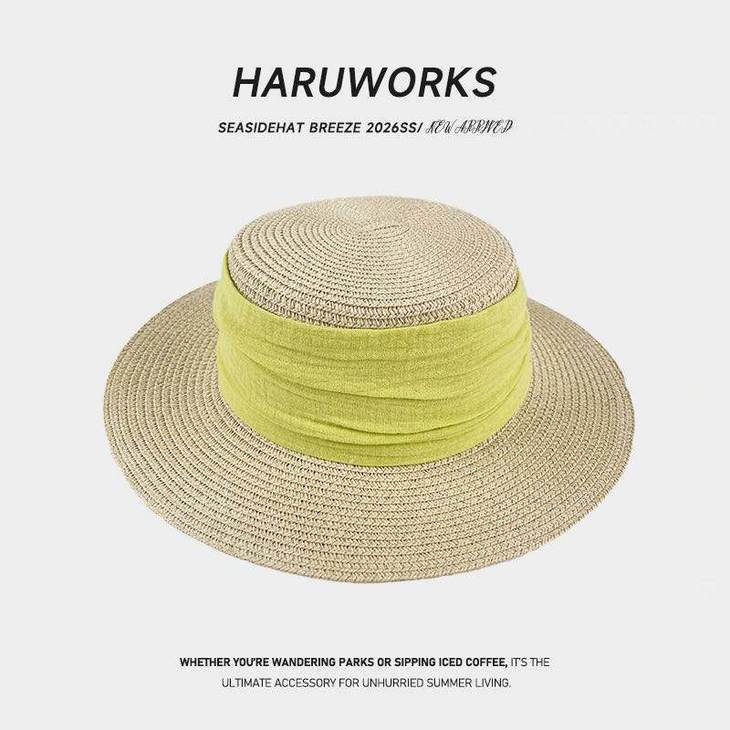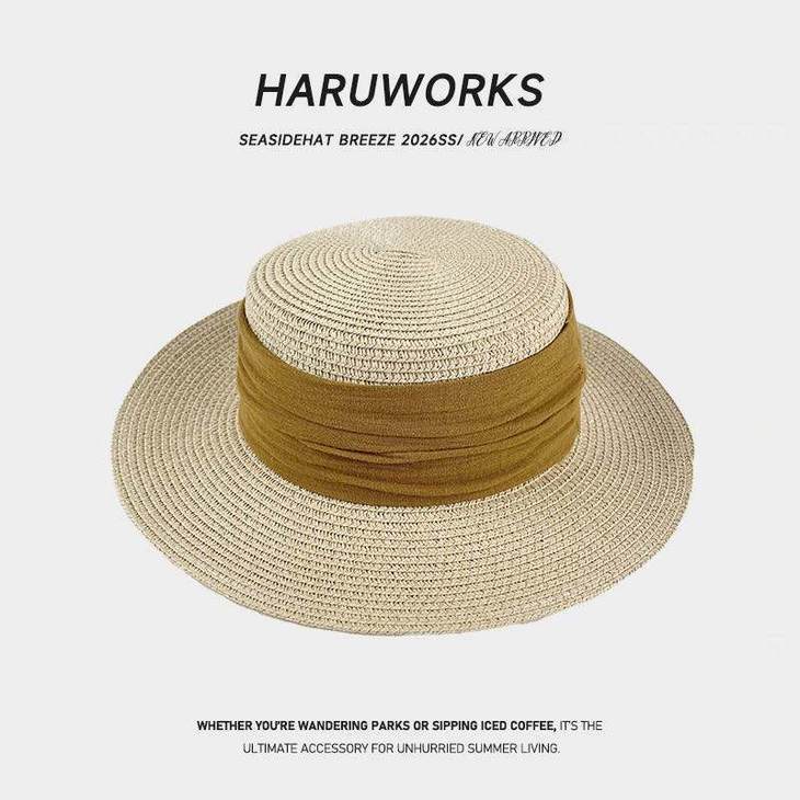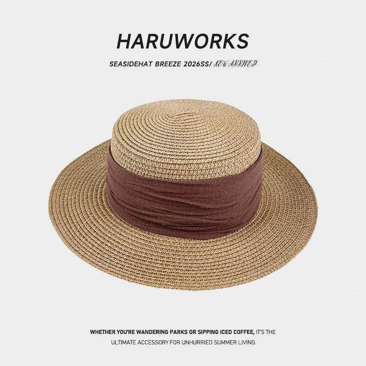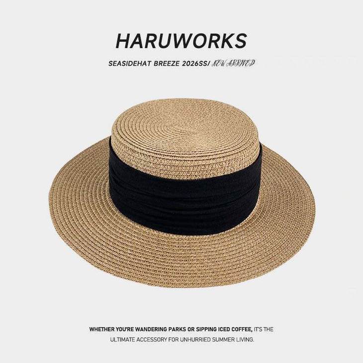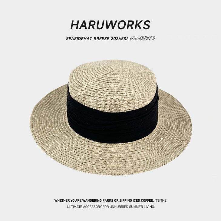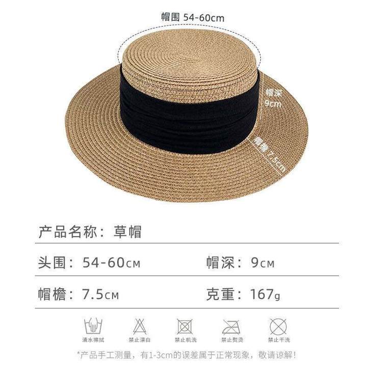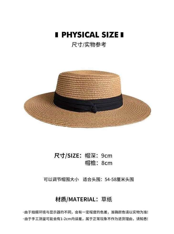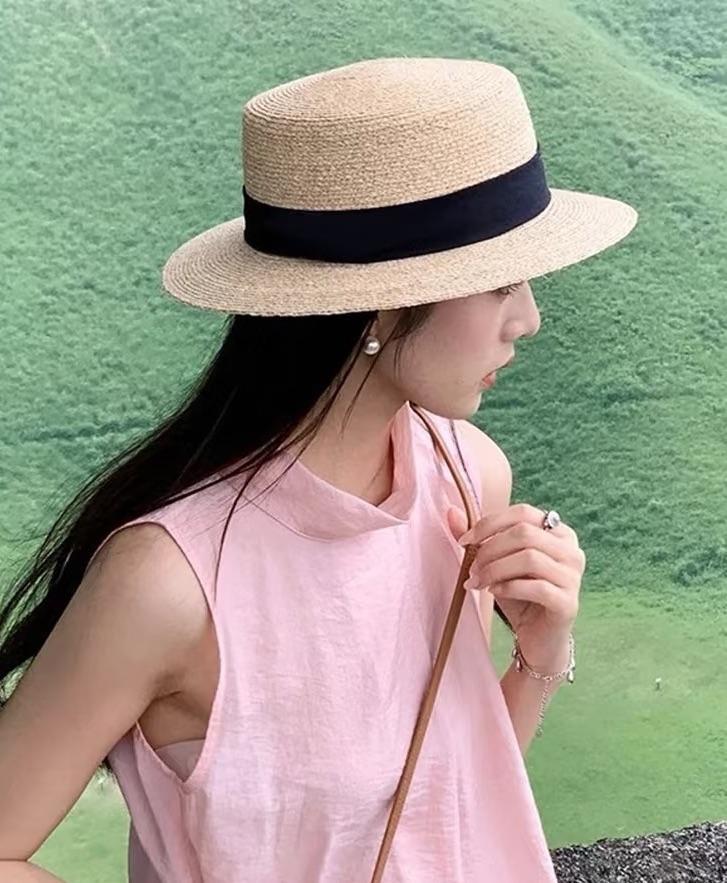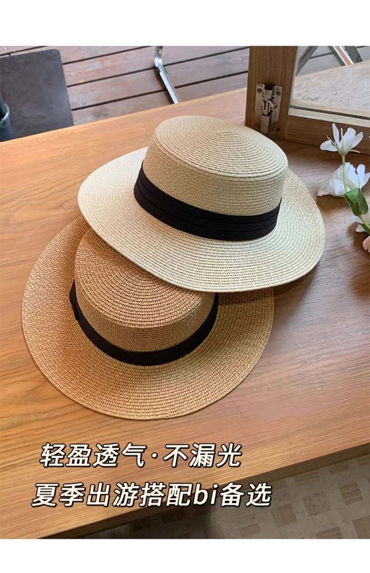 D508 法式织带平顶草帽(米色绿带、米色黑带、米色蓝带、米色姜黄、卡其色黑带、其色咖啡)