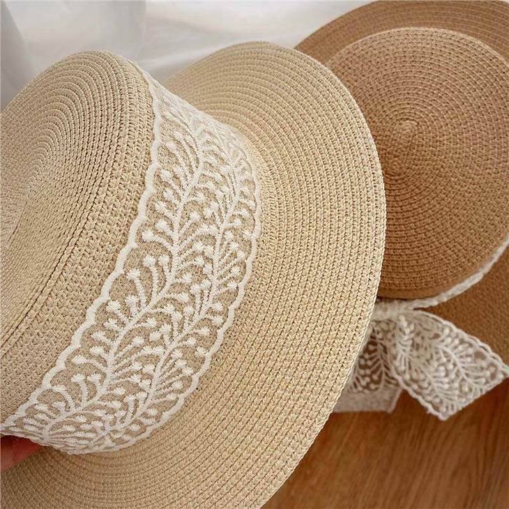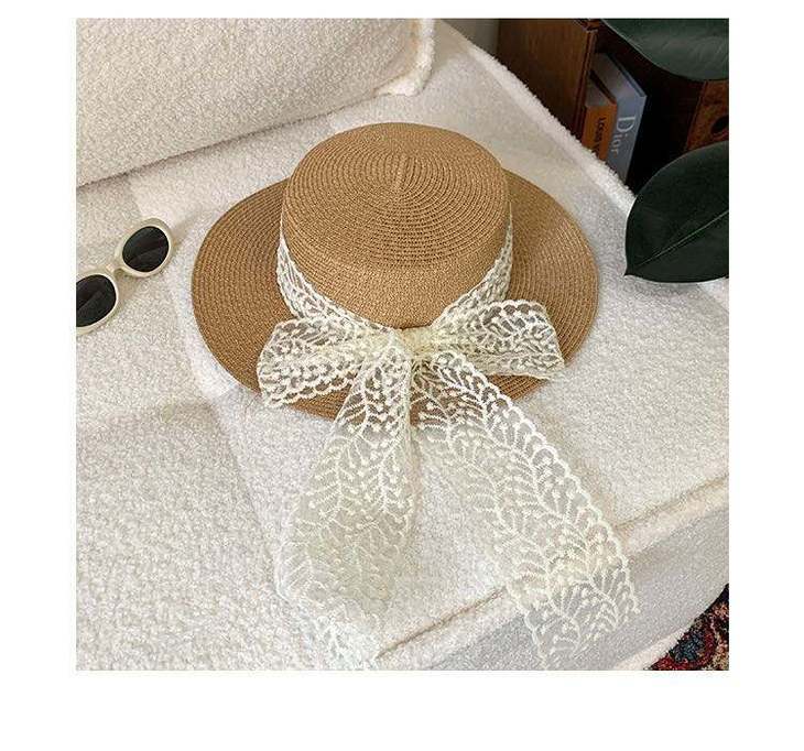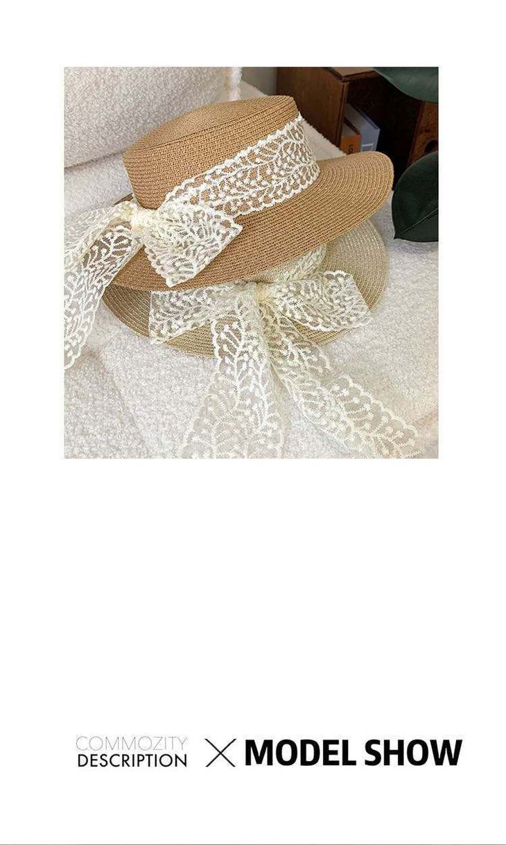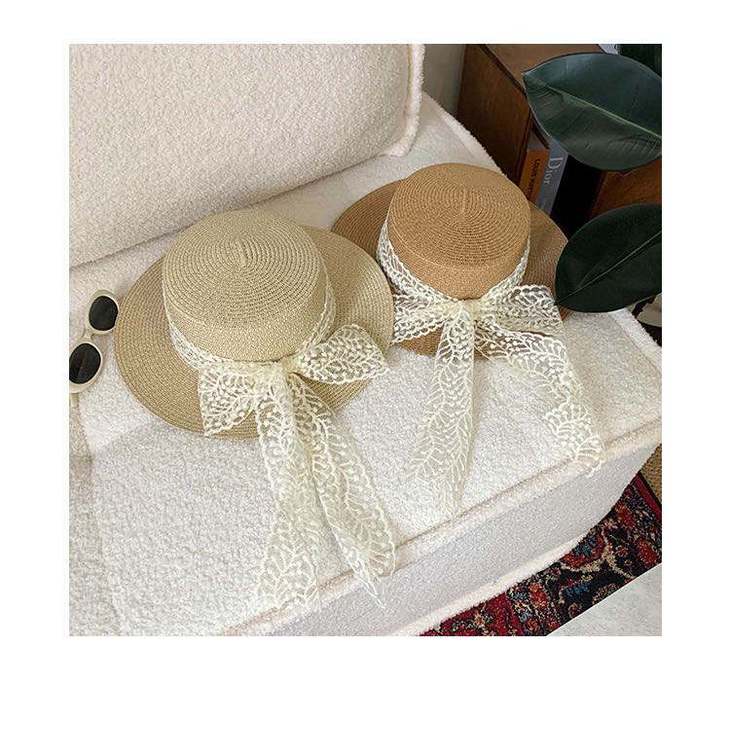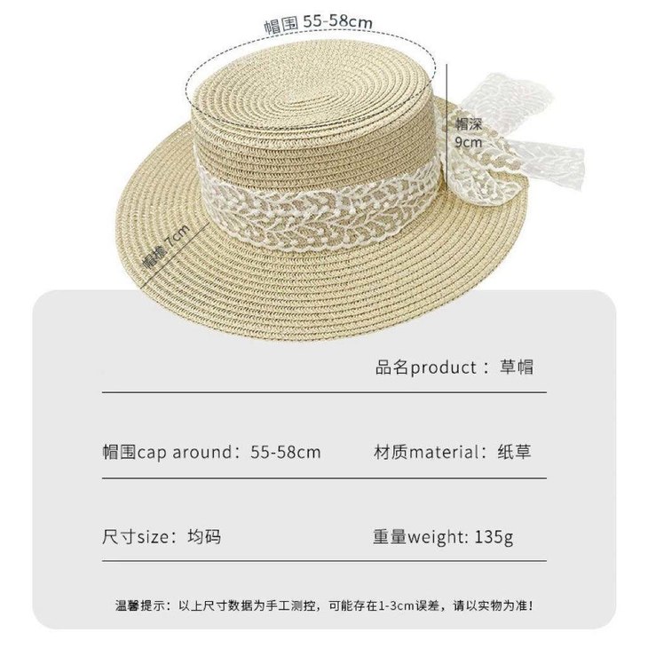 D359 日系田园风蕾丝平顶草帽(米色、棕色)