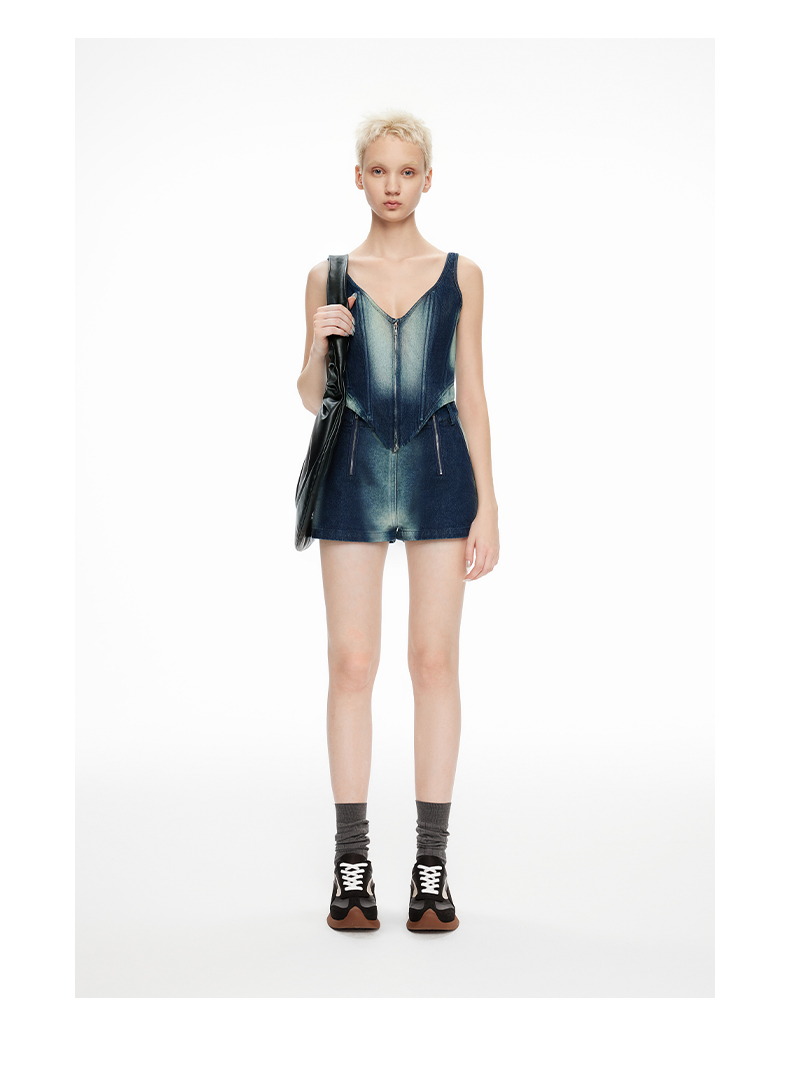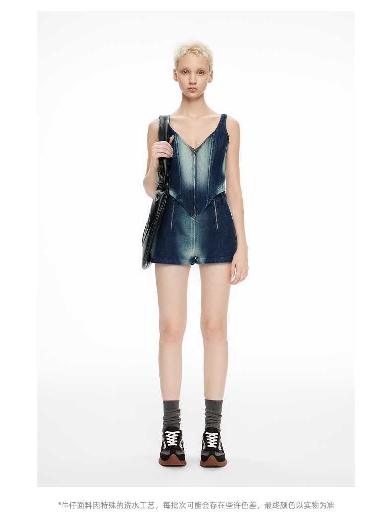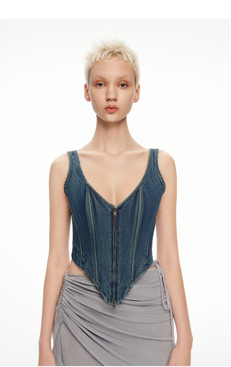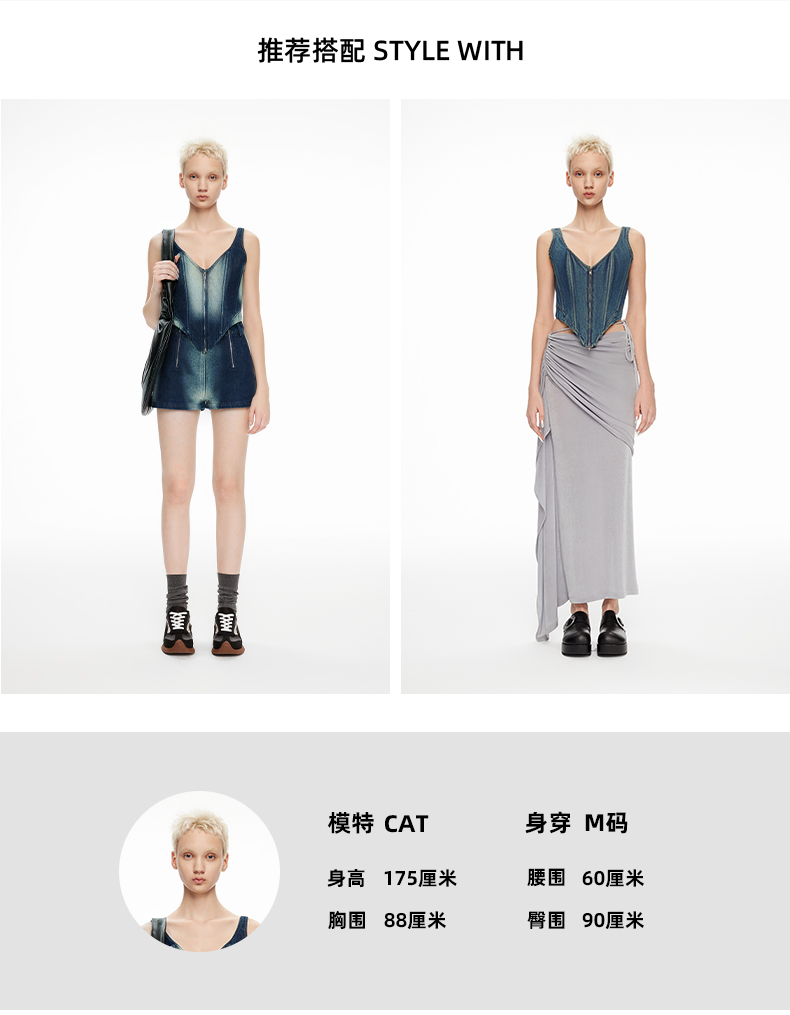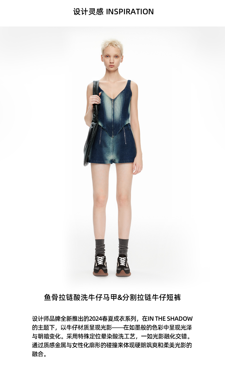 lost in echo2024春季新品设计师款鱼骨拉链酸洗牛仔马甲短裤套装