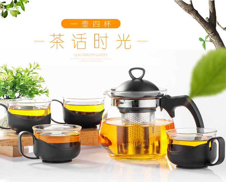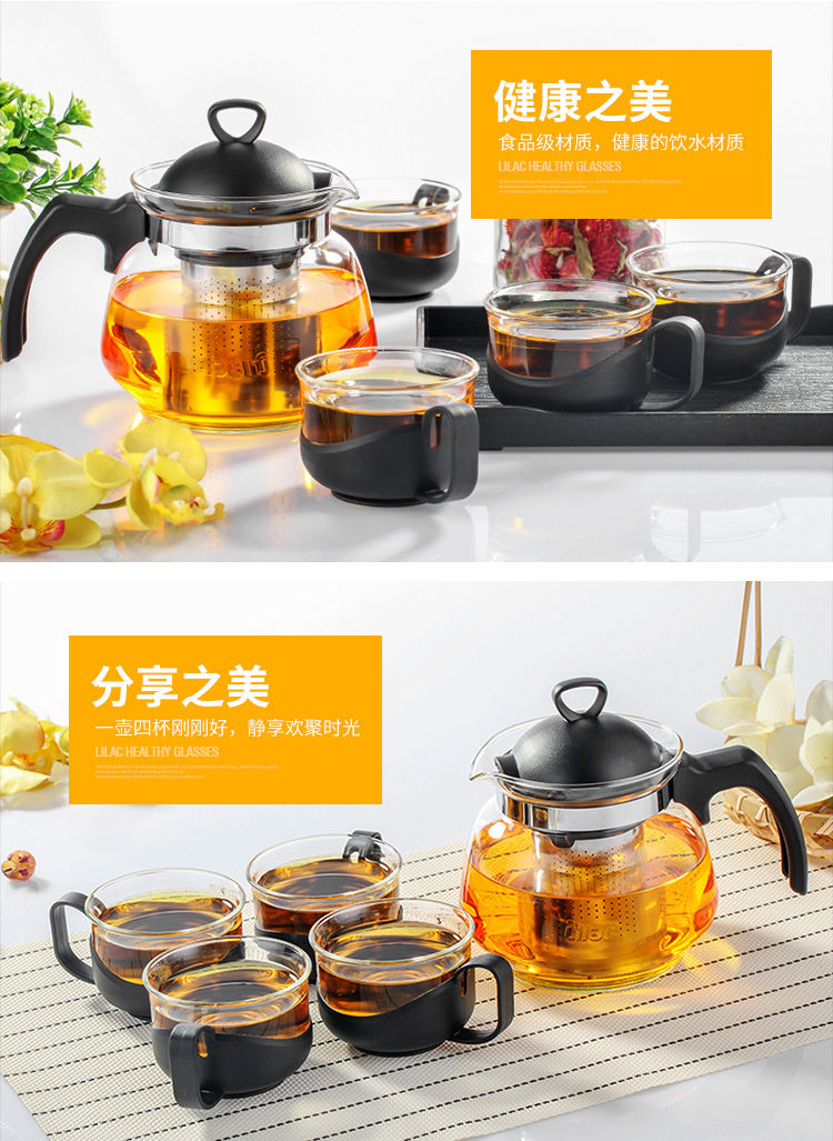 紫丁香 耐热玻璃加厚茶壶茶杯304不锈钢滤网五件套装700ml S331