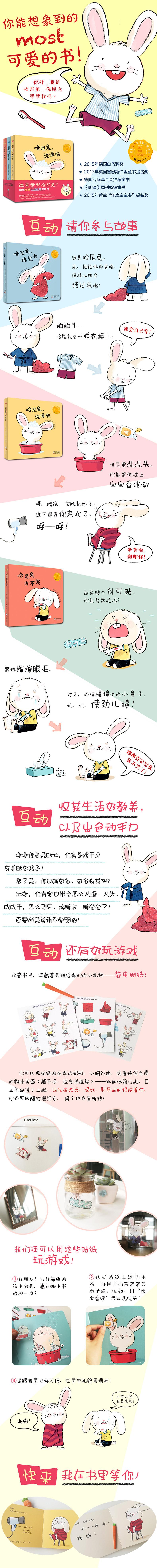《谁来帮帮哈尼兔?》是一套少见的创意互动纸板书,以新鲜的互动方式为0-3岁小读者讲述了3个好玩的生活教养小故事。有趣的文字一直在邀请小读者的参与——请按照文字说明来完成各种小任务,帮帮哈尼兔吧!帮什么呢?帮哈尼兔洗头、洗澡,刷牙、入睡,擦擦眼泪、拍拍灰……哈尼兔变干净了,被拍拍入睡,摔倒之后有人安慰,好开心!宝宝你真棒,谢谢你!《哈尼兔,睡觉啦》睡觉时间到了!读这本书的小朋友,请你轻轻拍拍哈尼兔的肩膀,瞧瞧他会不会转身?啊,他转过来了!接着,请拍拍手,哈尼兔就会跳进睡衣里!再来帮他把枕头拍拍松,帮他盖上小被子……现在,是晚安吻时间!别忘了关灯,这样哈尼兔才能香香地入睡——就像小读者自己一样!晚安,哈尼兔!《哈尼兔,来洗澡》洗澡时间到了!你认识这个喜欢洗头的乖宝宝吗?没错,就是哈尼兔,他已经迫不及待等你叫他了!来,帮他挤上宝宝香波,揉一揉,冲一冲,吹一吹……糟糕,吹风机坏了!现在,只能请你来......