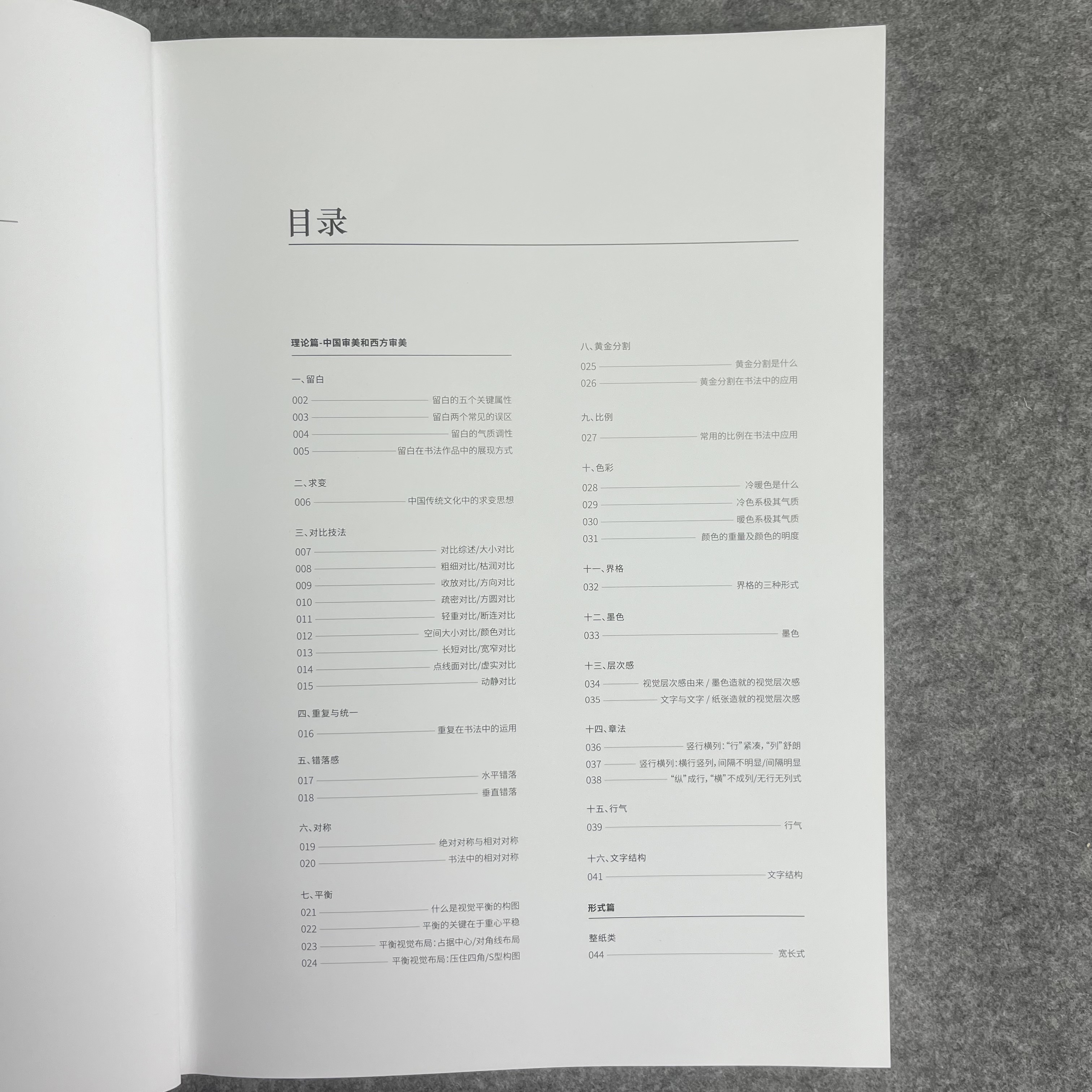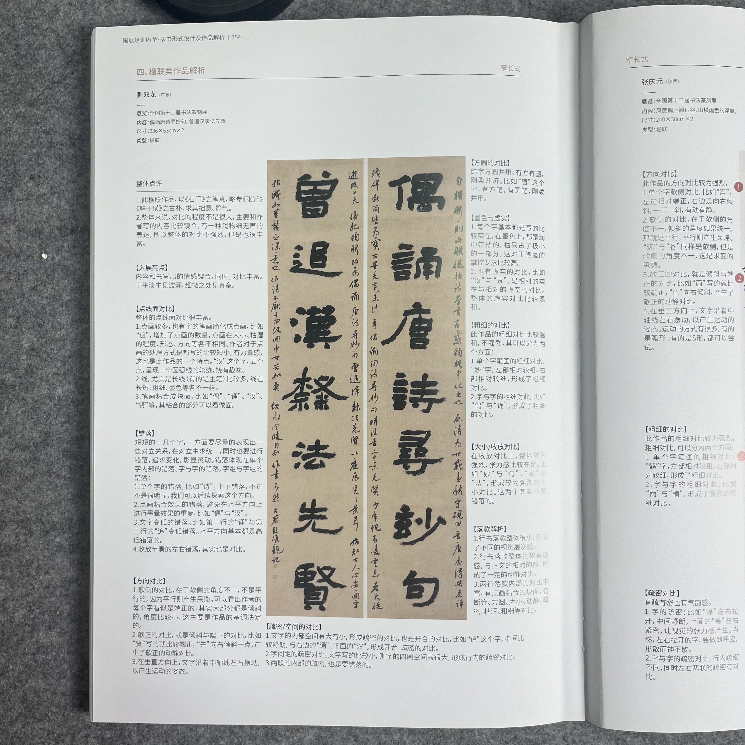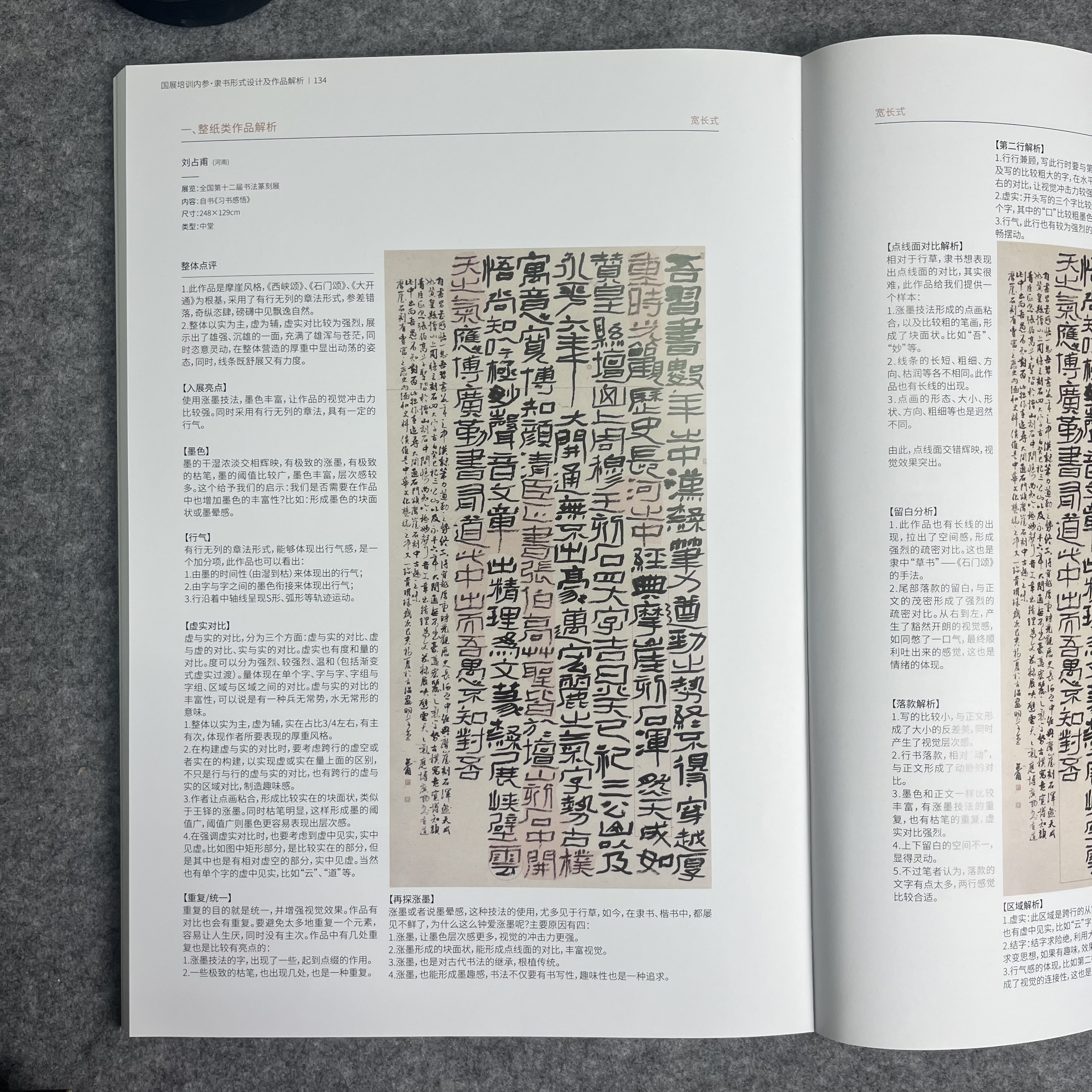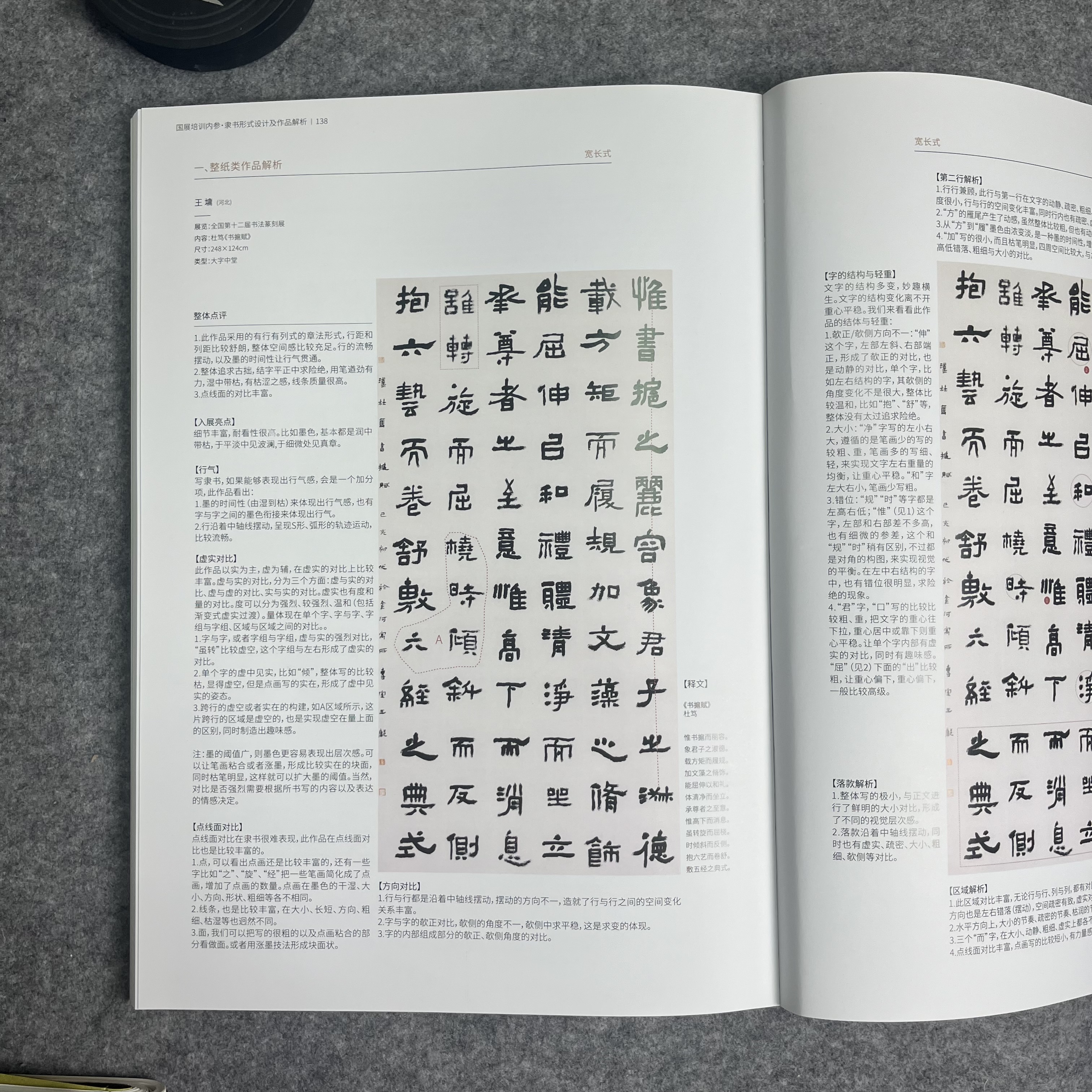 《国展内参-隶书形式设计及作品解析》国展培训内部资料,从理论,到形式,再到作品的详细分析,让你知其然,知其所以然。大八开,155页。A. 本书提供最全的形式设计,解决形式设计烦恼。 B. 从西方美学和东方美学的角度重新解读国展作品。从章法,留白,墨色,虚实等角度对作品进行详细分析,特别提到了16种对比技法,匠心之作。 C. 本书目录: 一.理论篇(西方美学解读国展作品) 1.留白的运用 2.对比技法:点线面,虚实,长短,宽窄,空间,颜色,疏密,方圆,轻重,断连,收放,方向,动静,粗细,枯润,大小等对比。 3.重复与统一/4.色彩/5.对称/6.平衡/7.黄金分割/8.比例/9.错落/10层次/11错落/12情绪等 二. 形式设计 八大形式与改版 三. 作品解读